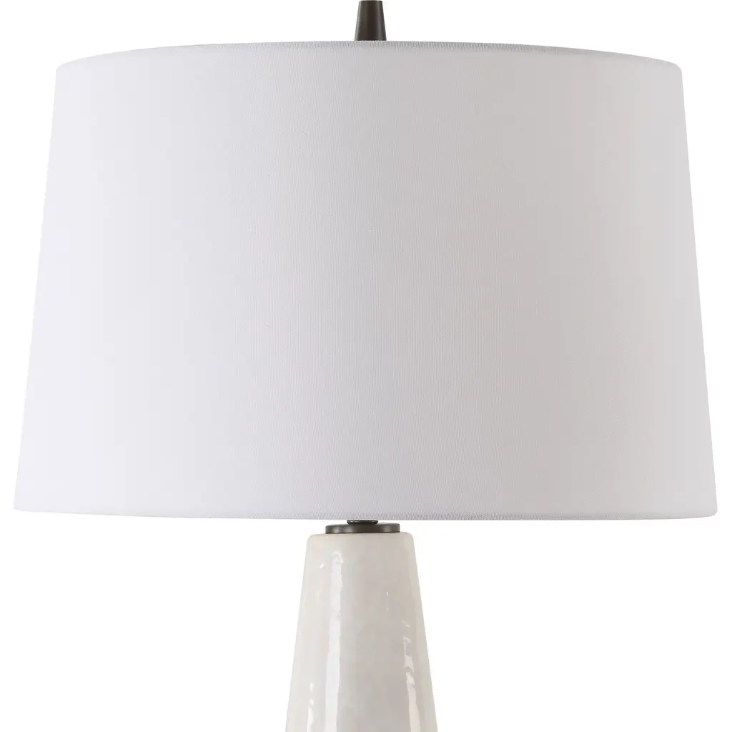 Simple Yet Versatile, This Ceramic Table Lamp Features A Cream-ivory Drip Glaze With Subtle Texture, Accented With Matte Black Details. The Lamp Is Paired With A Tapered Round Hardback Shade In A Crisp White Linen Fabric.
