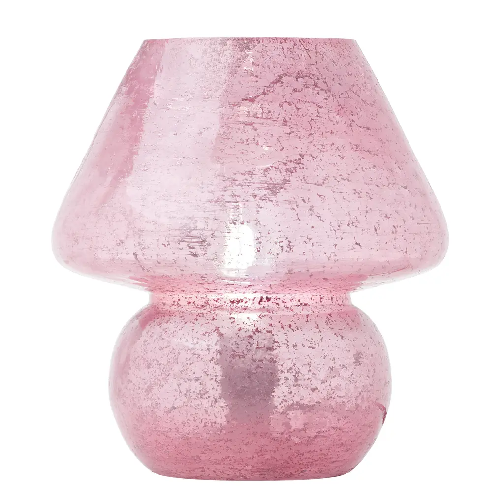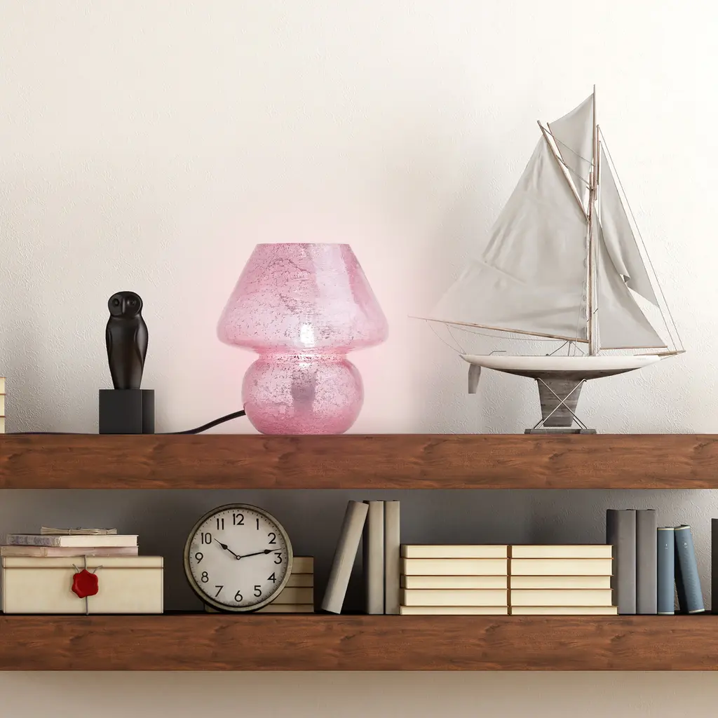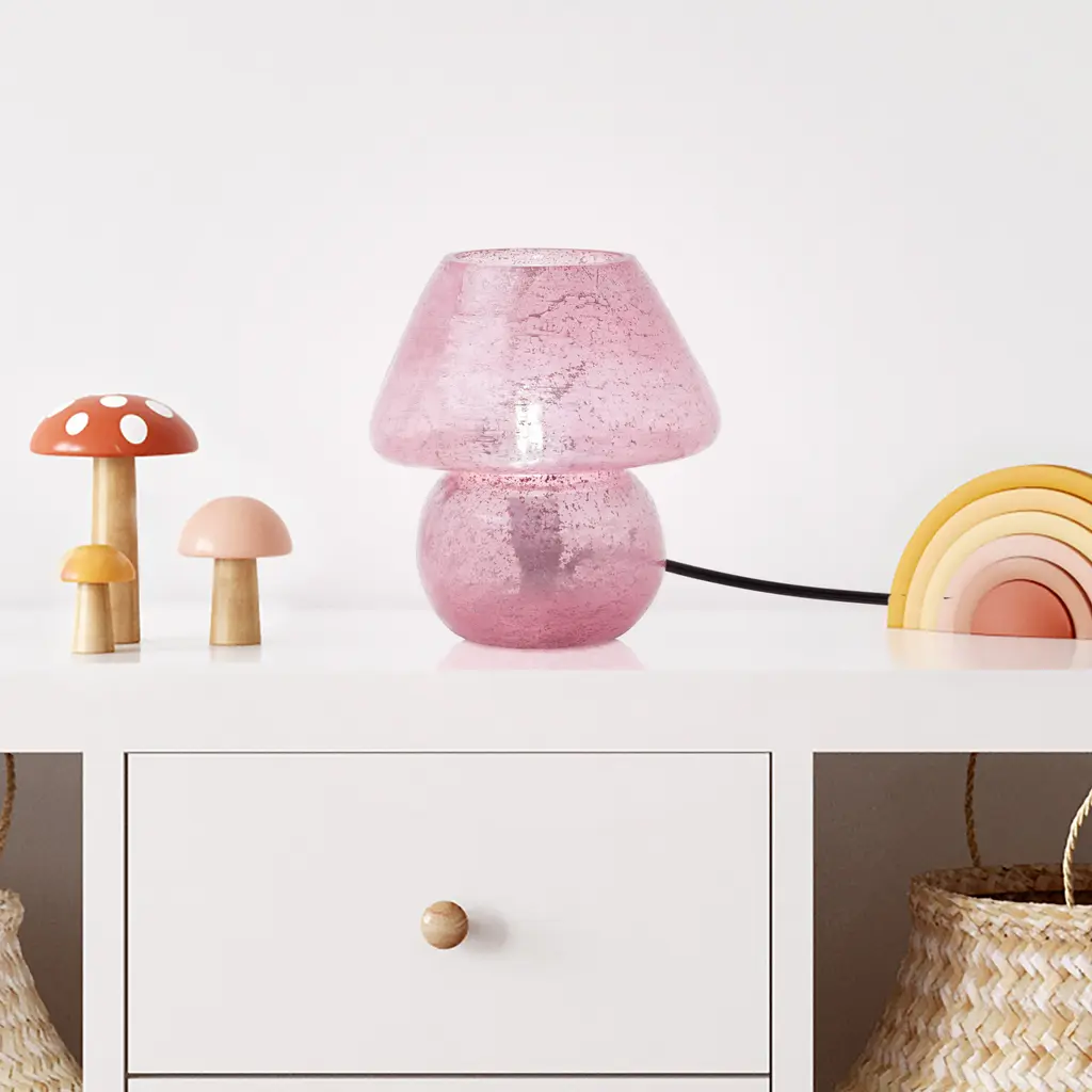 Embrace a touch of bohemian charm with this pink mushroom lamp. The lamp's whimsical design is crafted from glass with a textured pink finish, reflecting light in a multi-directional pattern for a warm and inviting ambiance. The handcrafted nature ensures a unique piece that elevates your bedside or living room setup. The soft pink color adds a pop of personality, perfect for those seeking a playful yet elegant addition to their decor. This accent lamp requires one E12 type B bulb, providing ambient light to any room.