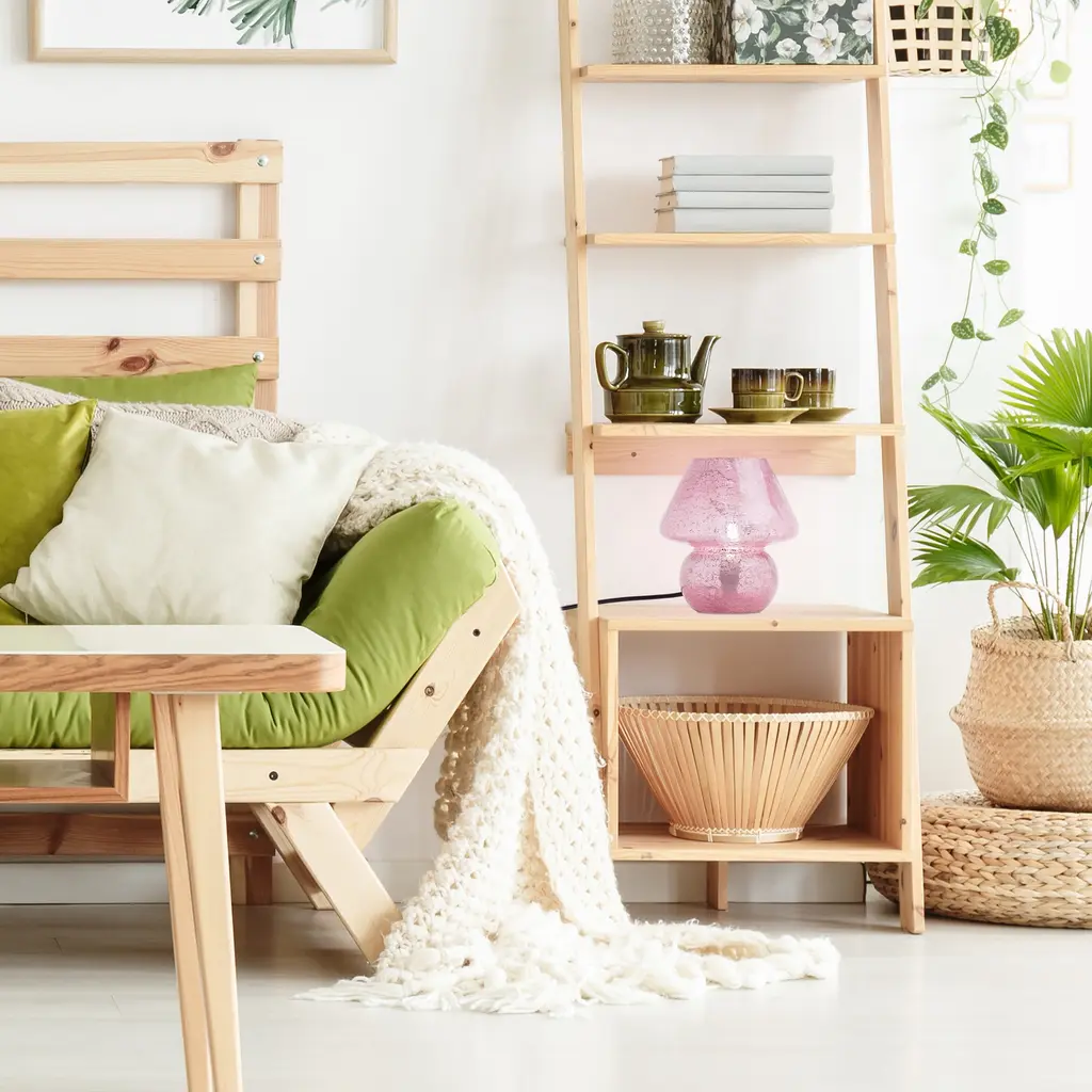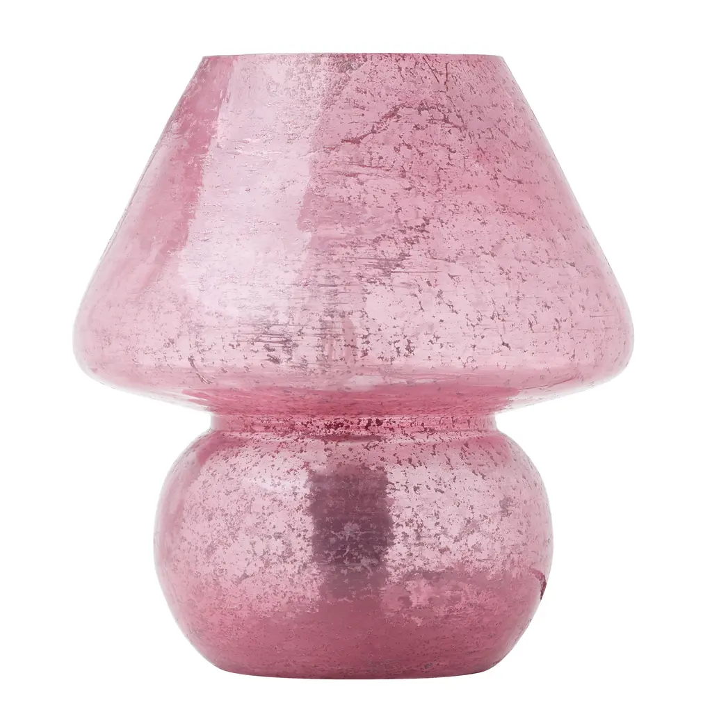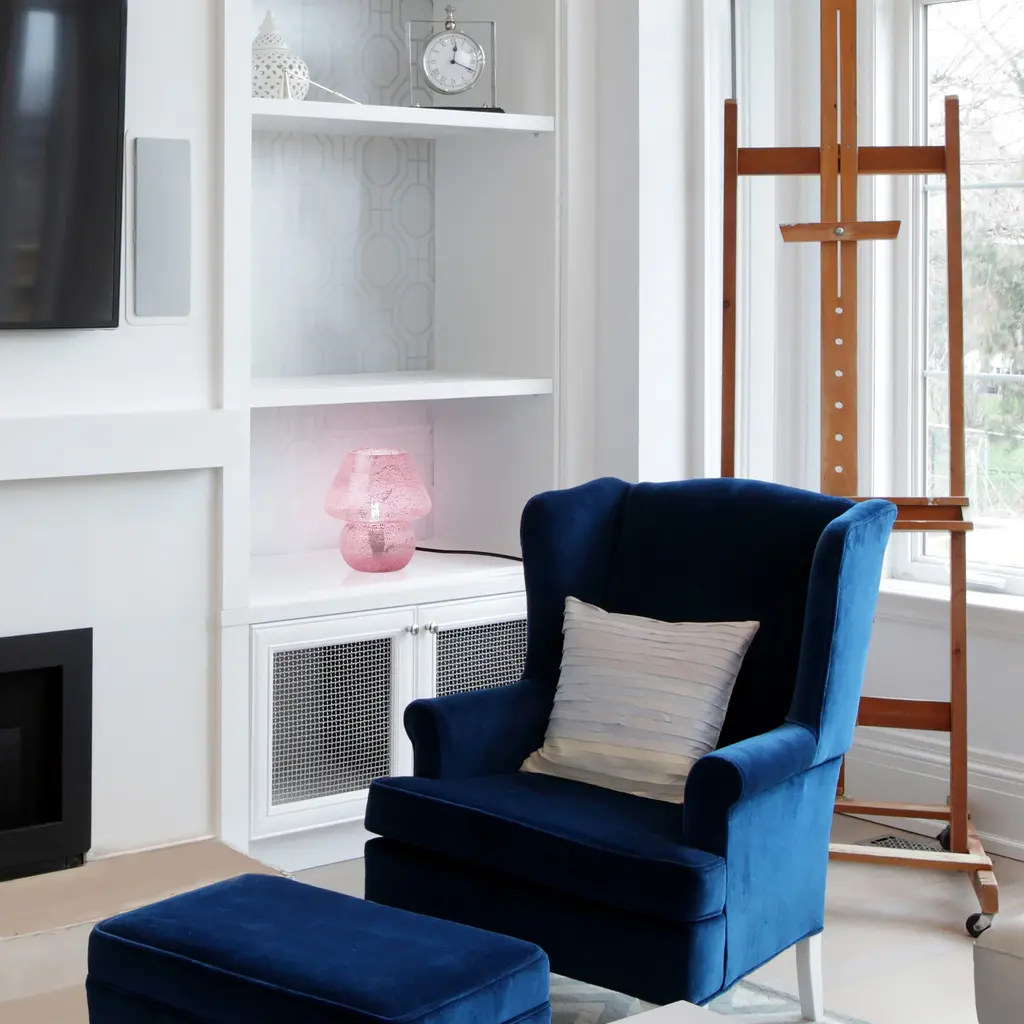 Embrace a touch of bohemian charm with this pink mushroom lamp. The lamp's whimsical design is crafted from glass with a textured pink finish, reflecting light in a multi-directional pattern for a warm and inviting ambiance. The handcrafted nature ensures a unique piece that elevates your bedside or living room setup. The soft pink color adds a pop of personality, perfect for those seeking a playful yet elegant addition to their decor. This accent lamp requires one E12 type B bulb, providing ambient light to any room.