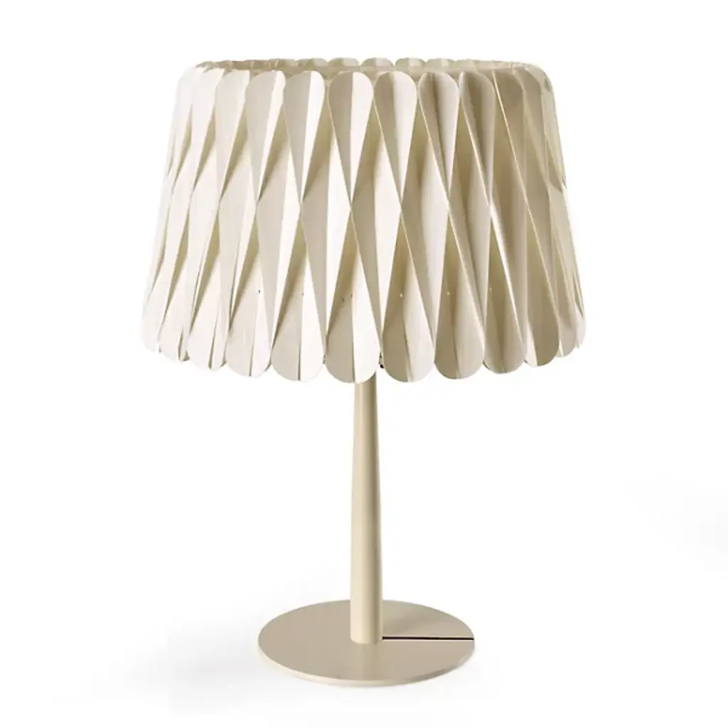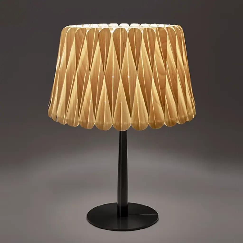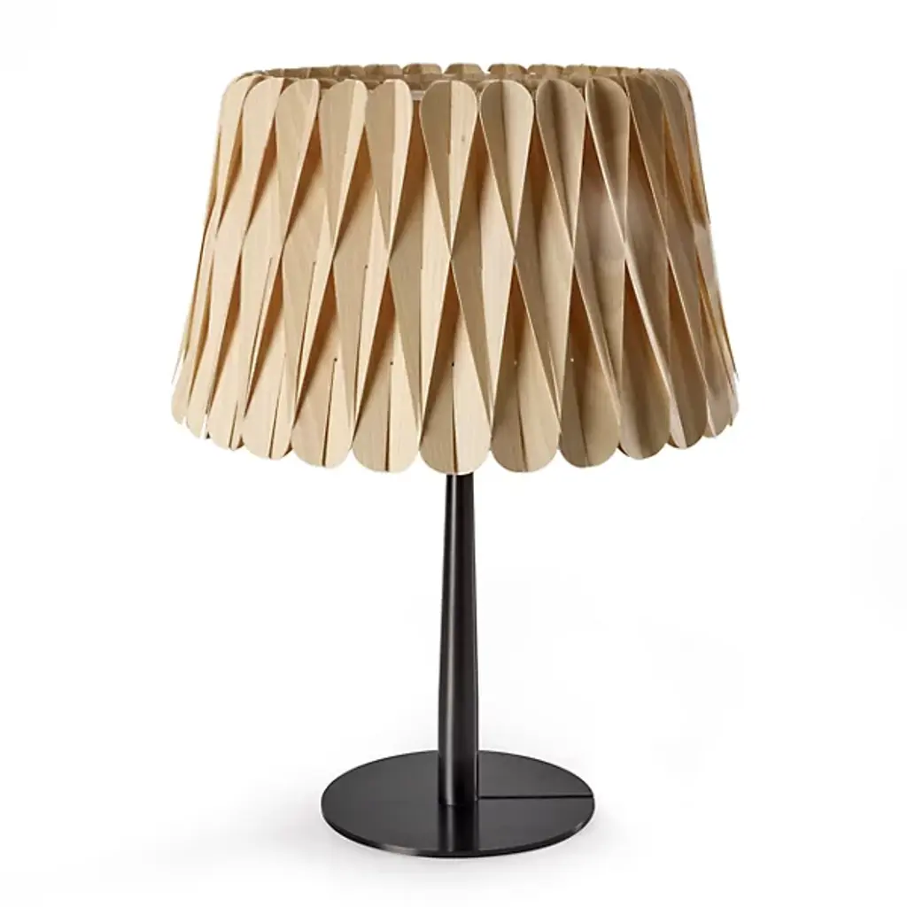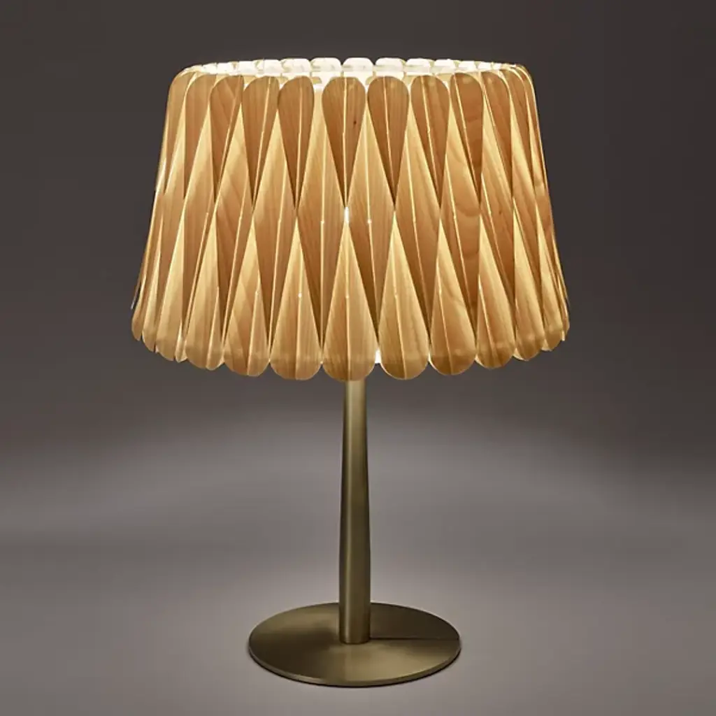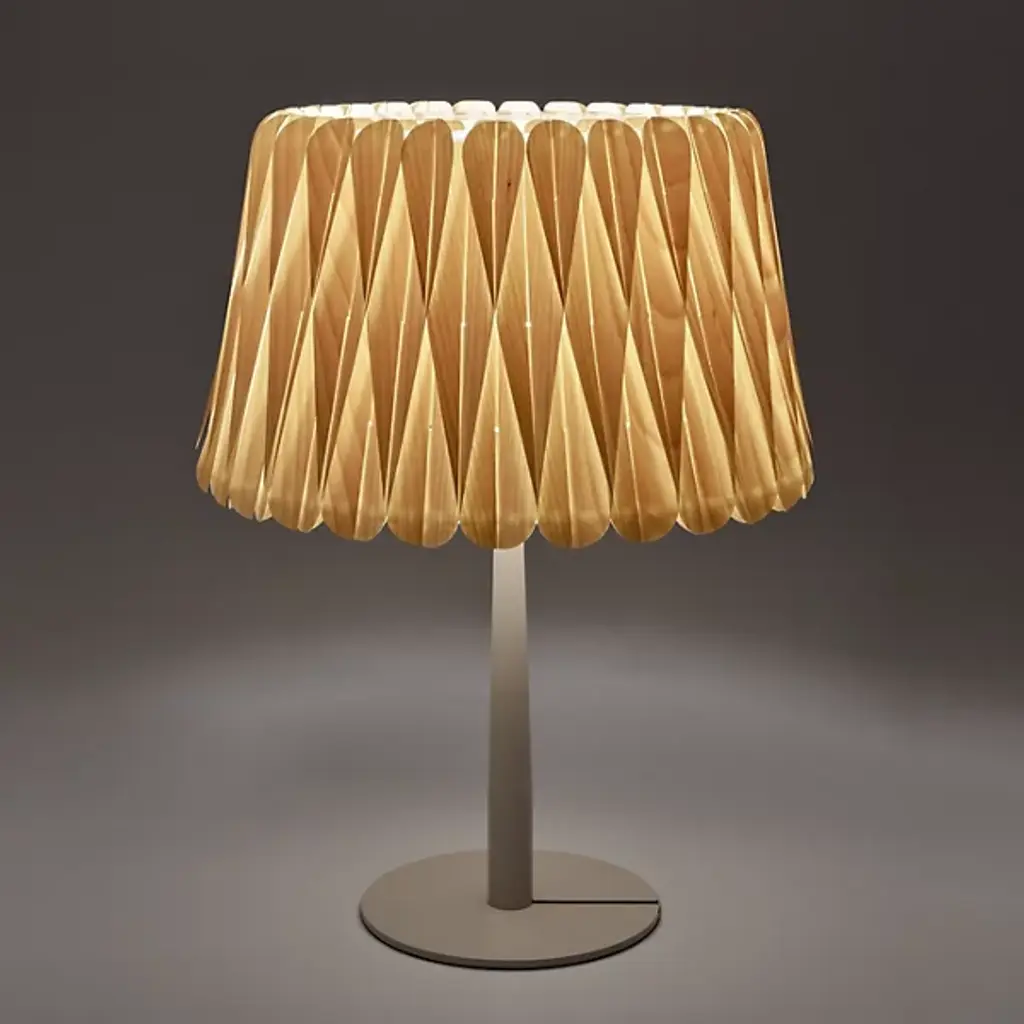 A light and lacy look, made out of wood. The delicate intricacies that can be achieved with wood veneer are displayed to perfection in the design of the Lola Table Lamp by LZF. Thin slices of Wood Veneer are woven together in such a way that the shade looks like it's made out of folded paper or fabric. (Clear plastic rings provide support and strength at the top and bottom of the shade.) The detailed pattern that results is especially eye-catching when the lamp is illuminated. The Metal base is simple, so as not to distract from the sexy shade.