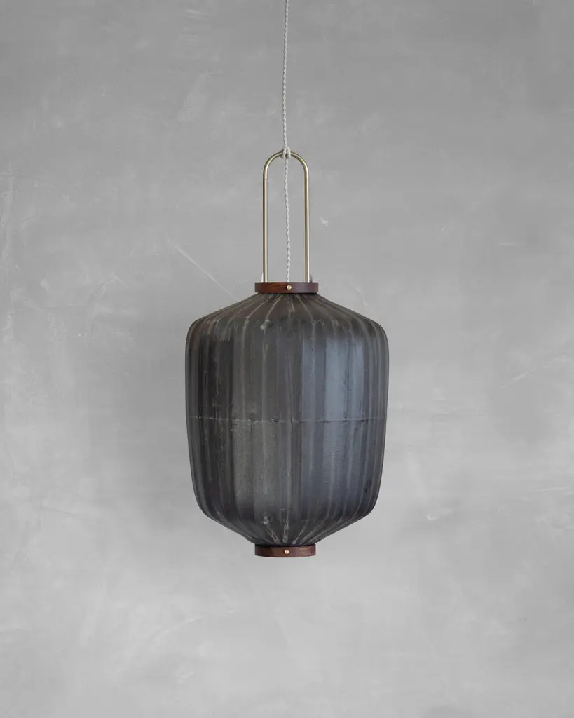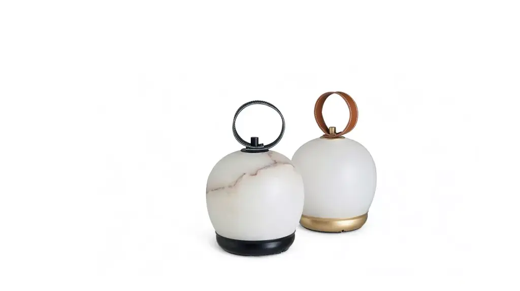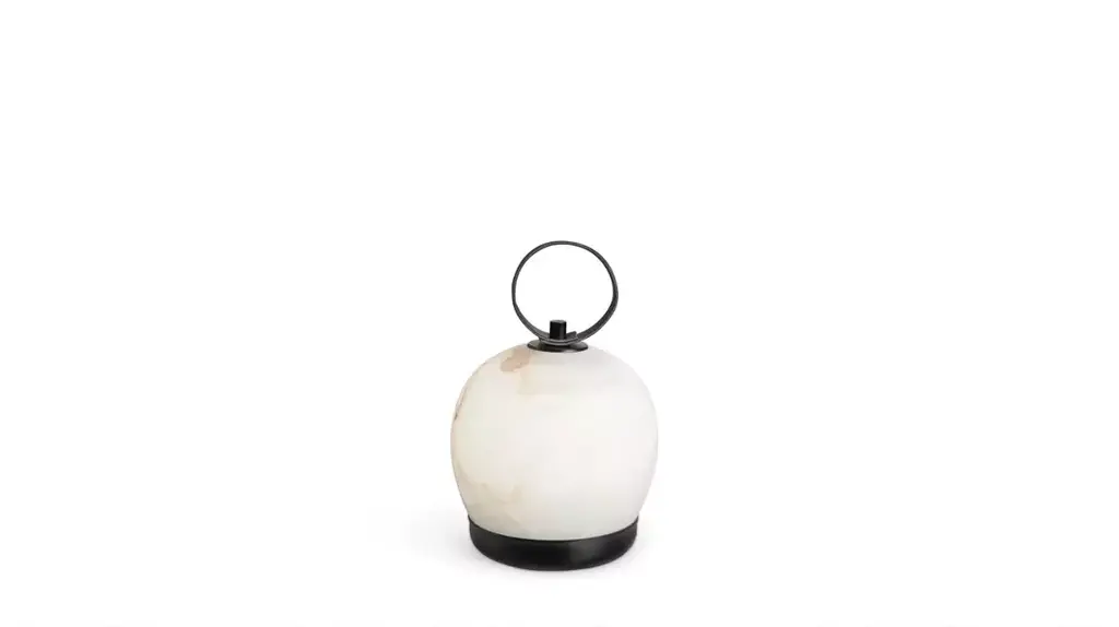Indoor/outdoor hand lamp with alabaster diffuser, black-finish metal base and black outdoor leatherette handle. Made in Europe. Light source: integrated LED 500 lumens, 3000°K. Remote control with dimmer switch (four light levels). Battery life: 10h at 50% and 5h at 100% - charging cable (jack and USB) included. IP65 PROTECTION.
