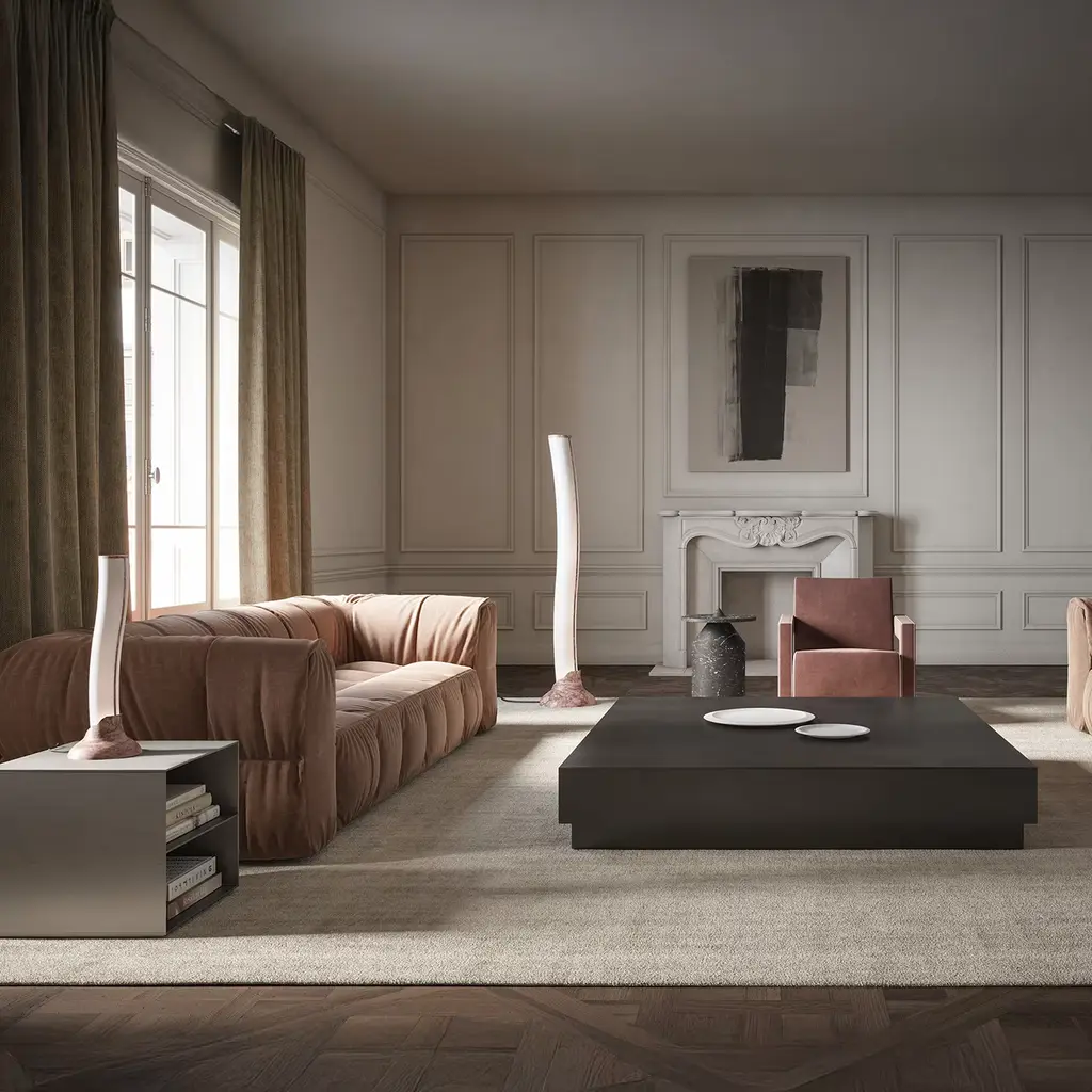 This precious table lamp boasts an evocative design inspired by the frail beauty of coral reefs. Fior di Pesco Carnico marble - distinguished by striking veining blending red and peachy shades - is used to craft the elegant base and the thin stripe marking the profile of the tubular diffuser in white Michelangelo marble. The light source radiating through the marble will produce a charming marine ambiance. UL and CE certified, this table lamp is delivered without a power supply or dimmer switch. Please note that marbles and stones are natural materials and they can differ also if coming from the same quarry or the same block. The product shown may differ from purchased items. Every piece is unique.