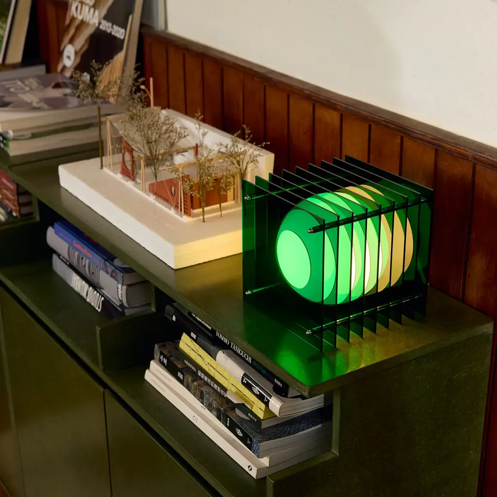 Mesmerizing and futuristic, the Layers Table Lamp brings moody light and color into your space. Composed of nine acrylic sheets and a glass globe shade, the Layers Table Lamp was conceived by Thomas Vincent, creative director and designer for the Vietnam-based brand BằNG. The Layers Table Lamp measures 7h x 7w x 7.7"d. Powered by standard plug-in. Requires one E26 G45 LED bulb (included). To change the lightbulb: 1. Unplug the lamp and place it on a surface.2. Secure the opal glass sphere with one hand, unscrewthe lamp-holder with the other hand.3. Replace the old bulb with a new E26 G45 LED bulb.4. Screw the lamp-holder back in place. Do not screw it in overly tight.5. Plug-in the lamp and turn it on.