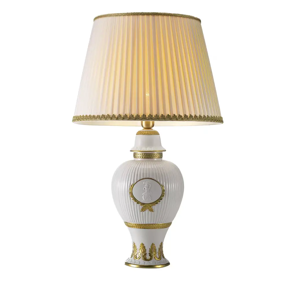 Lora table lamp two lights in brass with decorated ceramic elements. Oval lampshade included.The Classic collection includes ceramic and terracotta table lamps with traditional shapes and rich and elegant decorations, skilfully combined with fabric lampshades. A unique style reminiscent of that of Tuscan villas, known throughout the world for their innate beauty.2 x E14Max 28 Watt – Tot. 56 Watt230 VoltsClasse I, Class I
