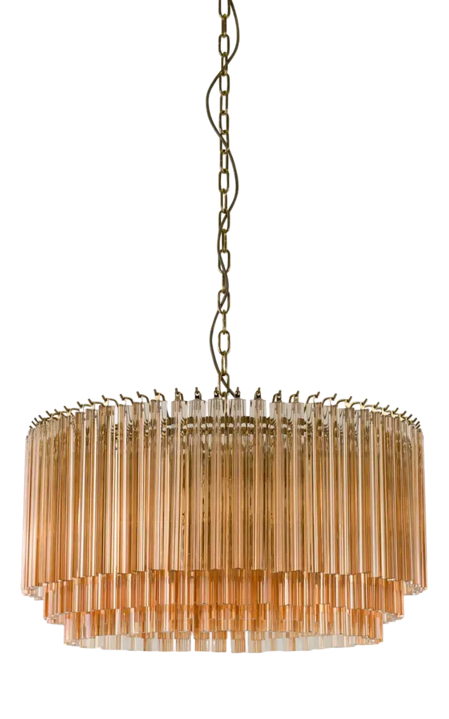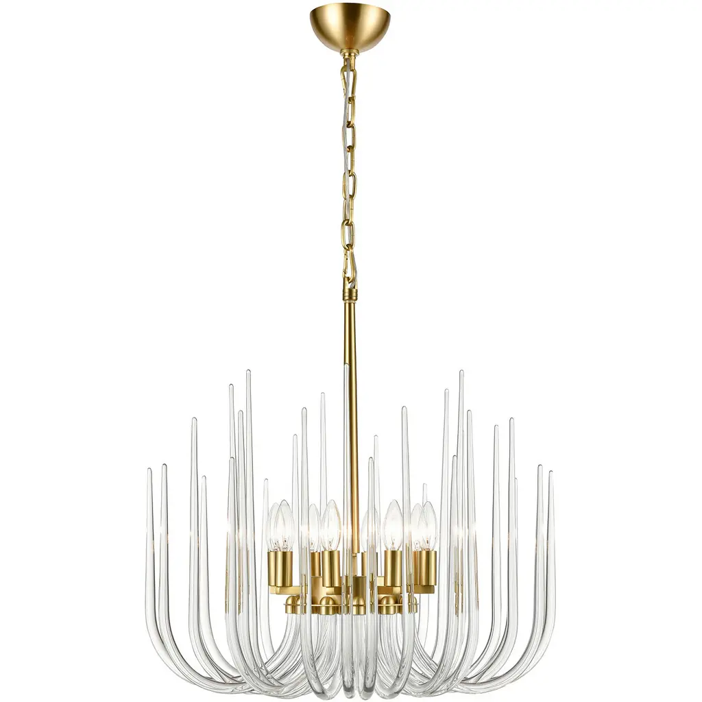 A layered fixture with vintage charm. The Lorelei Petite Waterfall Chandelier from Visual Comfort Signature, formerly known as Visual Comfort, enhances its surroundings with a pleasing glow, extending down from a sleek disc canopy via a robust chain, using a ring finial and short stem to seat a stylish splay of damp-listed candelabra-style lamping below. Two tiers of angular metal arms extend fluted shades of cleared glass with flared ends down around the lamping from each arm, transforming direct glare into a warm layer of light below.