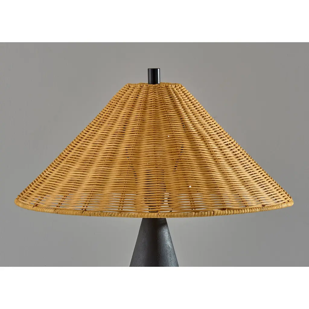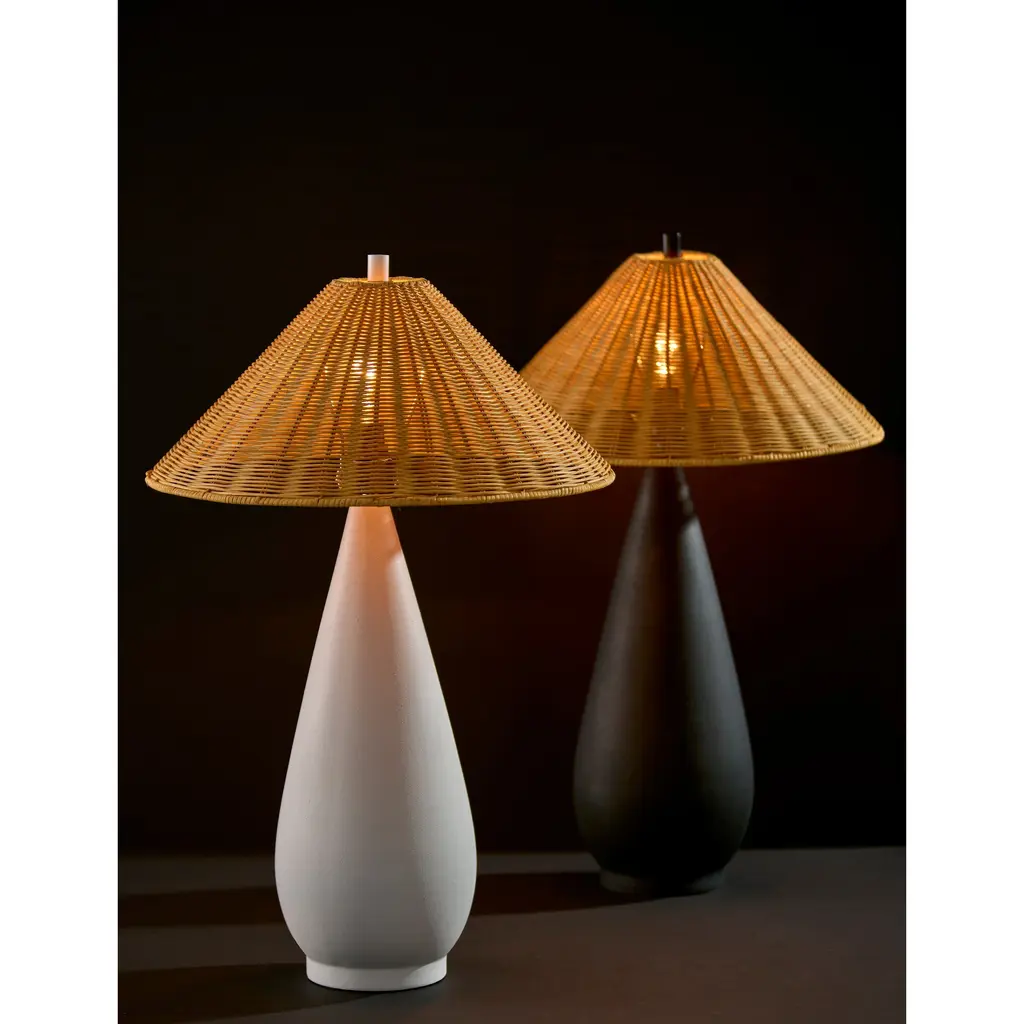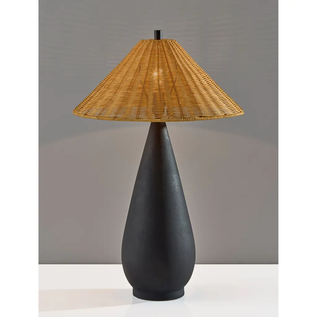 Introducing the 9405-01 Lorelei Table Lamp, a beautiful fusion of modern design and natural texture. Featuring a teardrop-shaped rough-finished black ceramic base, this lamp brings a bold yet refined touch to your decor. The tapered brown rattan shade complements the base with its texture, creating a warm and inviting glow. Standing at 28 inches tall, the Lorelei Table Lamp is ideal for enhancing living rooms, bedrooms, or entryways. Equipped with a 100W on/off rotary socket switch, it provides both functionality and stylish lighting. Bold design: Teardrop-shaped rough-finished black ceramic base adds a sleek yet rustic touch. Warmth: Tapered brown rattan shade offers a natural, earthy texture and soft lighting. Ideal height: At 28 inches tall, it fits perfectly in living rooms, bedrooms, or entryways. Convenient operation: 100W on/off rotary socket switch for easy and practical lighting control. Versatile style: Blends natural materials with modern design, complementing a variety of decor themes.