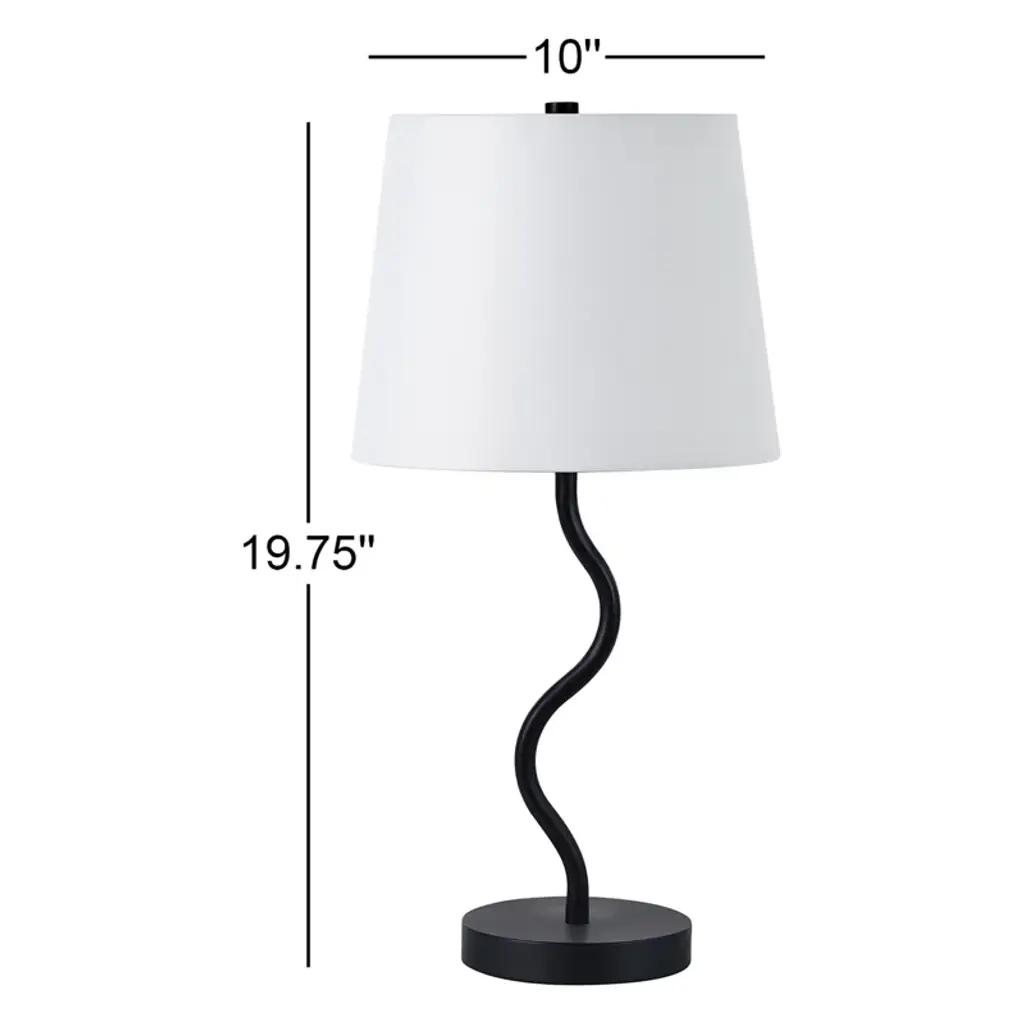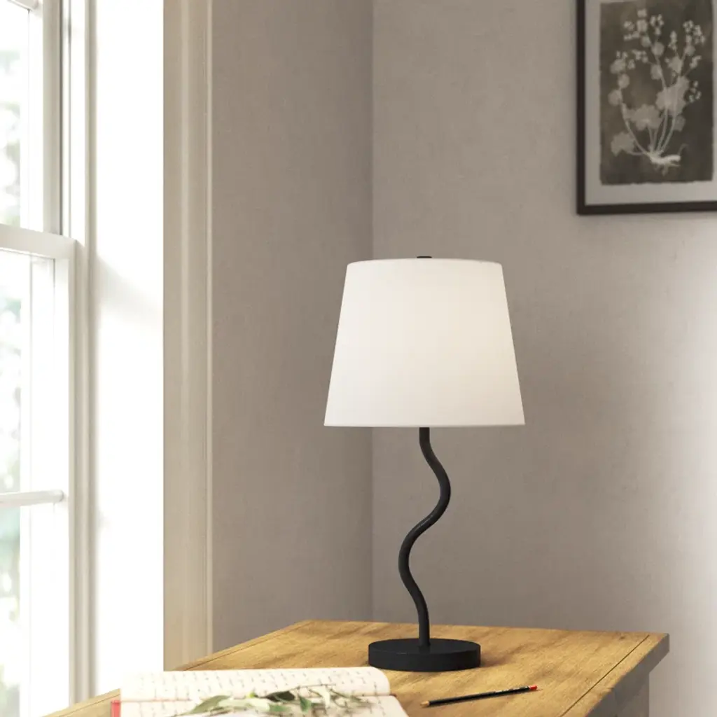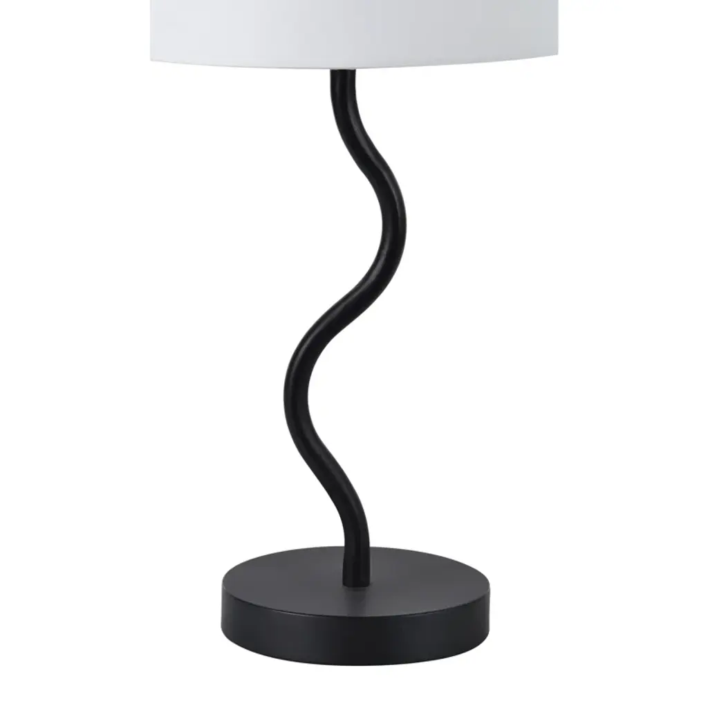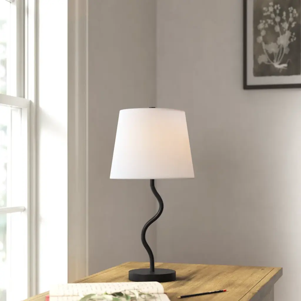 A juxtaposition of playfulness and poise, this lamp design holds an entirely unique structure that always catches the eye. The matte black powder-coated iron base has an inherent charm, and care of its swirling structure, while the cotton shade adds practical polish to the top. Its neutral palette allows it to work with many room styles.