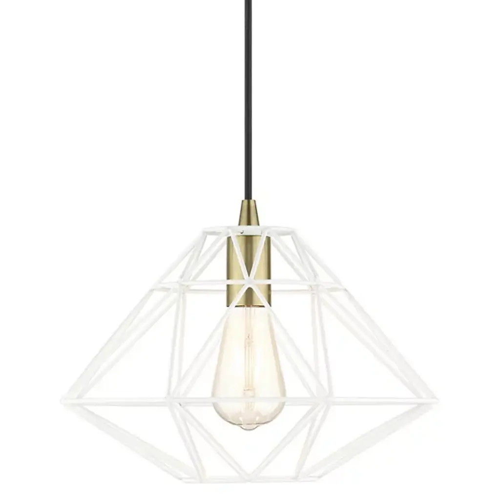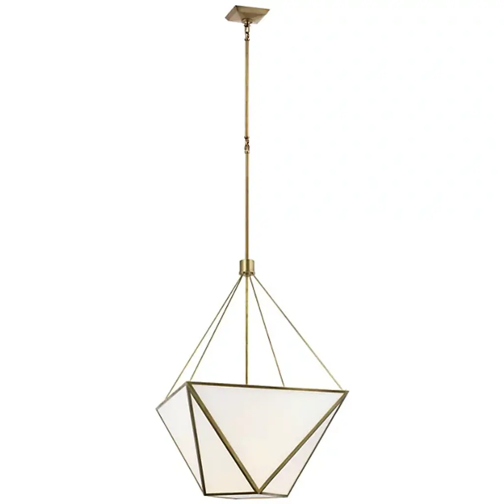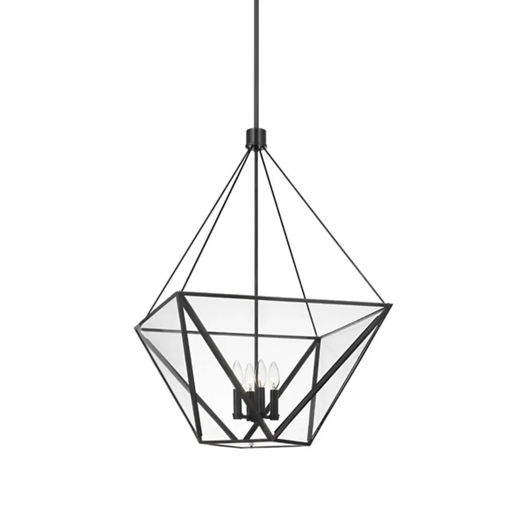Elegant, airy, and appealingly sculptural. The Lorino Chandelier from Visual Comfort Signature, formerly known as Visual Comfort, offers a light and refined accent to inside spaces, extending down from a beveled square canopy via a slender set of linked downrods. This support structure terminates in a cylindrical hub that suspends the fixture’s lamping below, a short chandelier assembled from small candelabra-style lamps gathered around a central hub. A trapezoidal shade of clear glass completed by metal edges is supported by a series of thin metal braces, extending around the lamping, and blunting excess glare into a pleasing, even glow around the fixture.