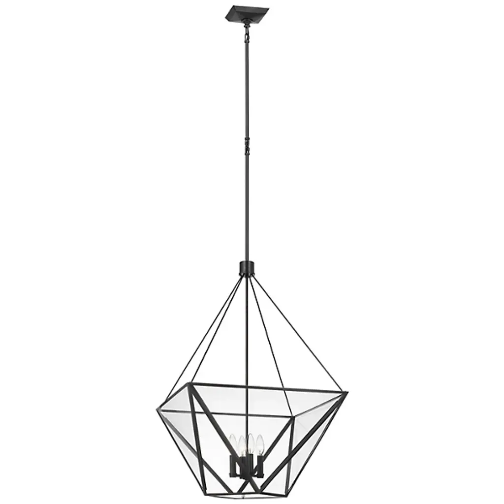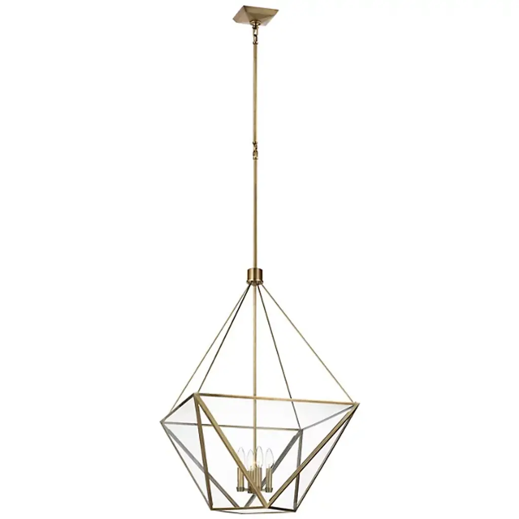 Elegant, airy, and appealingly sculptural. The Lorino Chandelier from Visual Comfort Signature, formerly known as Visual Comfort, offers a light and refined accent to inside spaces, extending down from a beveled square canopy via a slender set of linked downrods. This support structure terminates in a cylindrical hub that suspends the fixture’s lamping below, a short chandelier assembled from small candelabra-style lamps gathered around a central hub. A trapezoidal shade of clear glass completed by metal edges is supported by a series of thin metal braces, extending around the lamping, and blunting excess glare into a pleasing, even glow around the fixture.