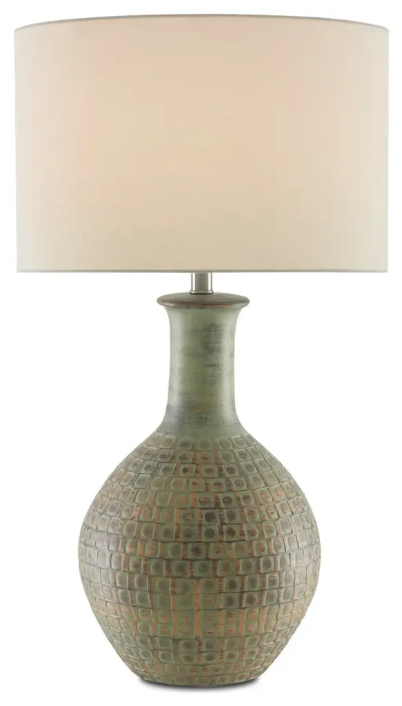 The Loro Table Lamp is made of terracotta with a distressed dark moss green and gold surface. Stamped into the body of the green lamp are artful squares to bring it a textural appeal. The Loro is topped with an ivory shantung shade.Number of Lights: 1Type of Bulb: A StandardBulb Wattage: 150Bulbs Included: No