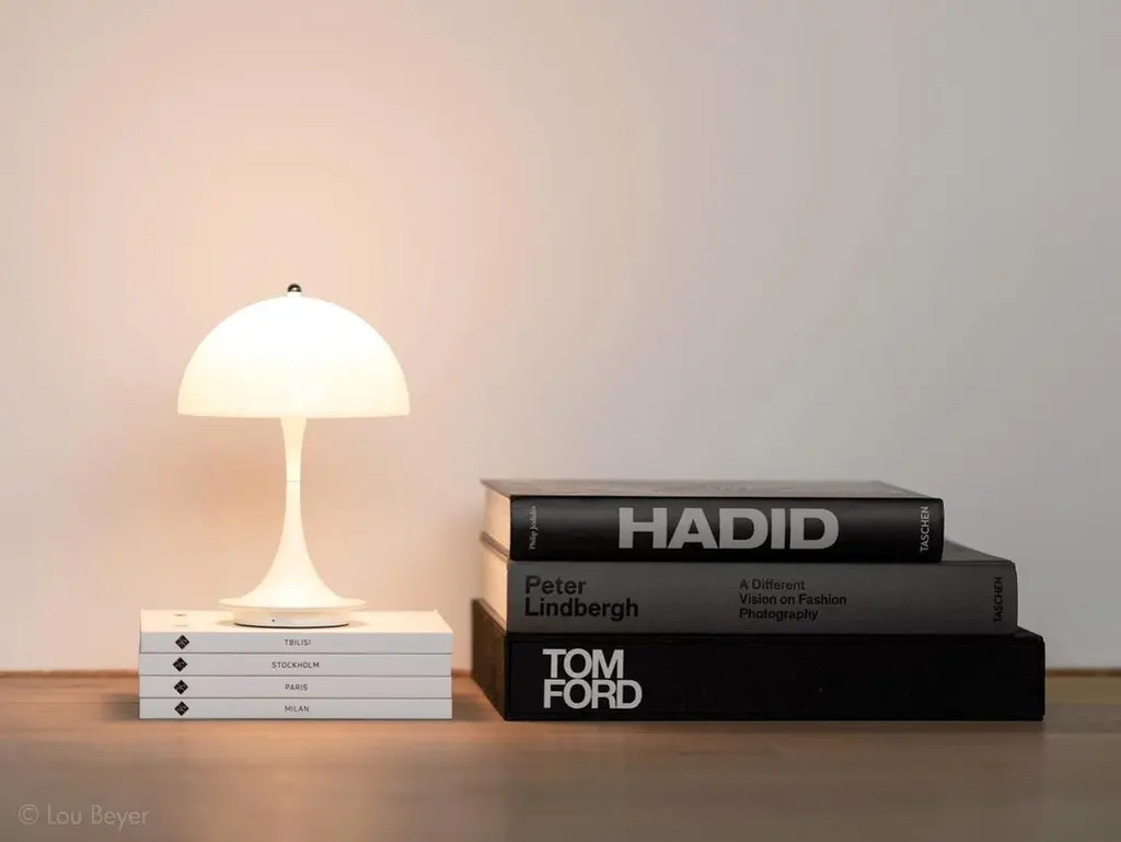 Louis Poulsen, portable table lamp by Verner PantonWidth x Height x Length (mm)160 x 230 x 160, 0.5 kgFinish: White opal acrylic Material: Shade: Injection moulded opal acrylic Base: Die cast aluminium Battery: Li-Ion Cable length: 1.5m. Power: USB cable for standard USB adapter Light control: Switch on base Battery lifetime: 5 hours @ 100% Step-dim: 0%/10%/33%/100% Please note that the Panthella Portable comes with a USB-cable but without an adapter. Separate USB-Adapter is available as accessory. The lamp is fitted with an integrated energy-saving LED light source.