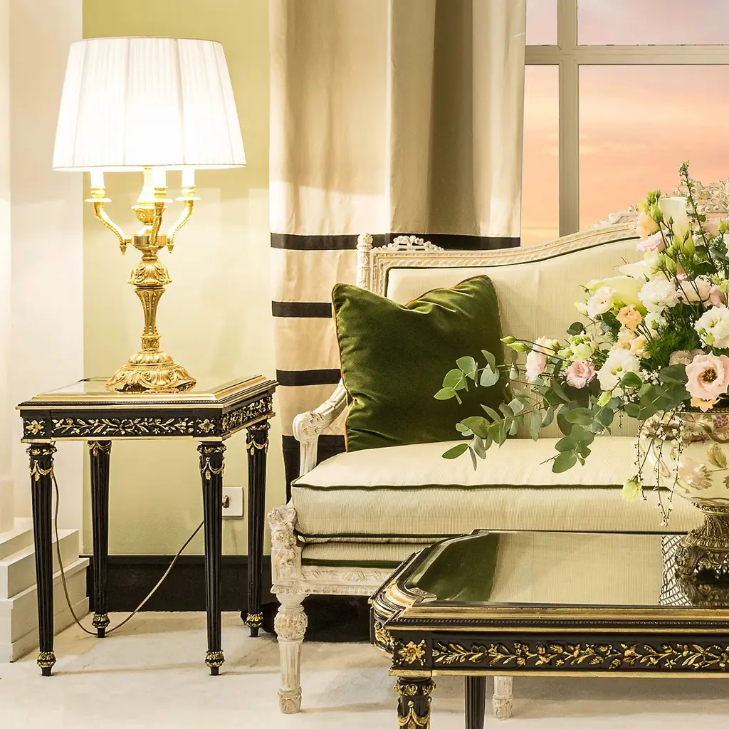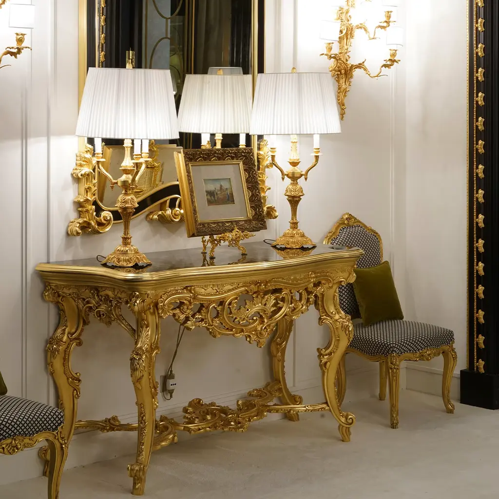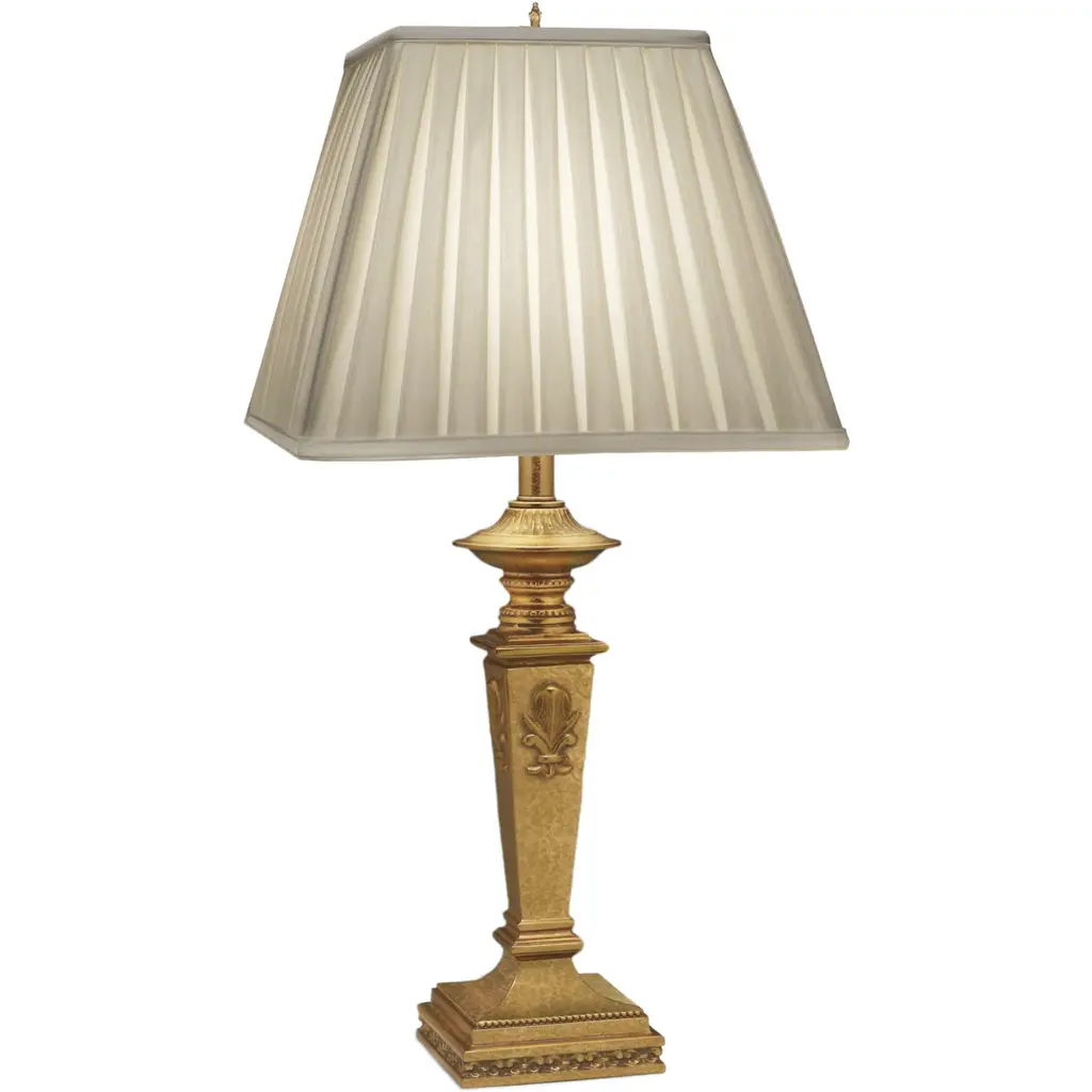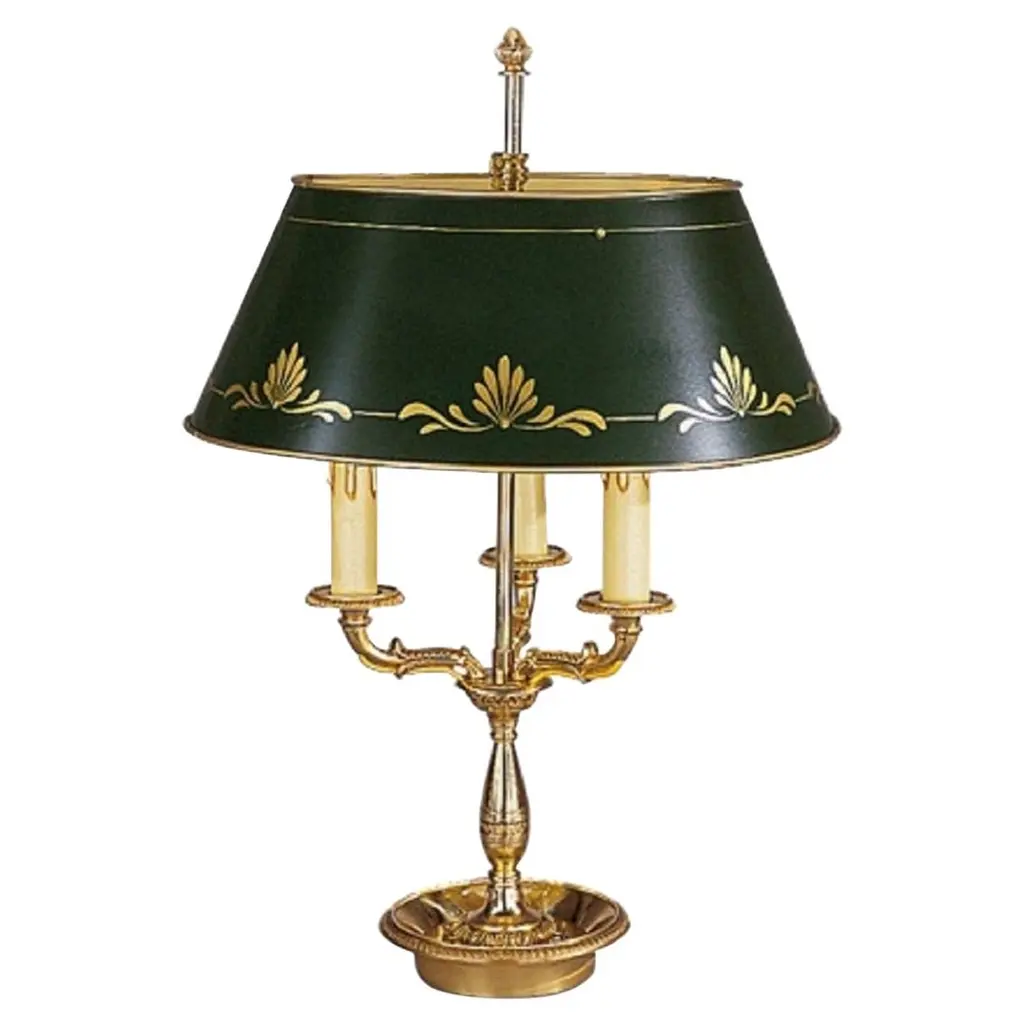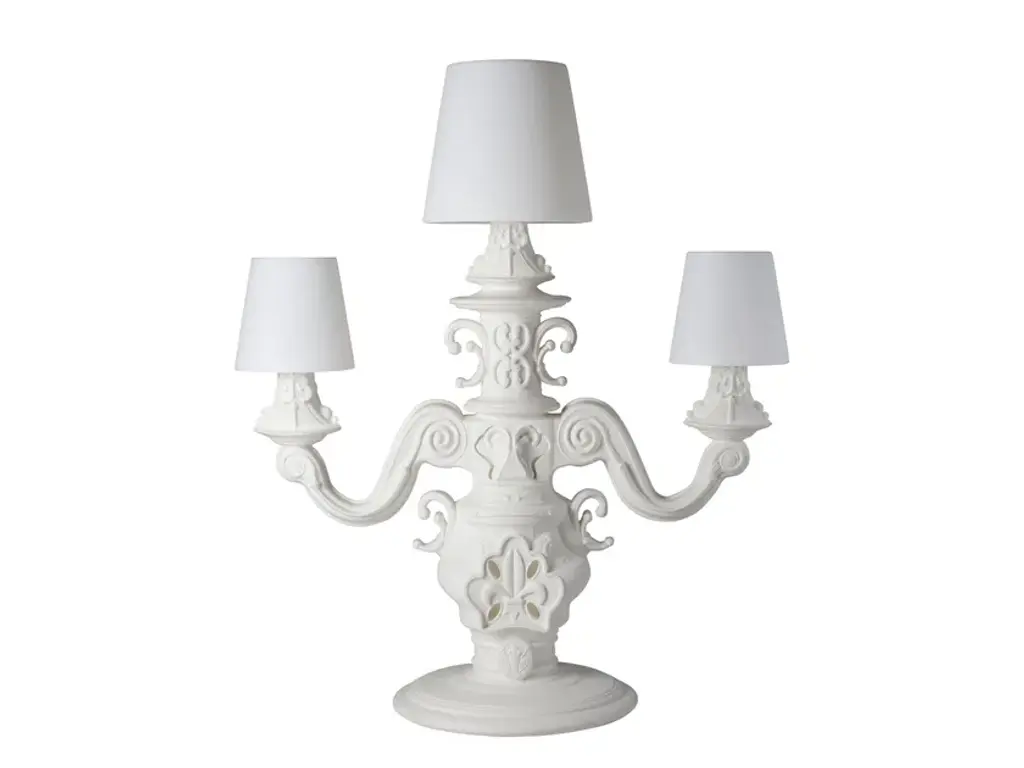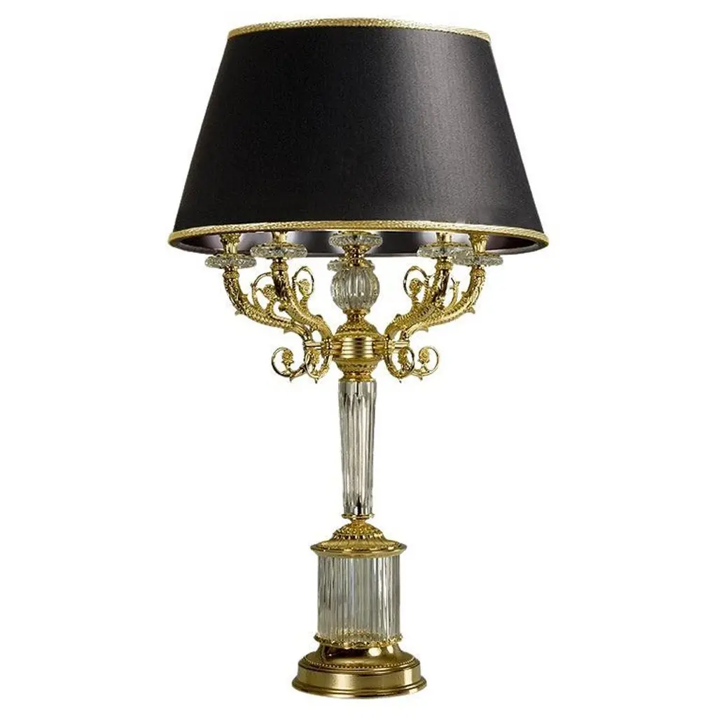 This superb table lamp will infuse classic homes with a dash of extra opulence, hinting at the splendor of the court of Louis XV. A classic cylindrical shade in faux silk enriched with a pleated design diffuses the light flow coming from the three lightbulbs it envelops, glare also accenting the minute, ornate detailing hand-carved from the sinuous structure in 24Kgold-plated bronze.