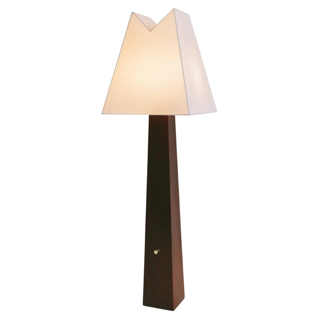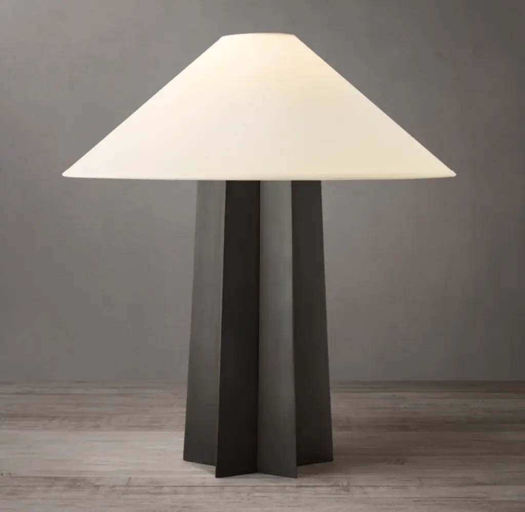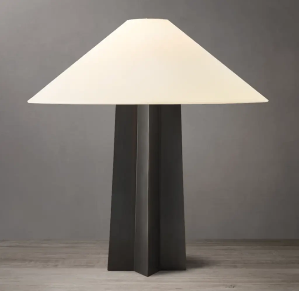 Celebrated California-based designer Ron Mann reimagines his own influential 1970s designs with this striking, boldly scaled geometric lamp. A master of material and proportion, Mann renders the hexagonal base in metal and cast resin with a smooth, matte finish. A gently sloped linen shade casts a soft glow.