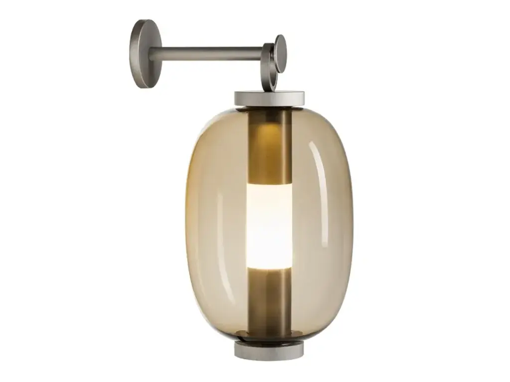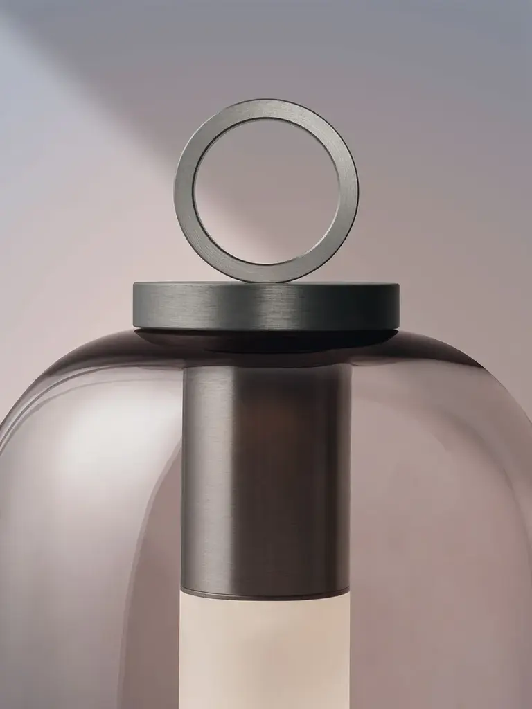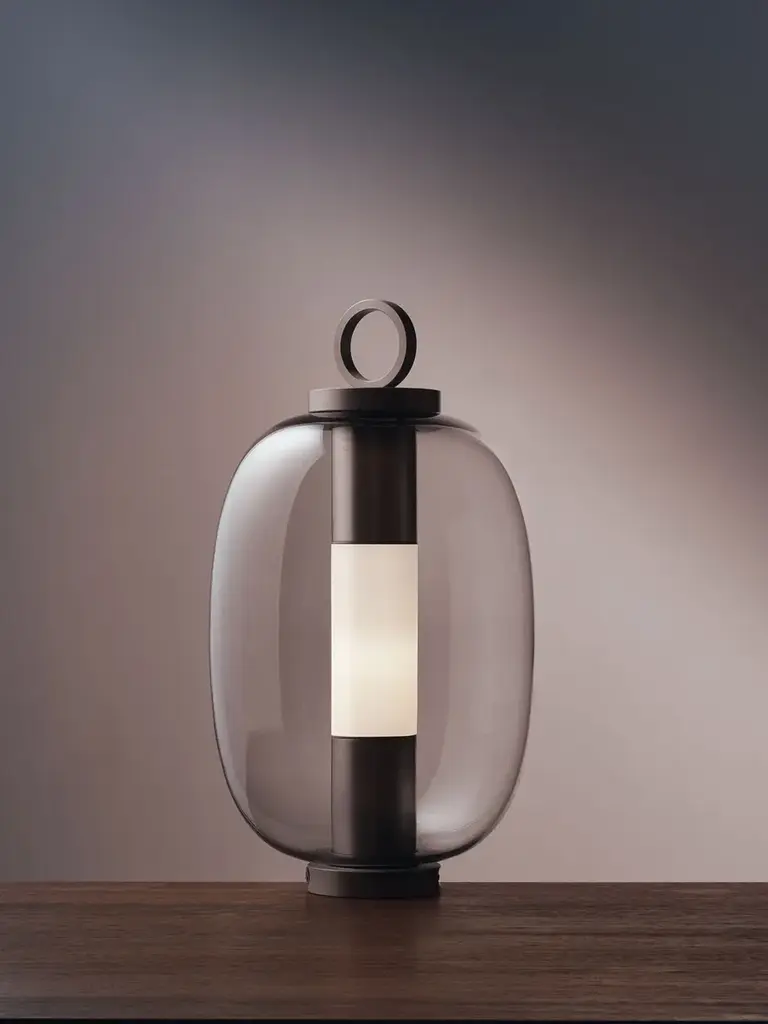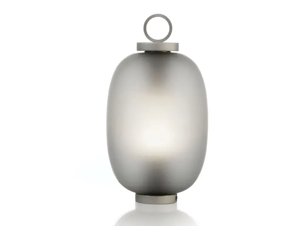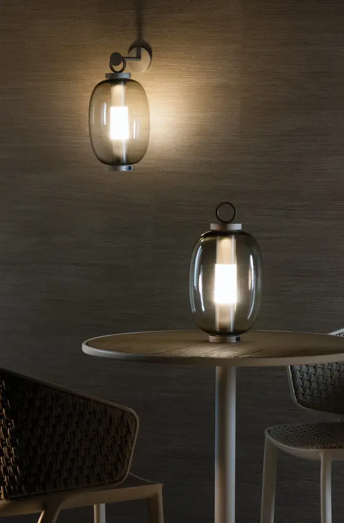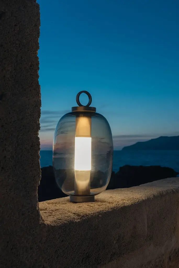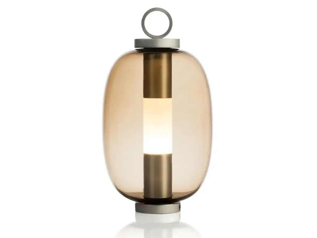 The design experience of Ethimo and the creativity of Luca Nichetto come together and create an unusual, evocative lighting accessory, its sharp, elegant looks conceived to generate new moods in outdoor illumination. LUCERNA is the new portable, rechargeable outdoor lamp from Ethimo. With its perfectly waterproof illuminating body containing LED lights, battery and recharging system, and a blown glass diffuser, Lucerna is a lantern with a contemporaryfeel and ‘nomadic’ spirit. It can be moved about easily and placed on the floor, on a table or hung up, depending on where it is used.A special ring on the top of the lamp acts as a handy grip or decorative hook for hanging from above or on a wall.Lucerna comes in both a portable, rechargeable version with built-in batteries and pull-out cable, and with a fixed power cable. The part in anodised metal can have a brushed steel or brass finish, while the glass is available in three refined, delicate colours: smoky, anthracite grey and amber.Lucerna is an extraordinarily versatile design object, that goes beyond its primary function. Created as an outdoor lighting element, it is also perfect as a decorative article in gardens and patios, thanks to its amazing light effects. The lucerna or oil lamp was the most widespread form of illumination in Roman times, acting as a functional light that was easy to position and move from one room to another, and also used for carrying messages. Lucerna is a modern ‘message carrier’, suggesting a new way of lighting up and enhancing today’s outdoor locations.Lucerna comes in both a portable, rechargeable version with built-in batteries pull-out cable and with a fixed power cable. The led lamp with alluminium illumination body and brown glass.