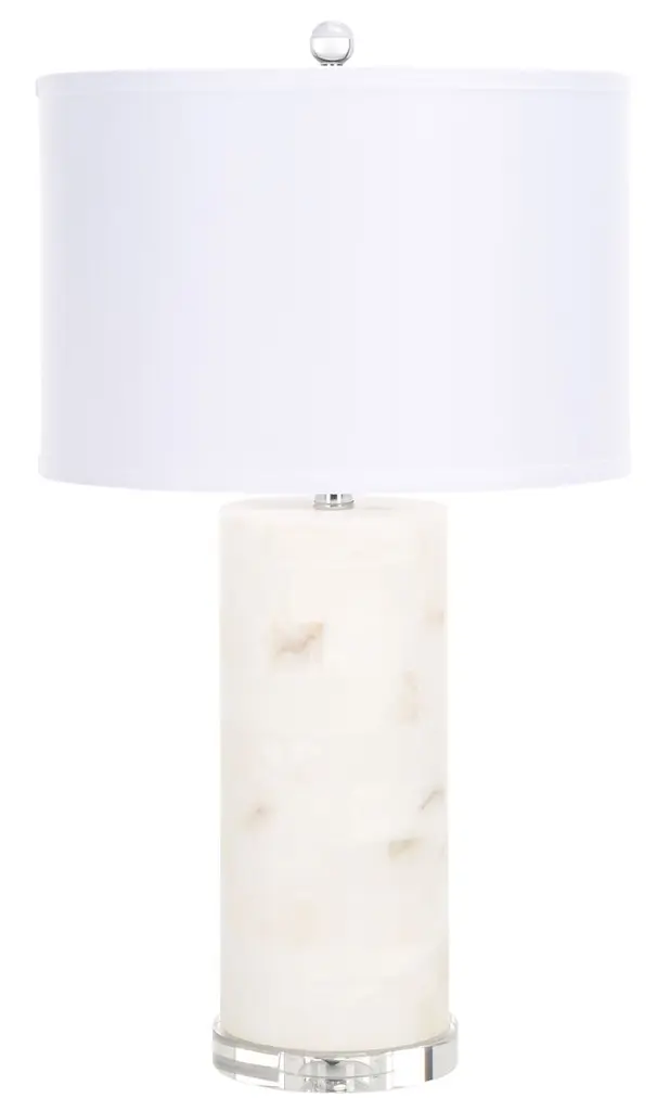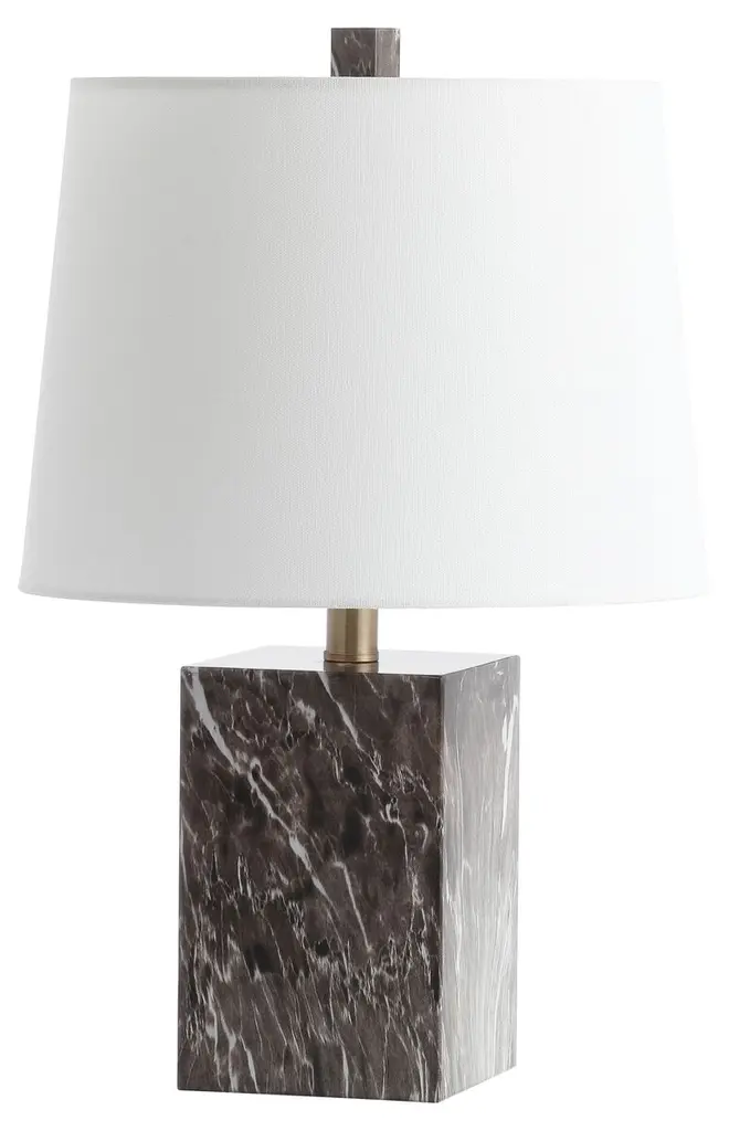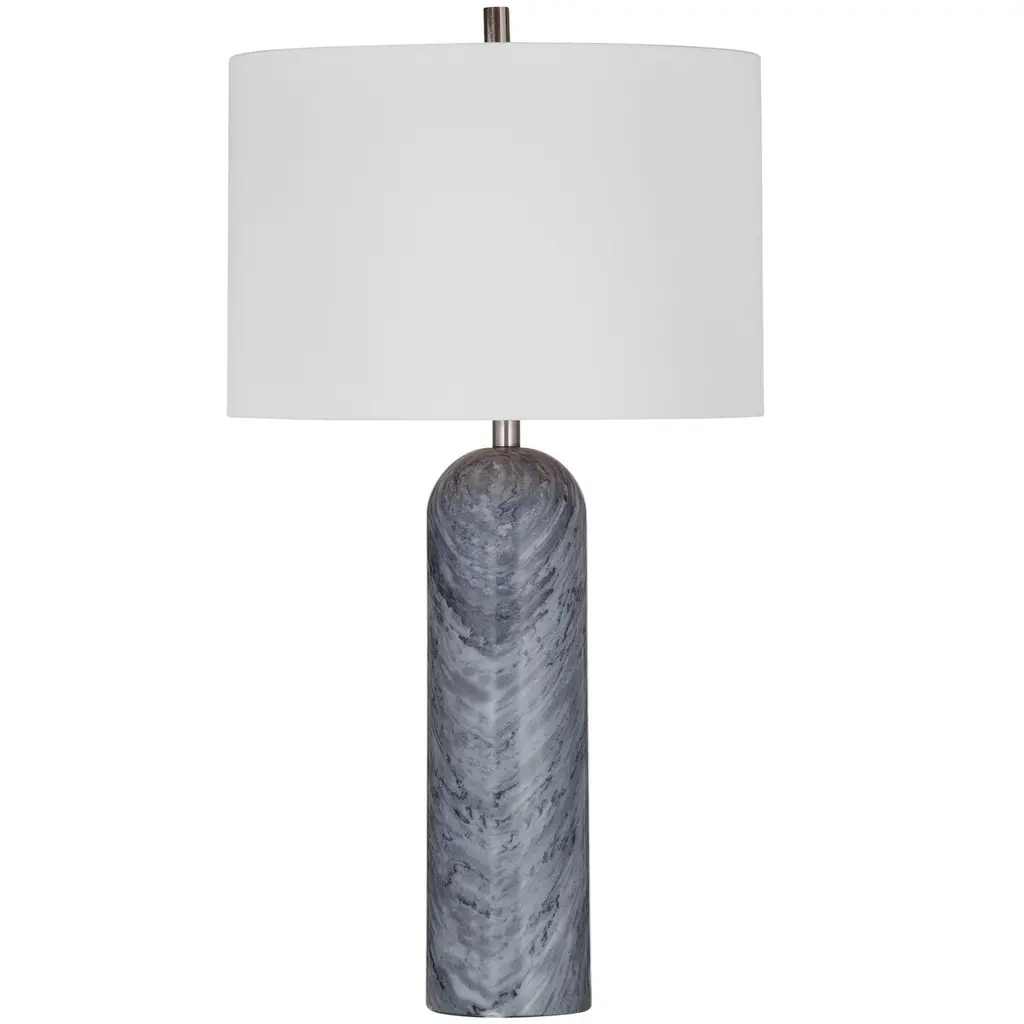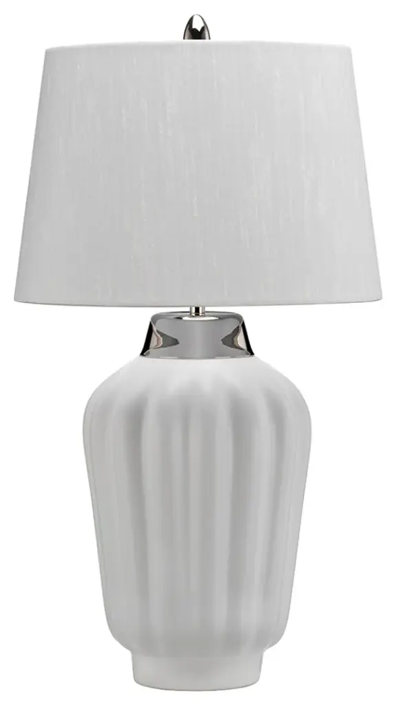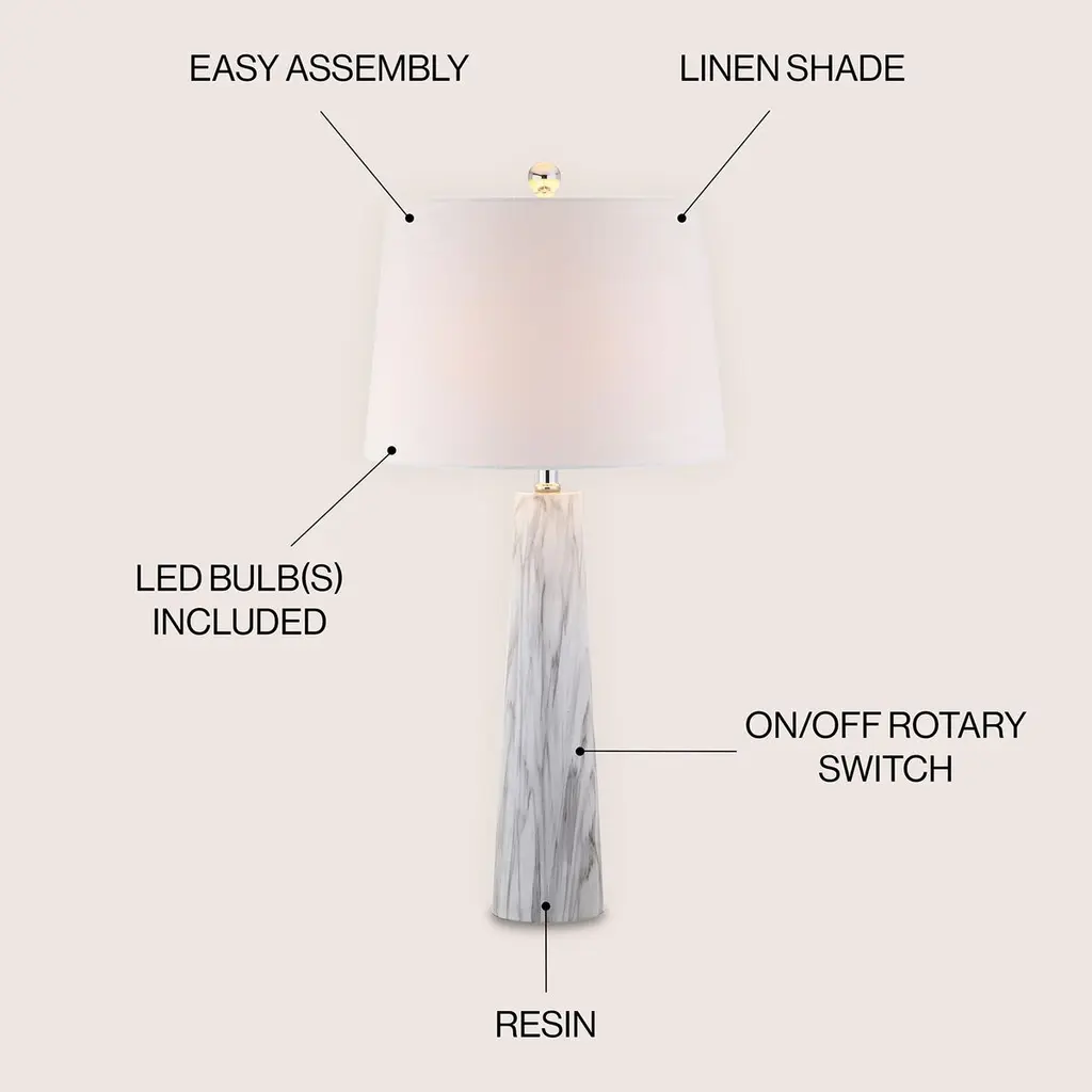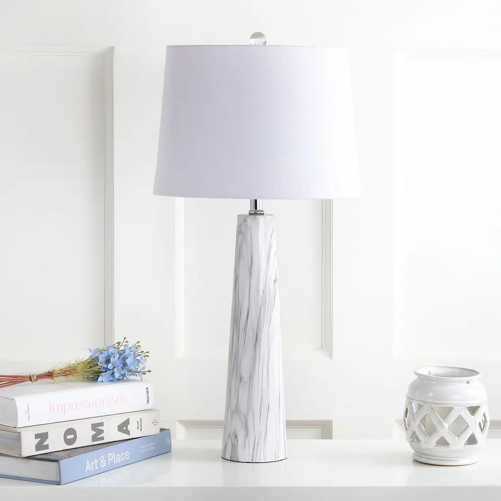 Contemporary charm characterizes the conical base of this modern table lamp. A radiant mix of chromed metal components and white faux marble yields an elegant geometric effect with an artful influence. A chrome finial and linen drum shade complete the look.