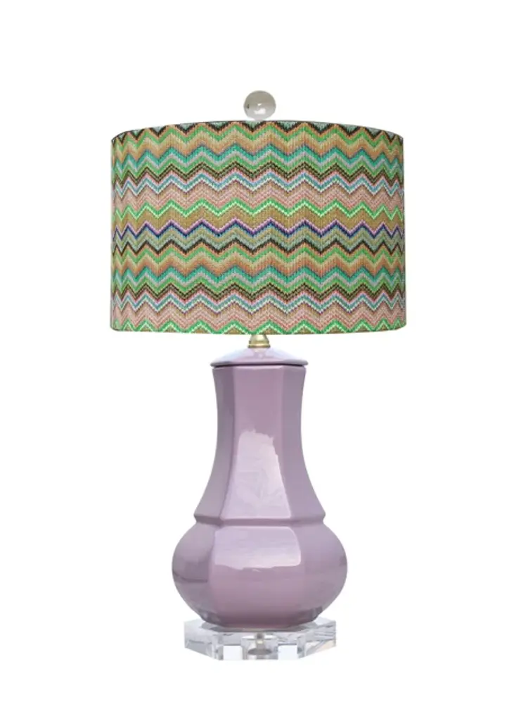 This timeless, lavender porcelain lamp is adorned with luxe crystal base and top. This soft and versatile lamp adds a luxurious, chic touch in any room. Comes topped with a white linen or striped linen shade.