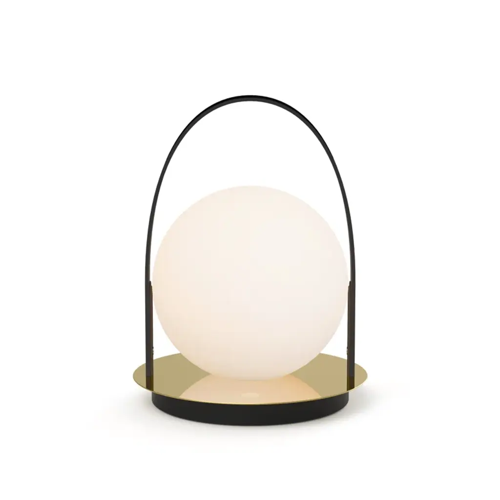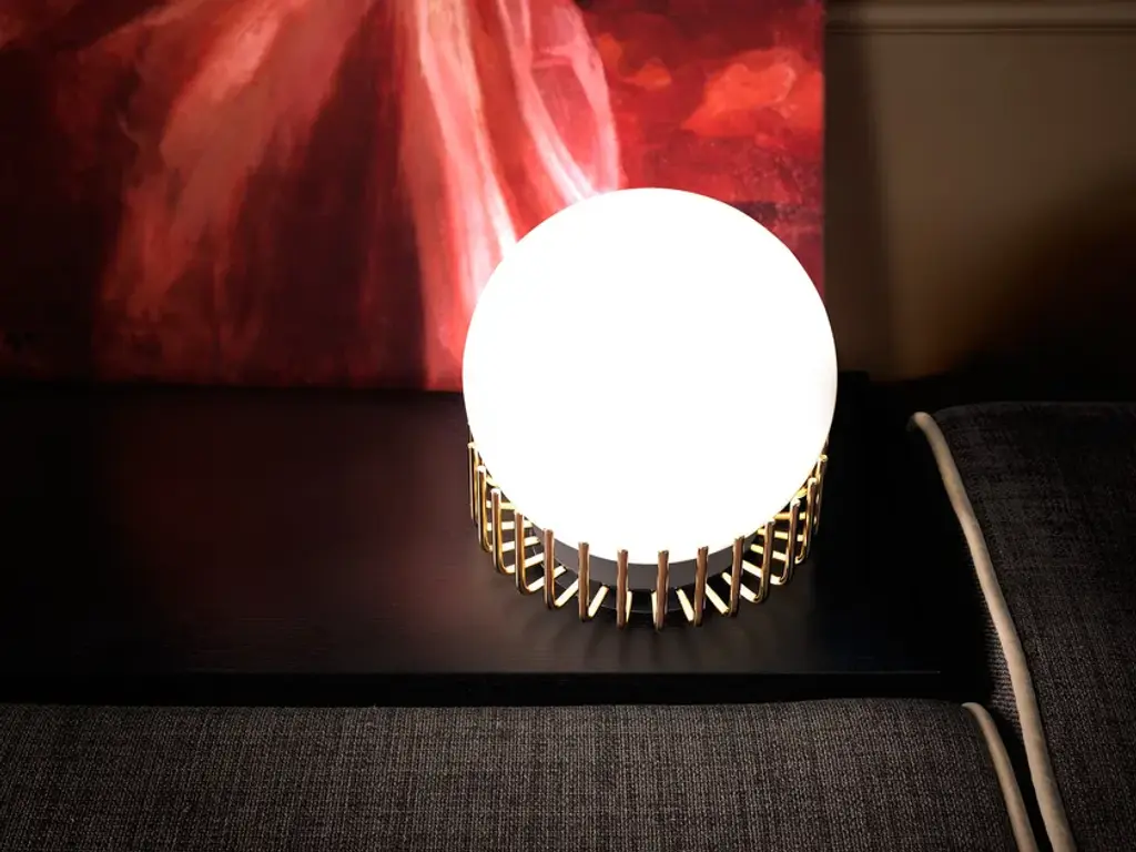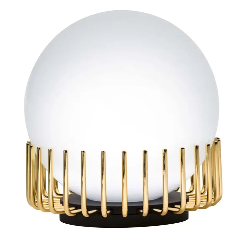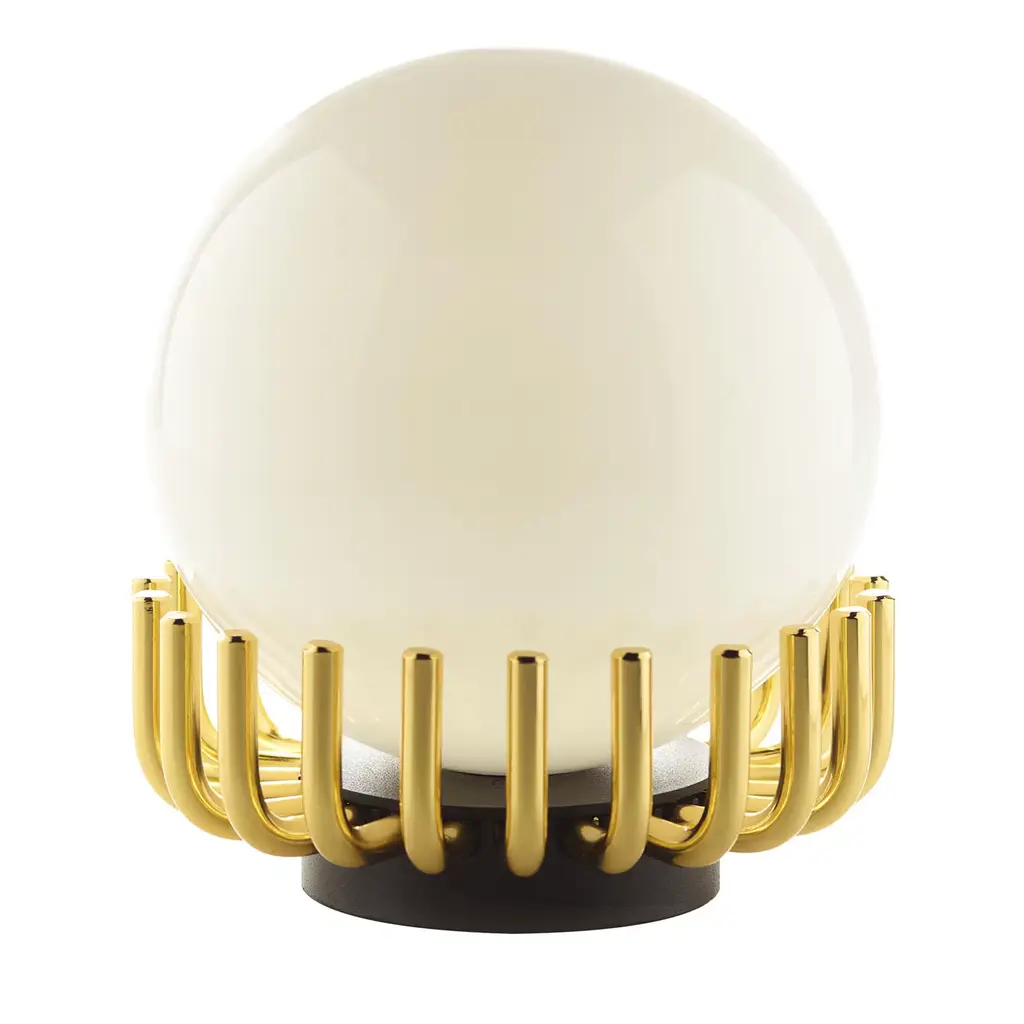 Lucy is a LED metal and opal glass table lamp.Diffused light. Sphere in shiny opaline glass, base in matt black lacquered MDF and metal elements in polished gold finish. Bulb: E27 (LED bulb suggested). CE certified. The soft, delicate light of an elegant opalescent sphere sits with infinite delicacy on a refined golden effect of balanced, graceful proportions: purity of form, simplicity and perfection. Lucy is a lamp that can give the missing point of light to the most elegant living areas: perfect also for bedside tables.