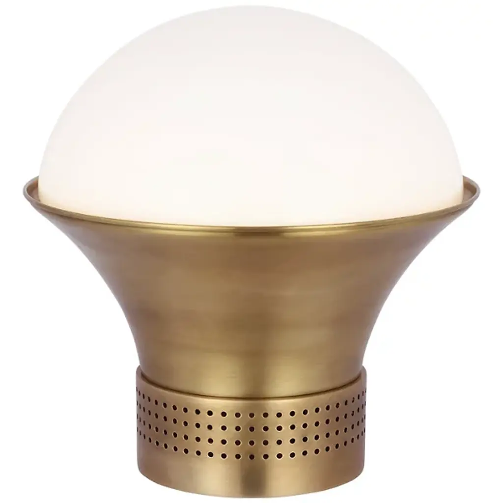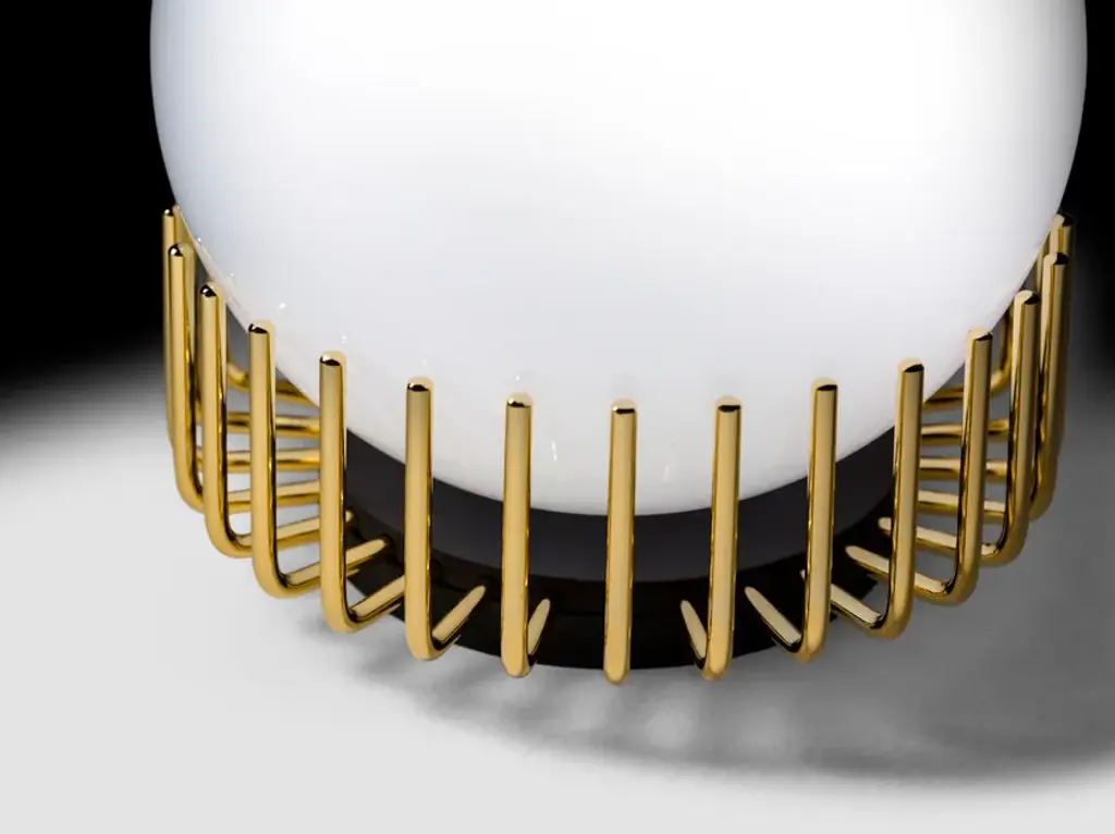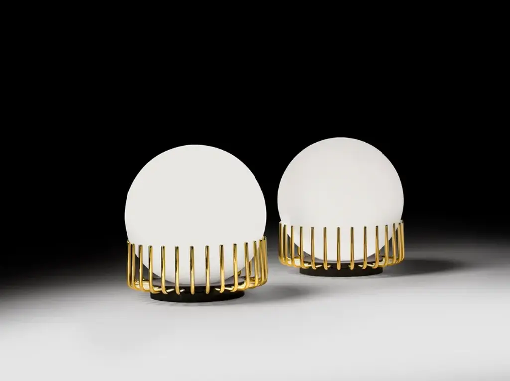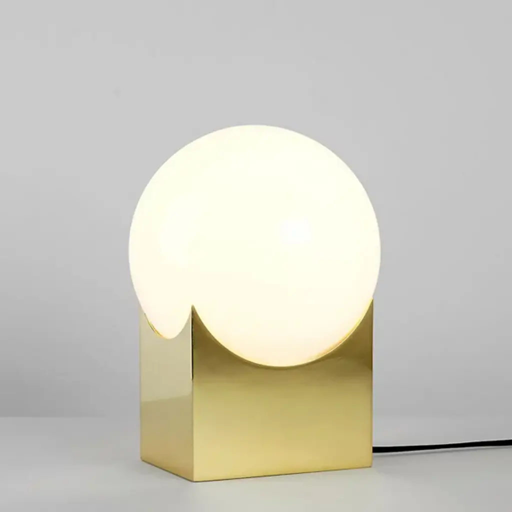 Lucy is a LED metal and opal glass table lamp.Diffused light. Sphere in shiny opaline glass, base in matt black lacquered MDF and metal elements in polished gold finish. Bulb: E27 (LED bulb suggested). CE certified. The soft, delicate light of an elegant opalescent sphere sits with infinite delicacy on a refined golden effect of balanced, graceful proportions: purity of form, simplicity and perfection. Lucy is a lamp that can give the missing point of light to the most elegant living areas: perfect also for bedside tables.
