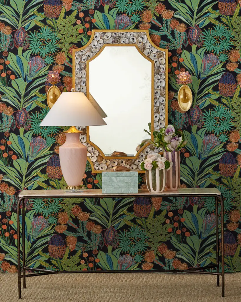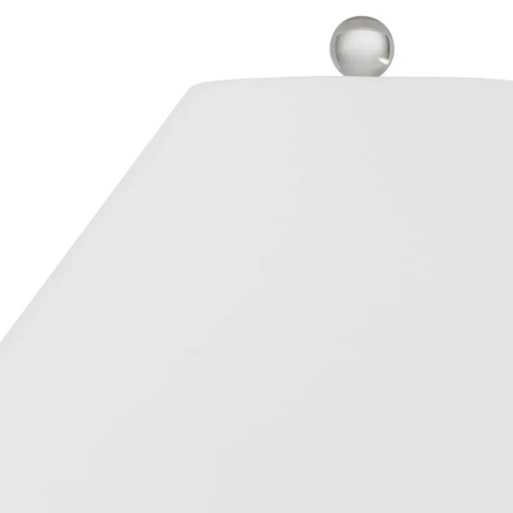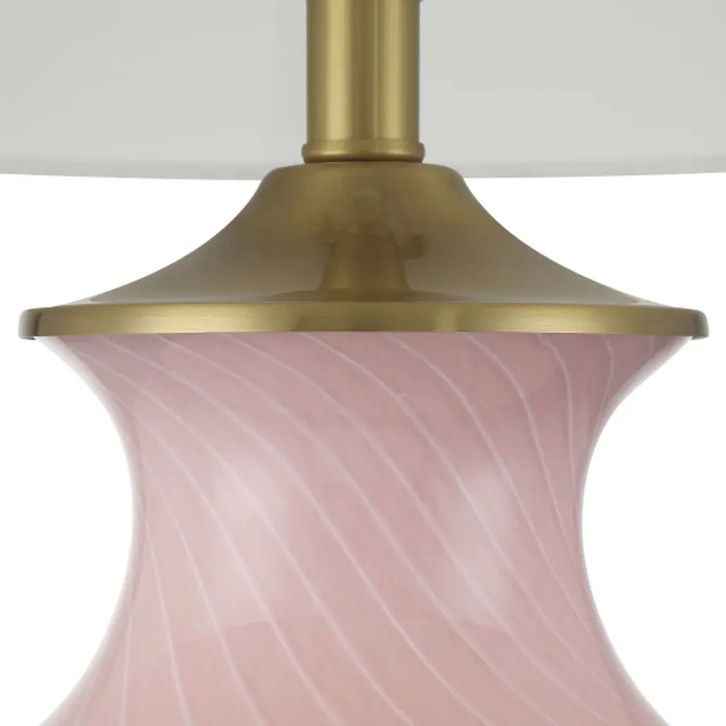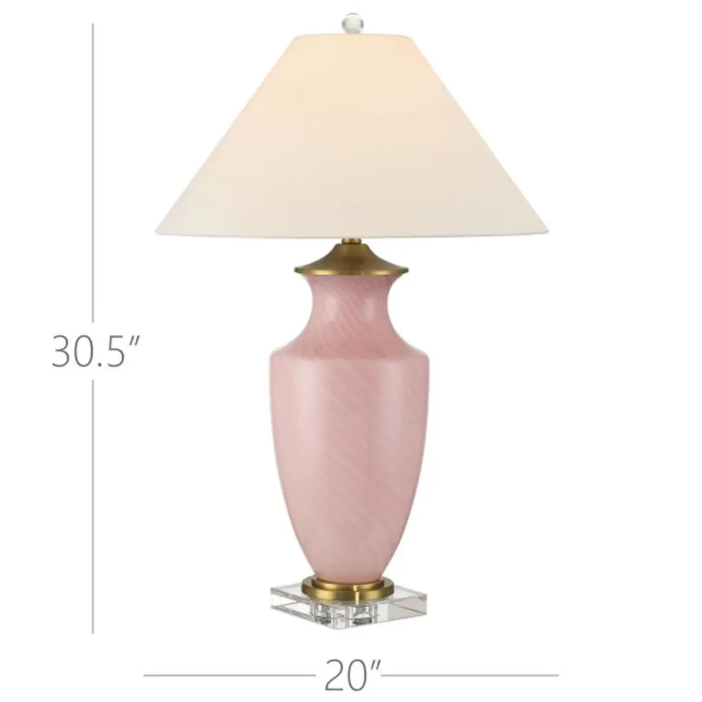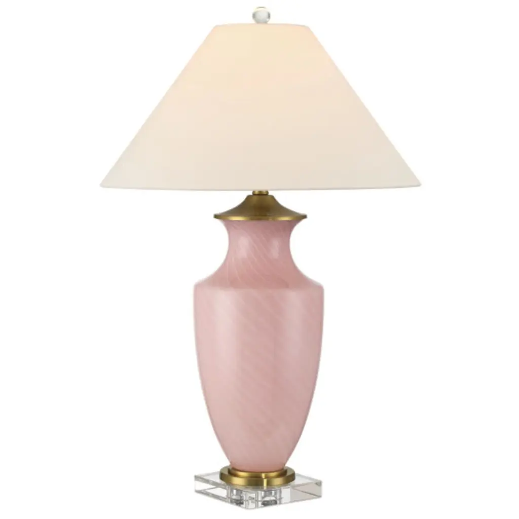 The table lamp is crafted in the Venetian tradition of Zanfirico, a glassmaking technique perfected by Murano artisans in the nineteenth century. Rods of glass are fused and pulled to create delicate tone-on-tone patterns that ripple across the surface. Its form rests on an optic crystal base topped with a polished brass step that adds a subtle metallic accent. An empire shade completes the silhouette.