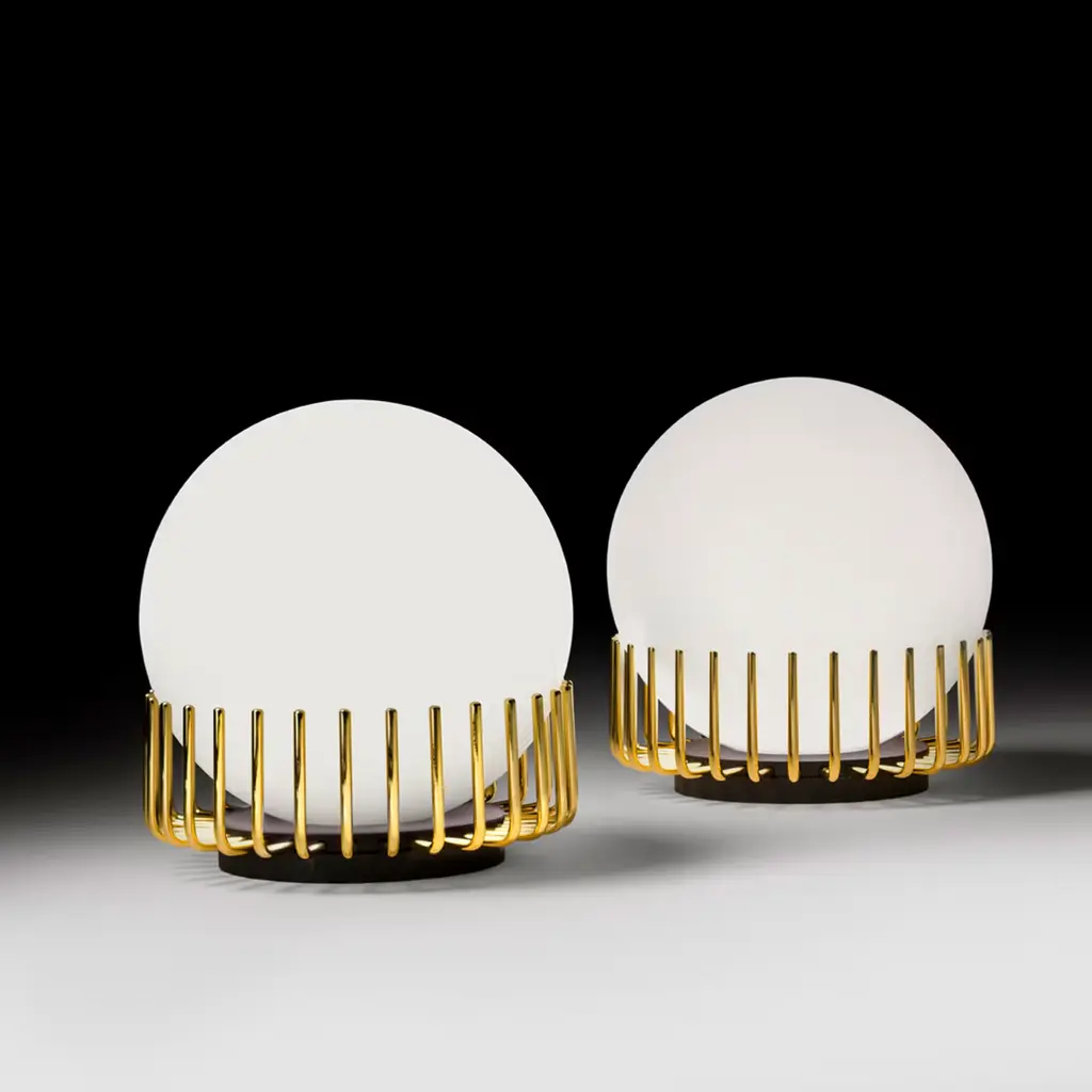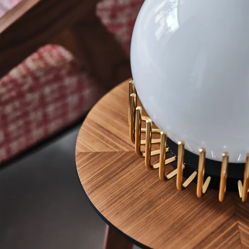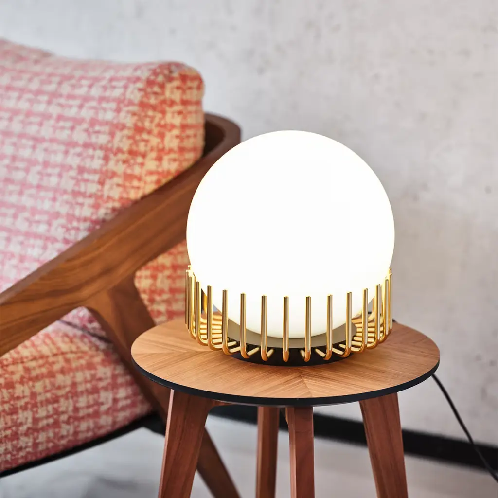 A perfect combination of materials and forms, this eye-catching table lamp is a unique piece of functional decor that will infuse any interior with a soft, diffused light. It comprises a stunning sphere made of glossy opaline glass, resting on a MDF base with a matte black-lacquered finish, and enriched with a ring of metal elements with a shiny gold finish. This piece can hold an E27 lightbulb, preferably LED.