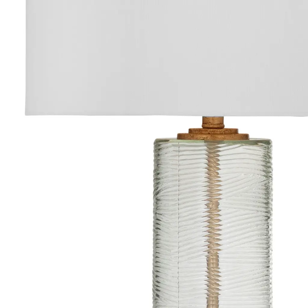 The undulating etched carvings on this crystal-clear table lamp evokes a serene, contemporary feel. Set in a gold-leaf metal frame and topped with a linen drum shade. A gleaming round finial makes for an elegant finishing touch.