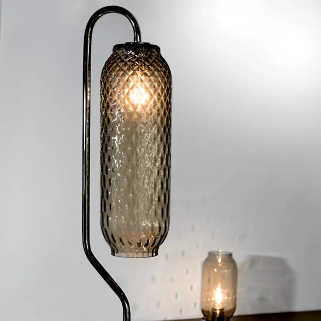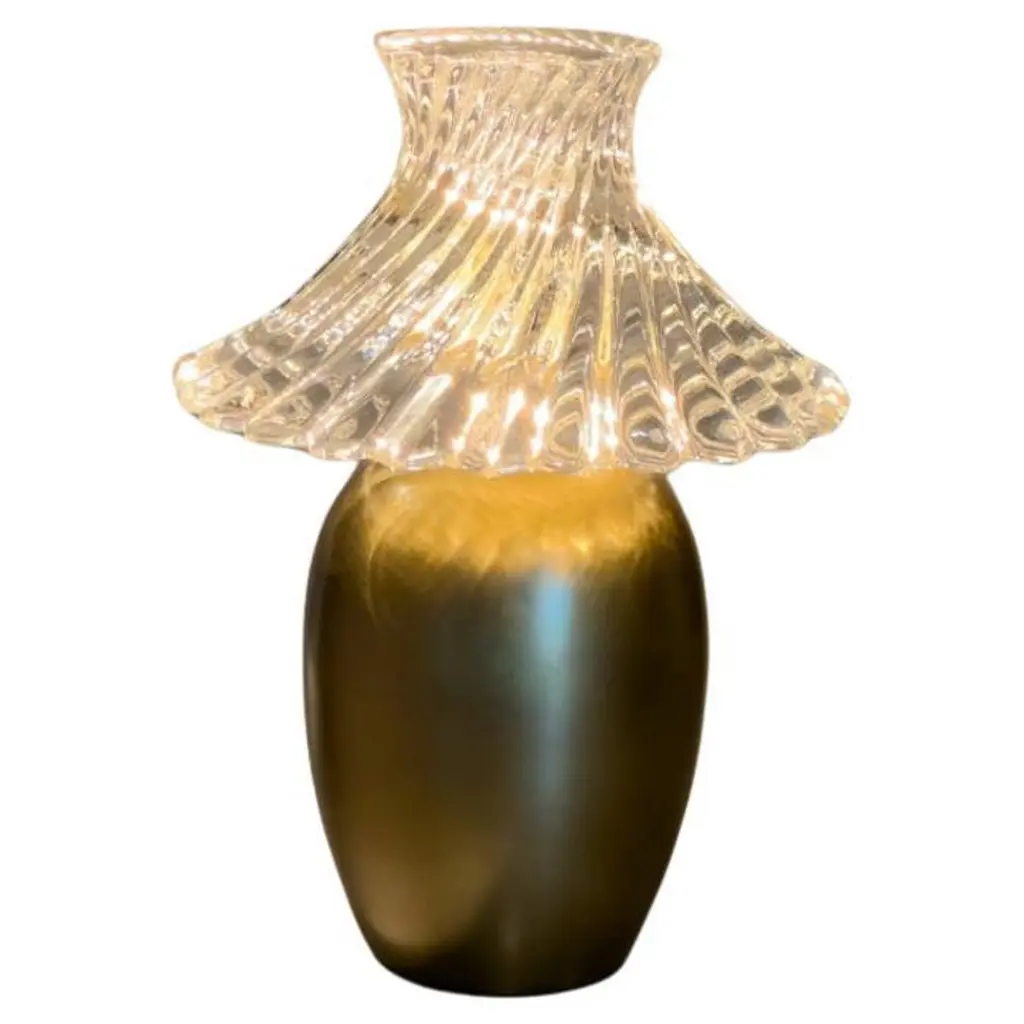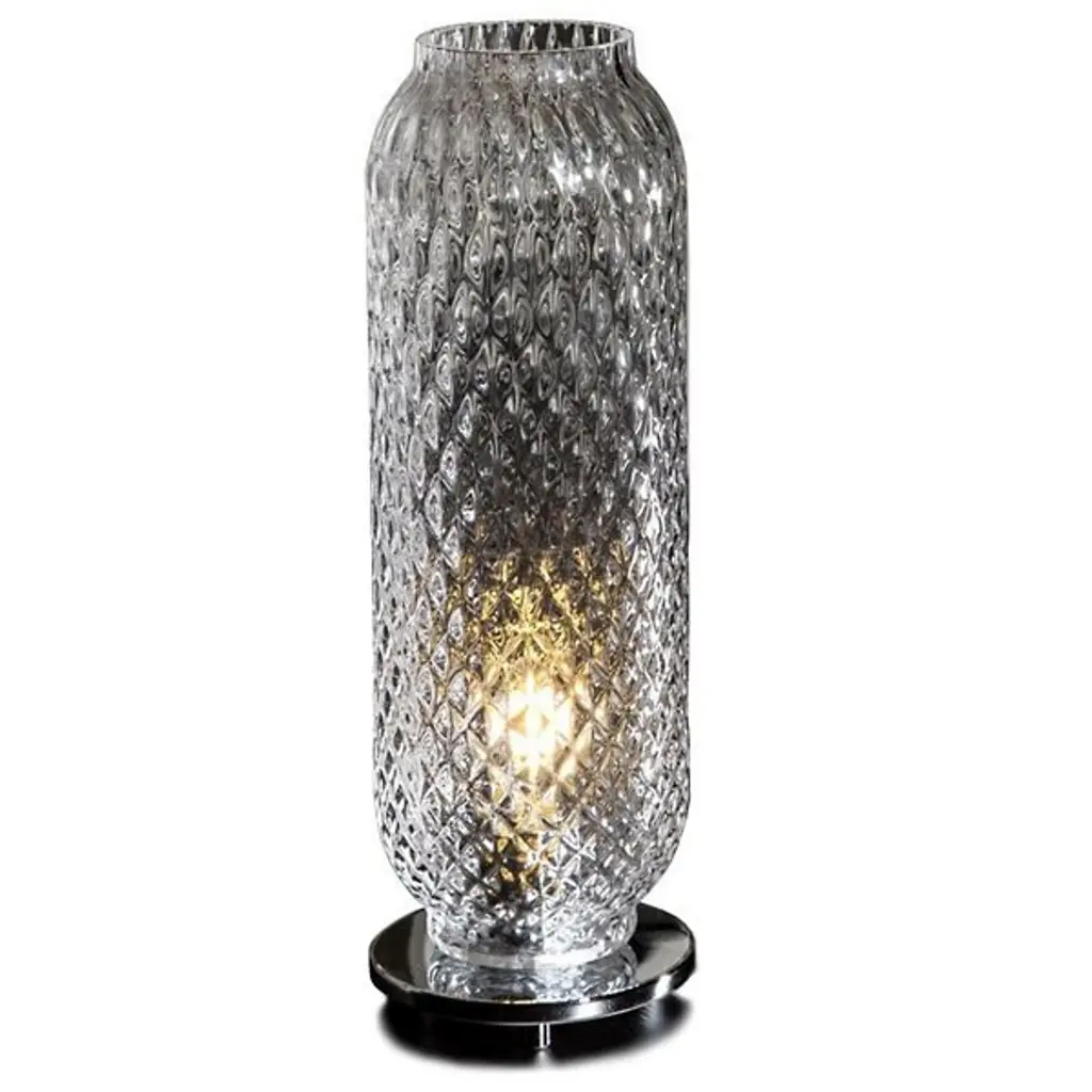 Expand your inside tables and sideboards with the upswept, sculptural simplicity of the Lumè Big Table Lamp from Mazzega 1946. A bold design crafted by Giovanni Barbato, it starts with a smooth disc base set atop three short legs, setting a single socket inside a diamond-contoured, vaselike diffuser of Murano glass that rises high around it. The translucent, textured nature of the diffuser suggests an older lantern, gentling excess brightness from the sides into a warm, glittering ambiance.