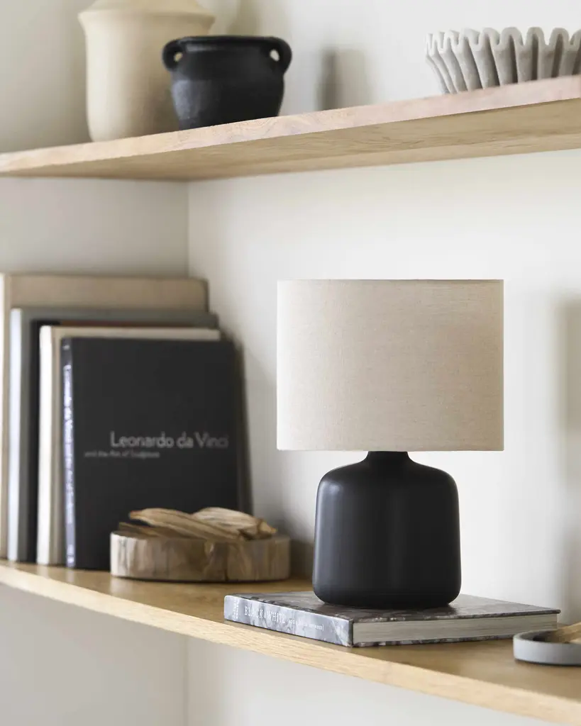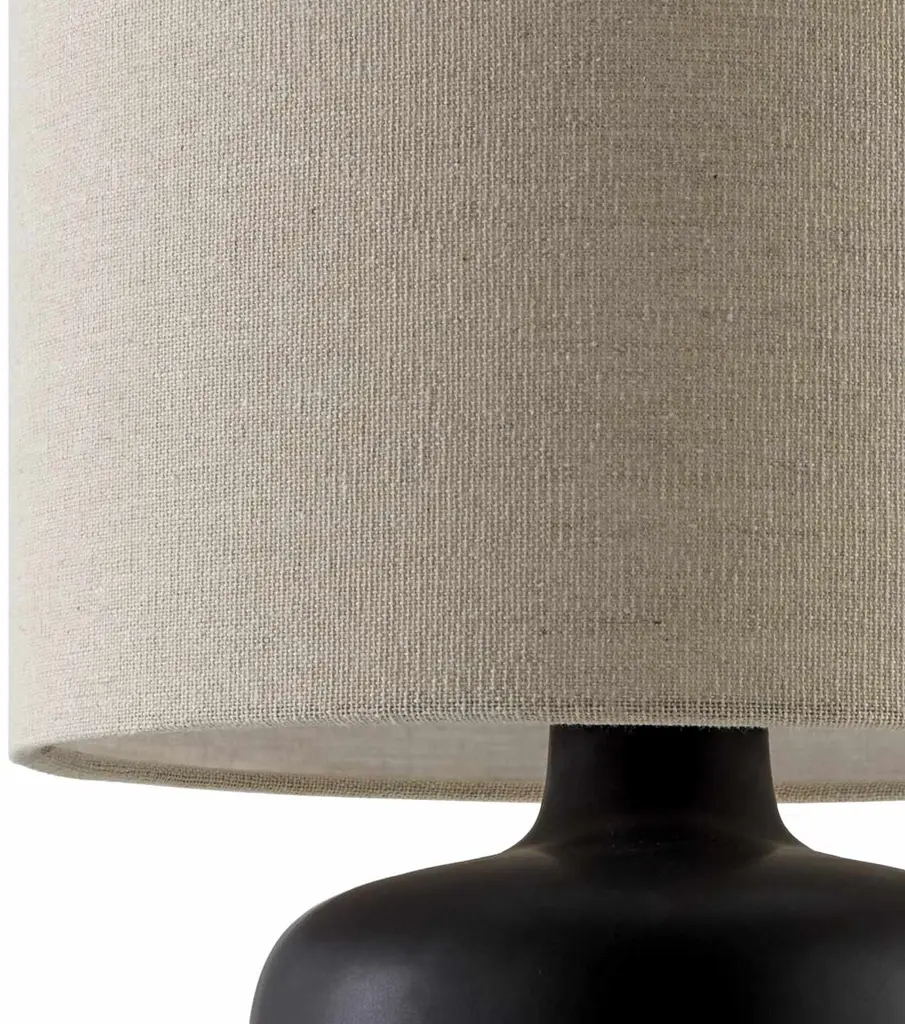 Collection: Lumellogno Colors: Black, Beige, White, Translucent Material: Body: Ceramic / Shade (Outside): Linen / Shade (Inside): Polyester Styles: Contemporary Made In: China Lighting Type: Accent Table Lighting Shade Material: Linen, Polyester Shade Color: White, Beige Cord Length: 6' Switch Type: Rocker Number of Bulbs: 1 Socket Type: E-26 Bulb Wattage: 40W