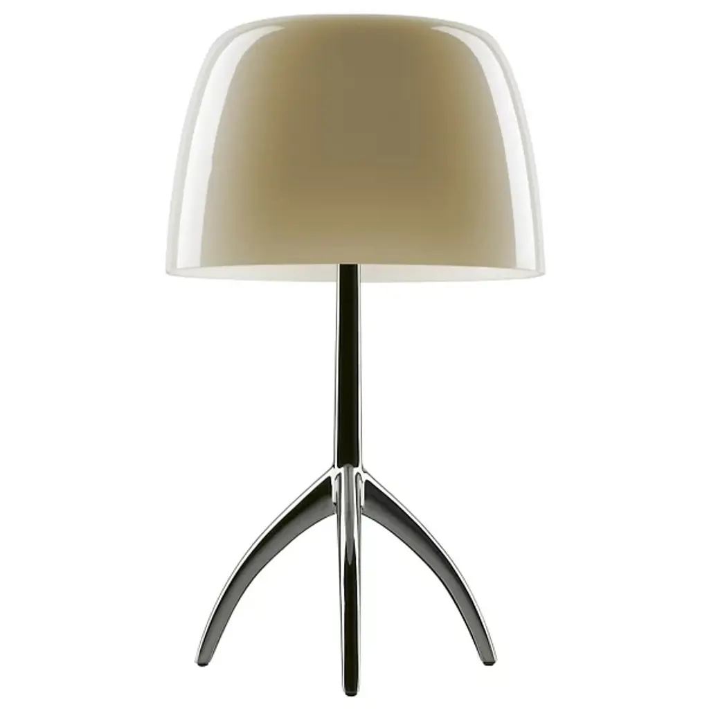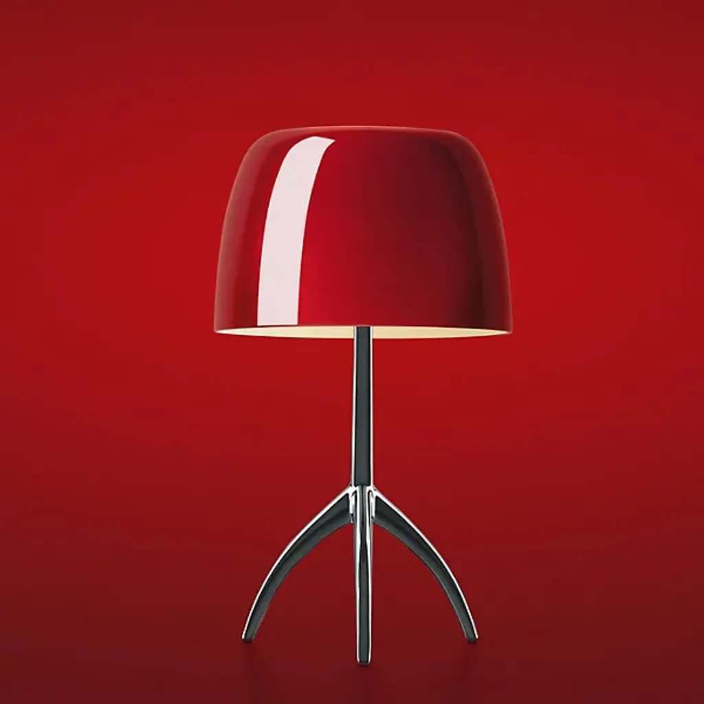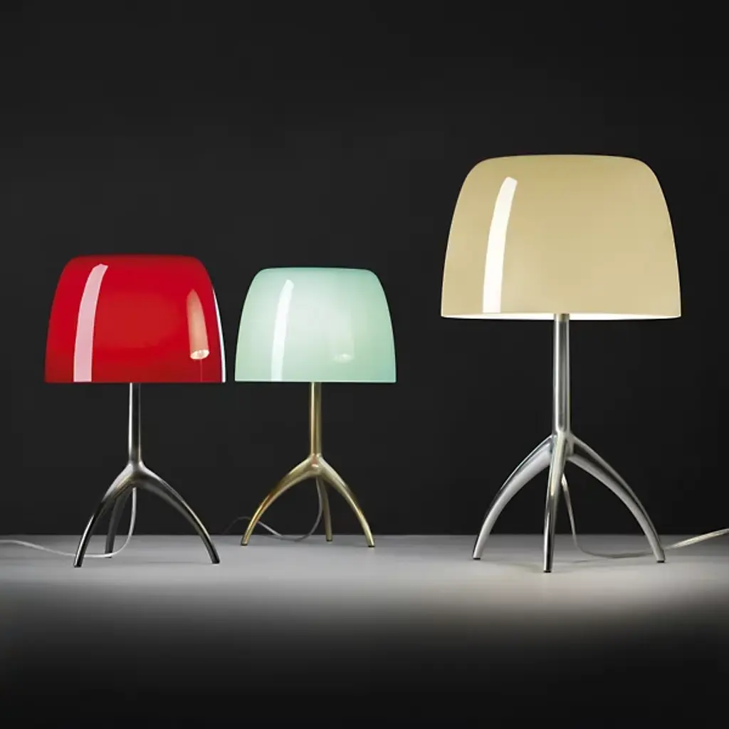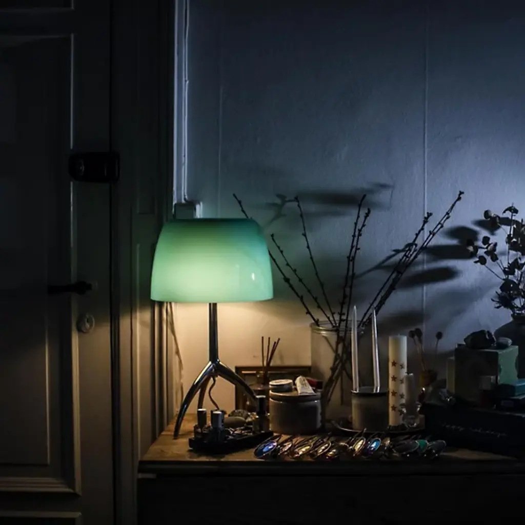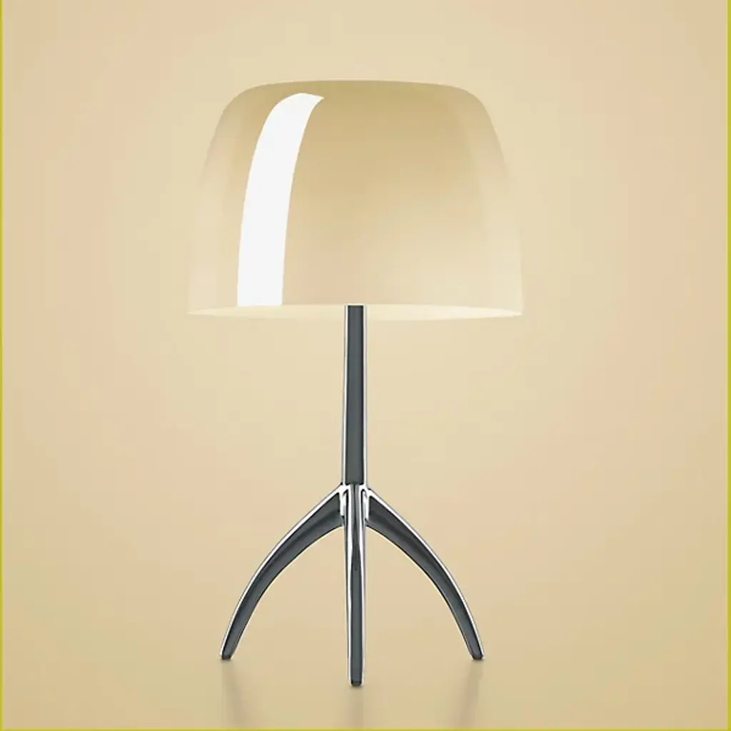 Designed in 1990 by Rodolfo Dordoni, the Foscarini Lumiere Table Lamp is both classic and edgy, featuring a claw-shaped tripod base with a blown glass shade in a variety of colors. The inner white layer of the shade helps to reflect a generous amount of light below the shade, while additional ambient light shines through the shade around the fixture.