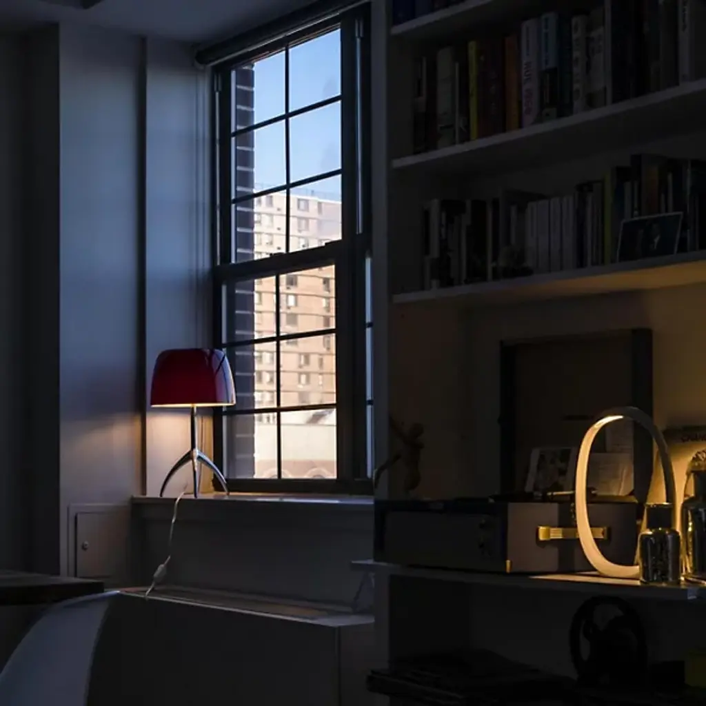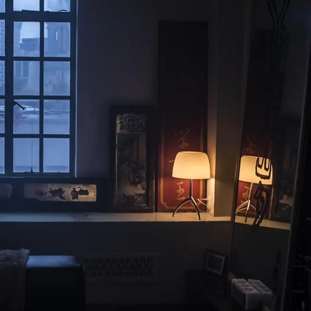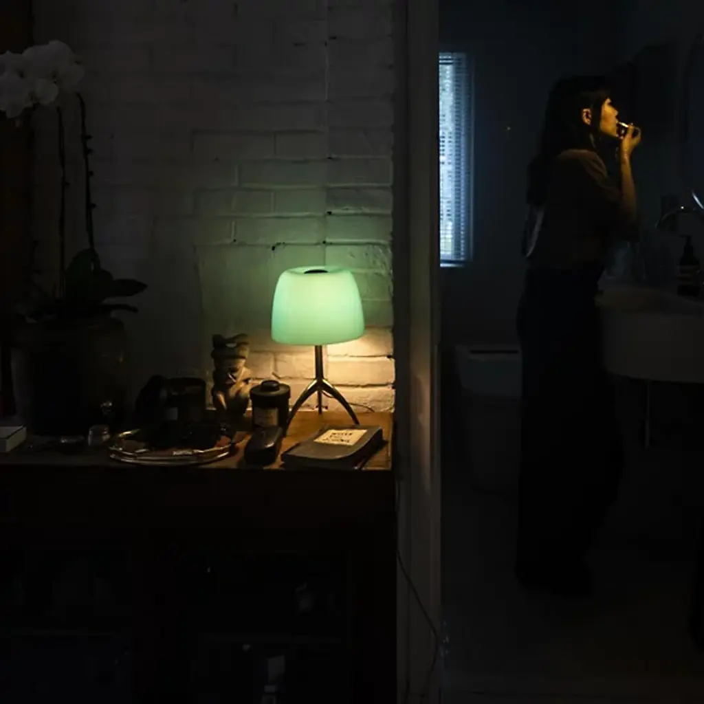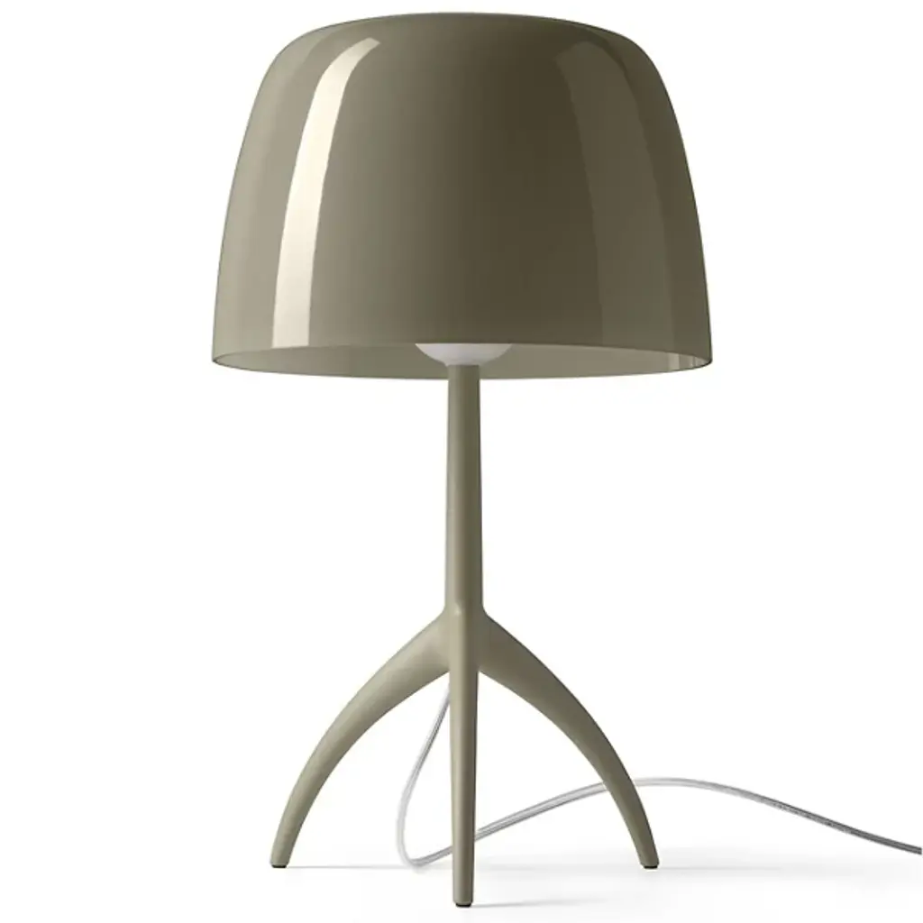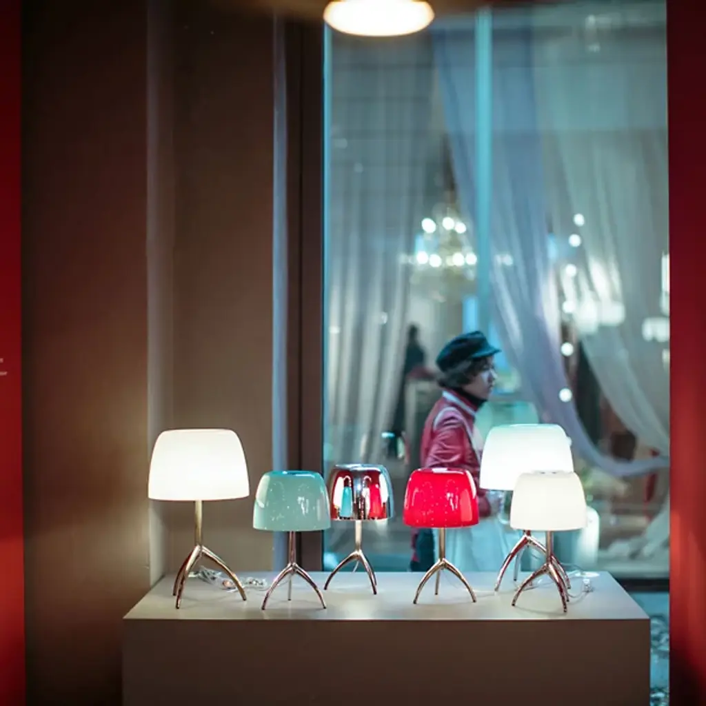 Designed in 1990 by Rodolfo Dordoni, the Foscarini Lumiere Table Lamp is both classic and edgy, featuring a claw-shaped tripod base with a blown glass shade in a variety of colors. The inner white layer of the shade helps to reflect a generous amount of light below the shade, while additional ambient light shines through the shade around the fixture.