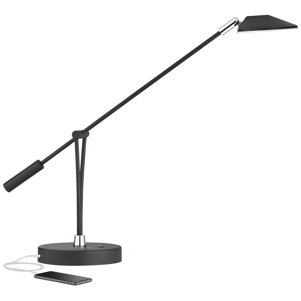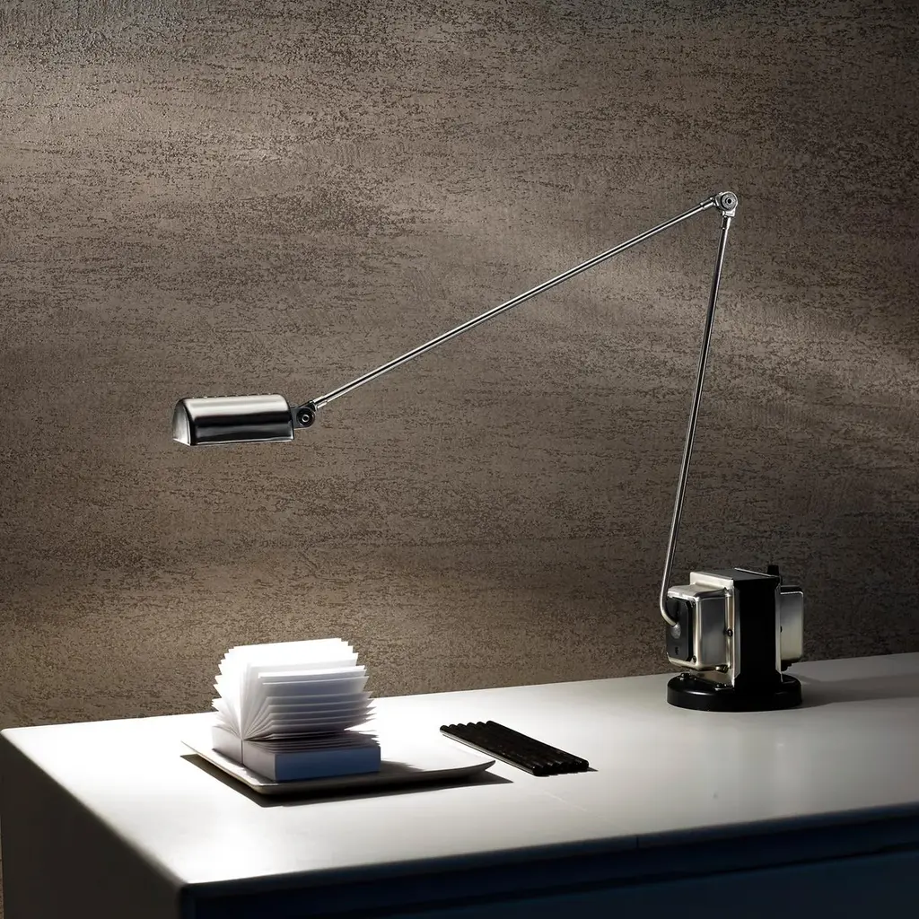 Table standing lamp of metal with an articulated pivoting arm, the head can rotate 360°. The light source is a 8W-LED controlled by a switch which can be set in ways: on/half light/off or dimmer. The maximum energy absorption is 11W.Dimmer and two step switchSource:1× 8W LED3000K / 840lmCode:01L44.