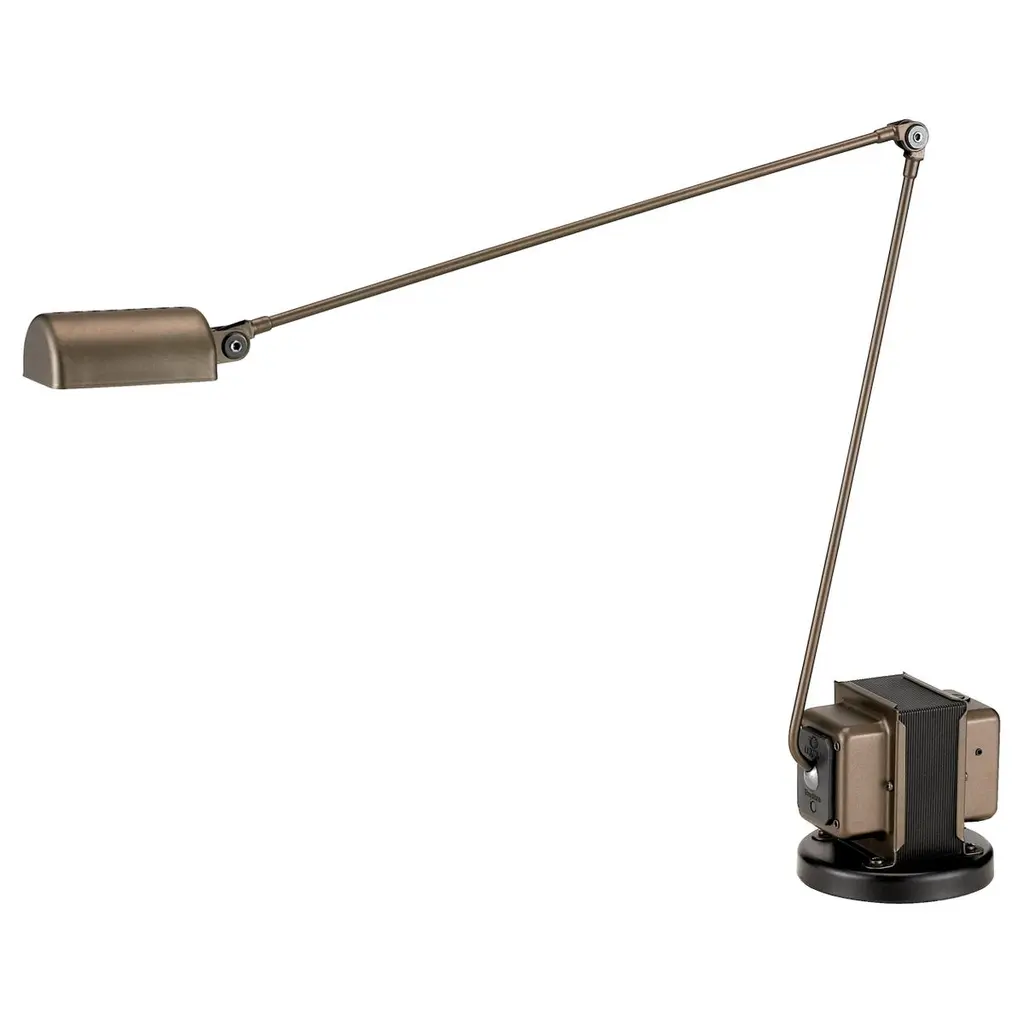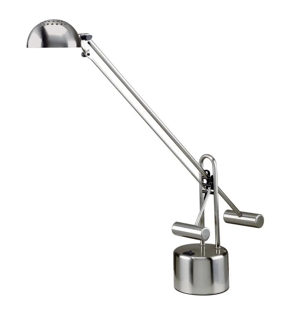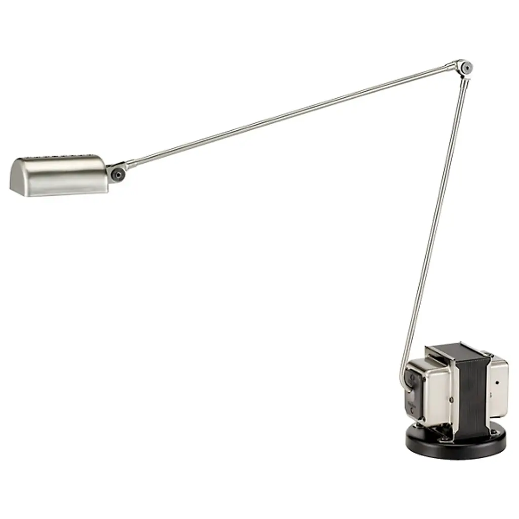 Table standing lamp of metal with an articulated pivoting arm, the head can rotate 360°. The light source is a 8W-LED controlled by a switch which can be set in ways: on/half light/off or dimmer. The maximum energy absorption is 11W.Dimmer and two step switchSource:1× 8W LED3000K / 840lmCode:01L02op.