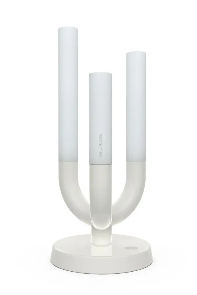 Luna is inspired by the elegant candelabra on the tables of our memory. The candles that burn irregularly, the triptych of lights that illuminate softly: all transposed into a contemporary, portable, lightweight, rechargeable, dimmable, soft touch lamp. Luna's high performance is encased in a painted aluminium base and three cylinder-shaped stems of opaque plexiglass with three sources of 3000K warm light LED illumination.2W, LEDMATERIALstem:aluminiumcylinders: plexiglas
