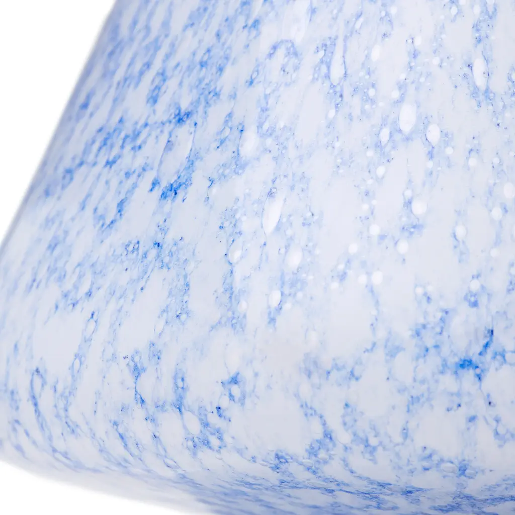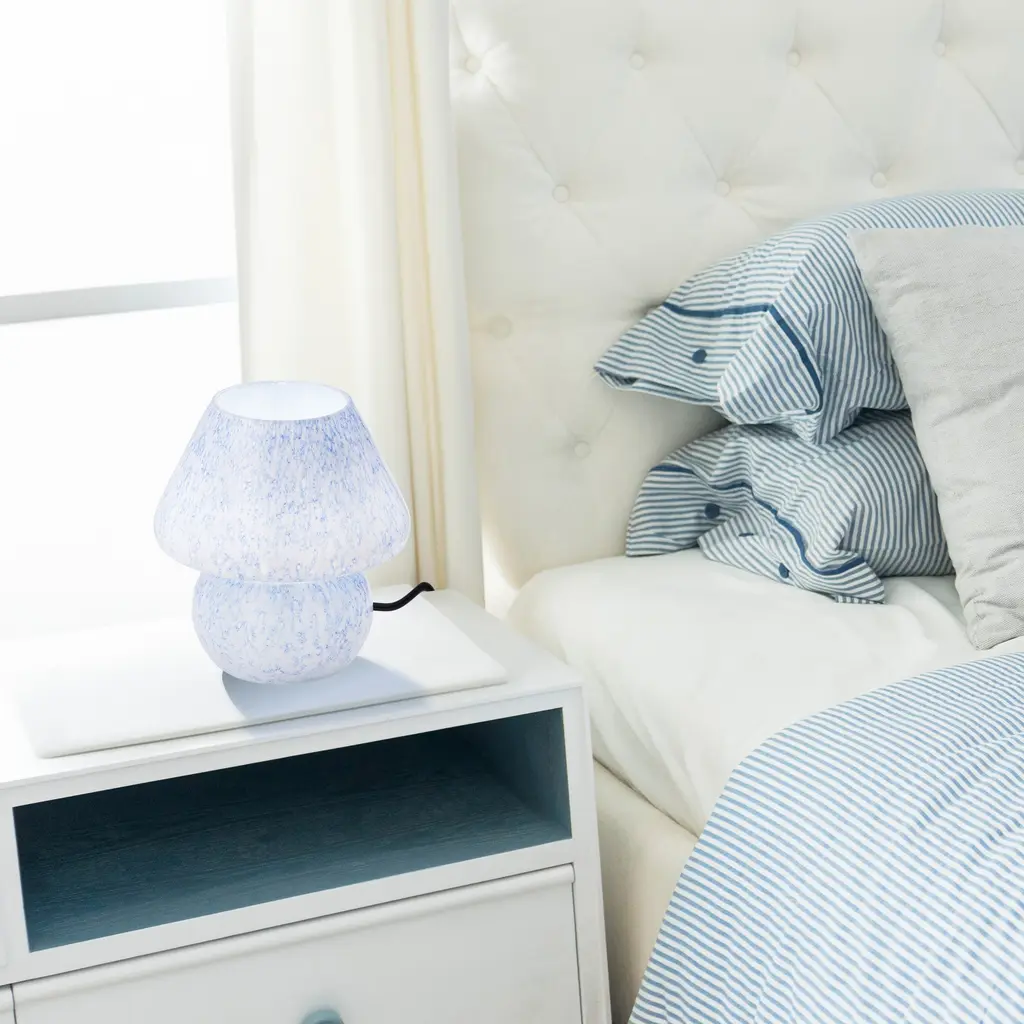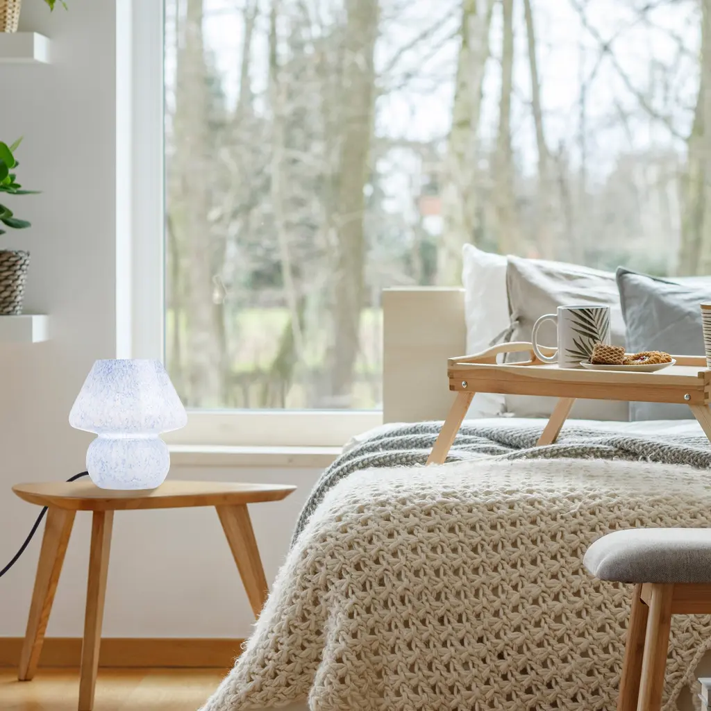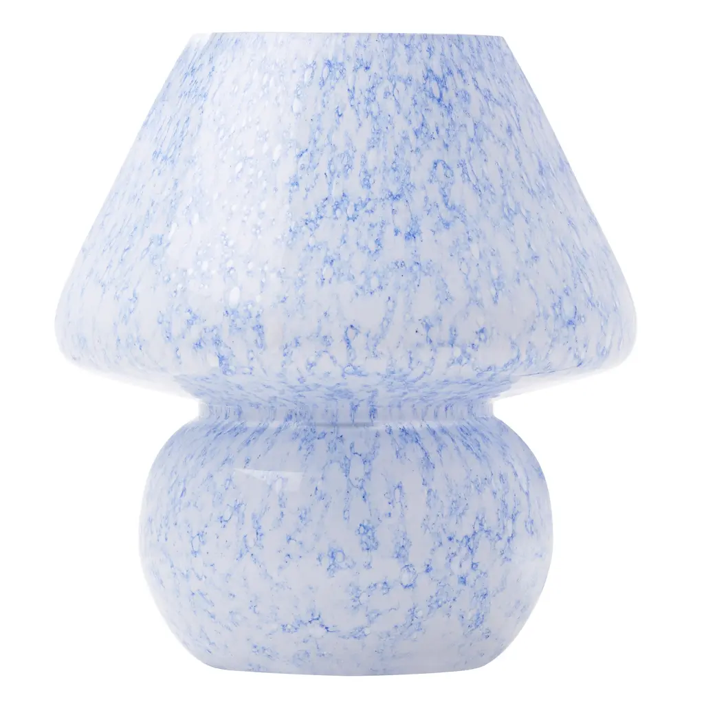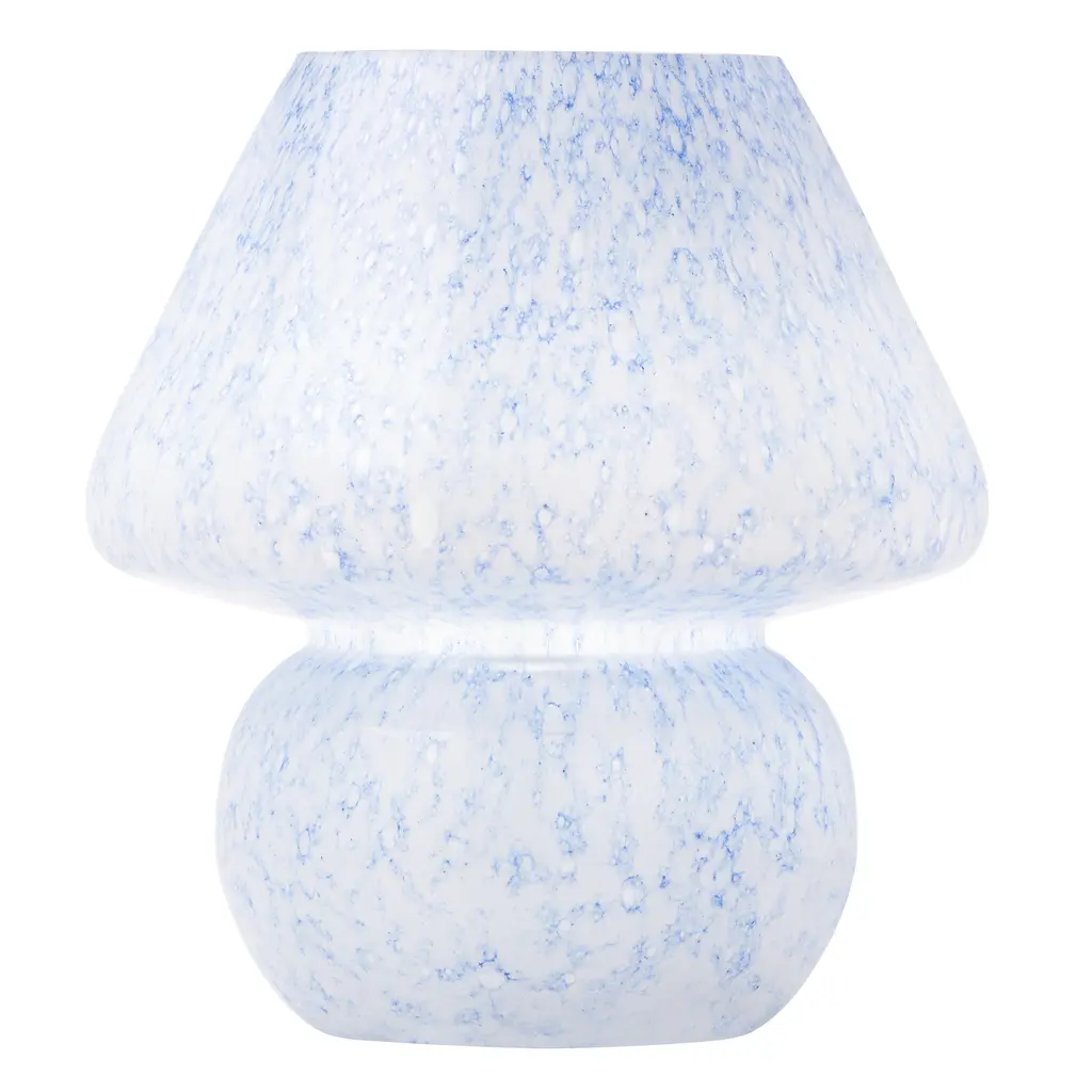 A bohemian, nature-inspired accent piece, this mushroom-shaped lamp emanates a warm, multidirectional light that illuminates your space with an inviting glow. The lamp's artistic design, featuring swirls of blue and white glass, elevates any room with an air of mystique and wonder. The lamp includes an on-off line switch, offering easy control over your lighting environment. Care for this lamp is simple, requiring only a wipe with a dry cloth to maintain its beauty. Note: Requires one 25-watt or compatible LED, CFL, or incandescent bulb, bulb not included.