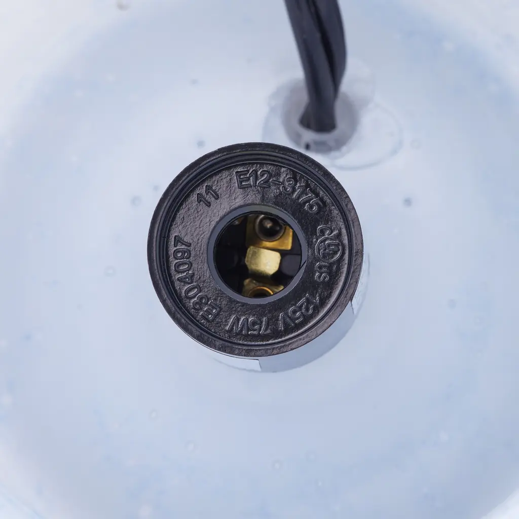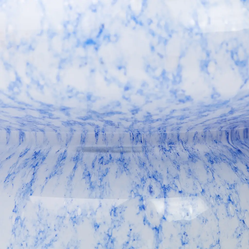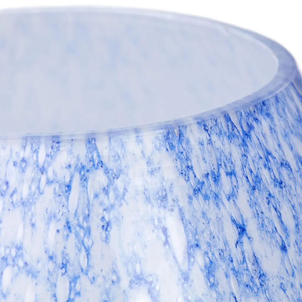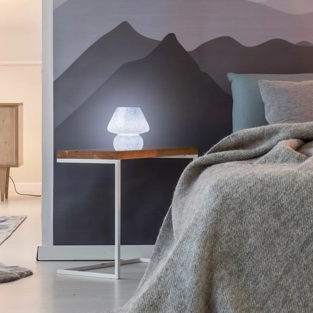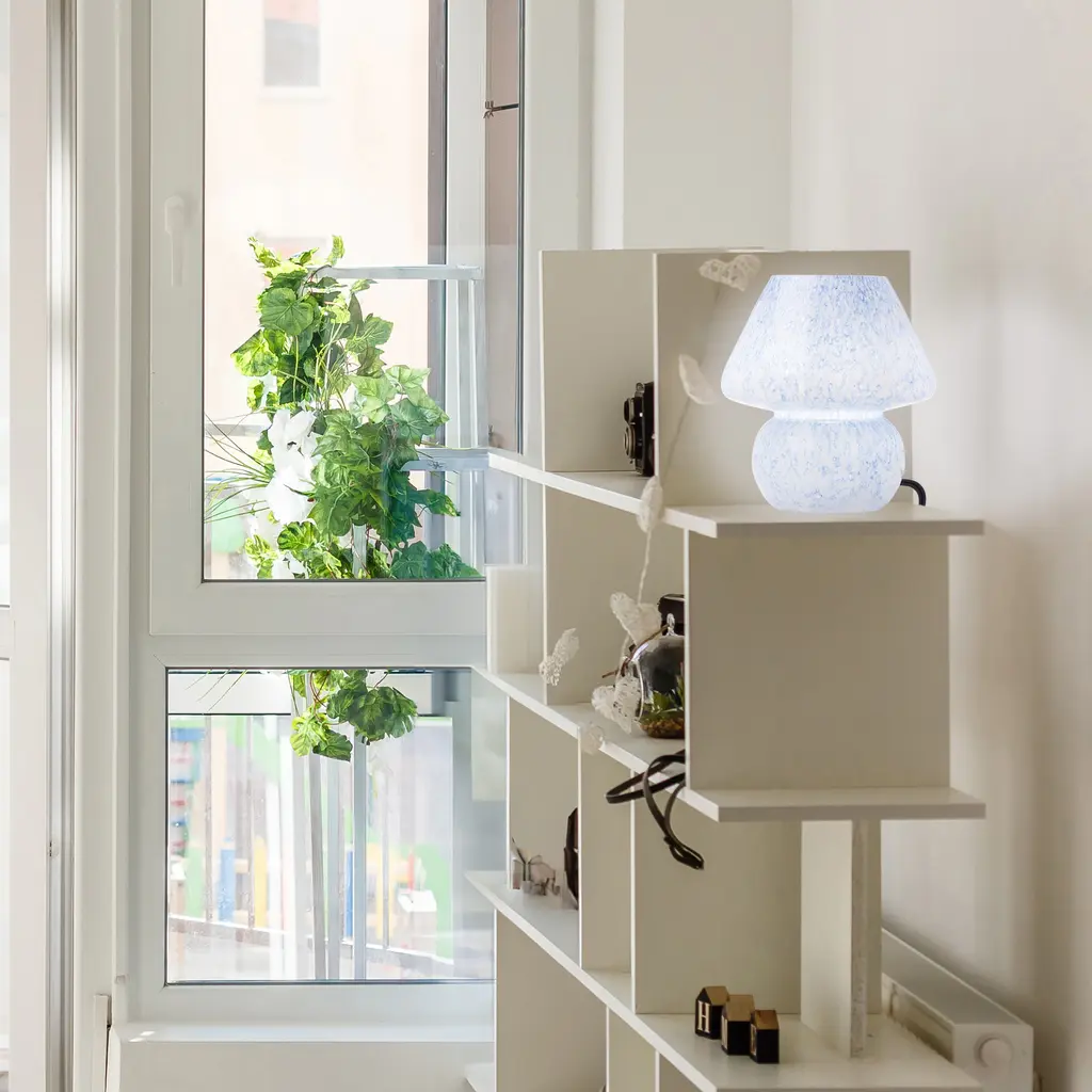A bohemian, nature-inspired accent piece, this mushroom-shaped lamp emanates a warm, multidirectional light that illuminates your space with an inviting glow. The lamp's artistic design, featuring swirls of blue and white glass, elevates any room with an air of mystique and wonder. The lamp includes an on-off line switch, offering easy control over your lighting environment. Care for this lamp is simple, requiring only a wipe with a dry cloth to maintain its beauty. Note: Requires one 25-watt or compatible LED, CFL, or incandescent bulb, bulb not included.
