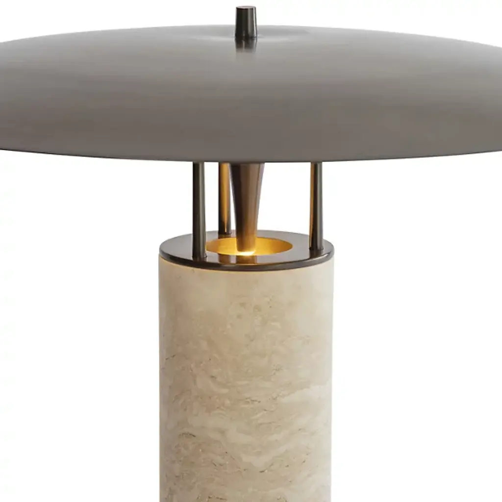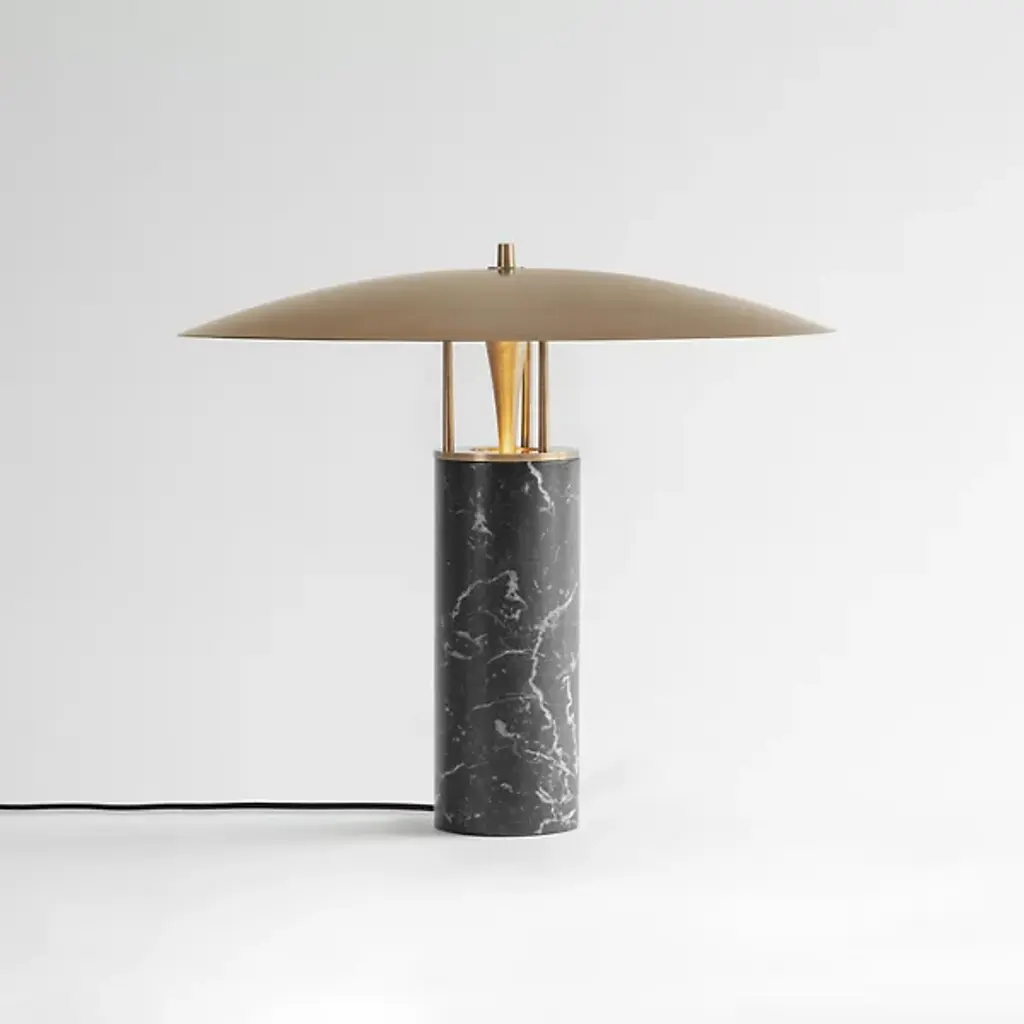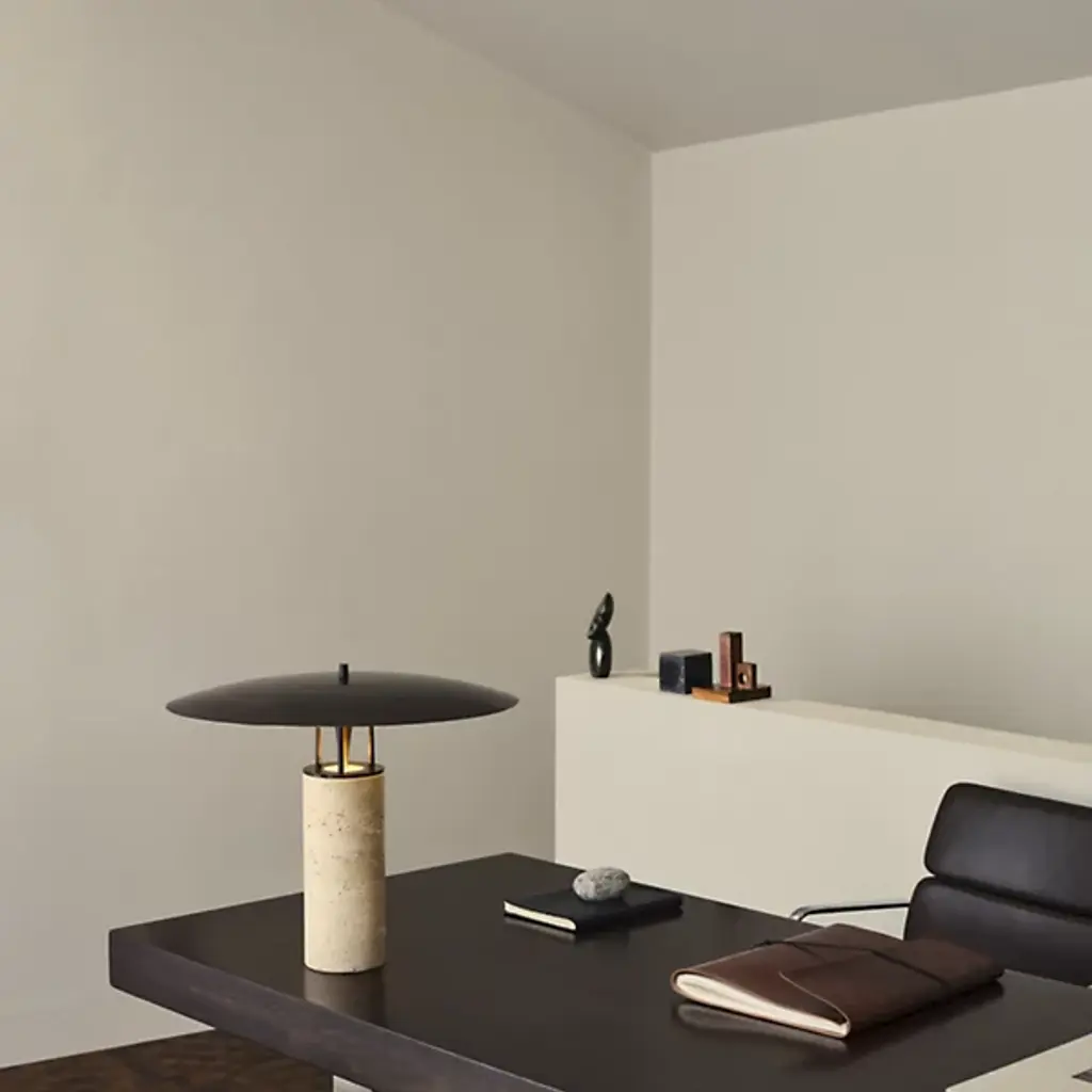 Enhance the charm of your office space with the Luna Table Lamp from J. Adams & Co. This lamp is constructed in a distinctly cylindrical style, assuring that it will easily fit onto your desktop. With a unique blend of metallic and geological motifs, this decorative piece will surely be noticed. From the lamp’s center jut dual stems which evenly support a brimming shade. Light diffuses between the body of the lamp and the shade’s underside, illuminating the room. The cylinder’s surface area incorporates textures that harken to a period of planetary exploration; the slender, saucer-like make of the shade is entirely contemporary.