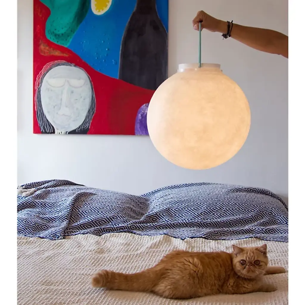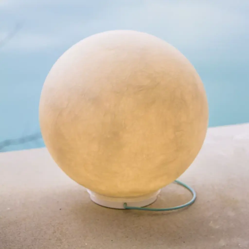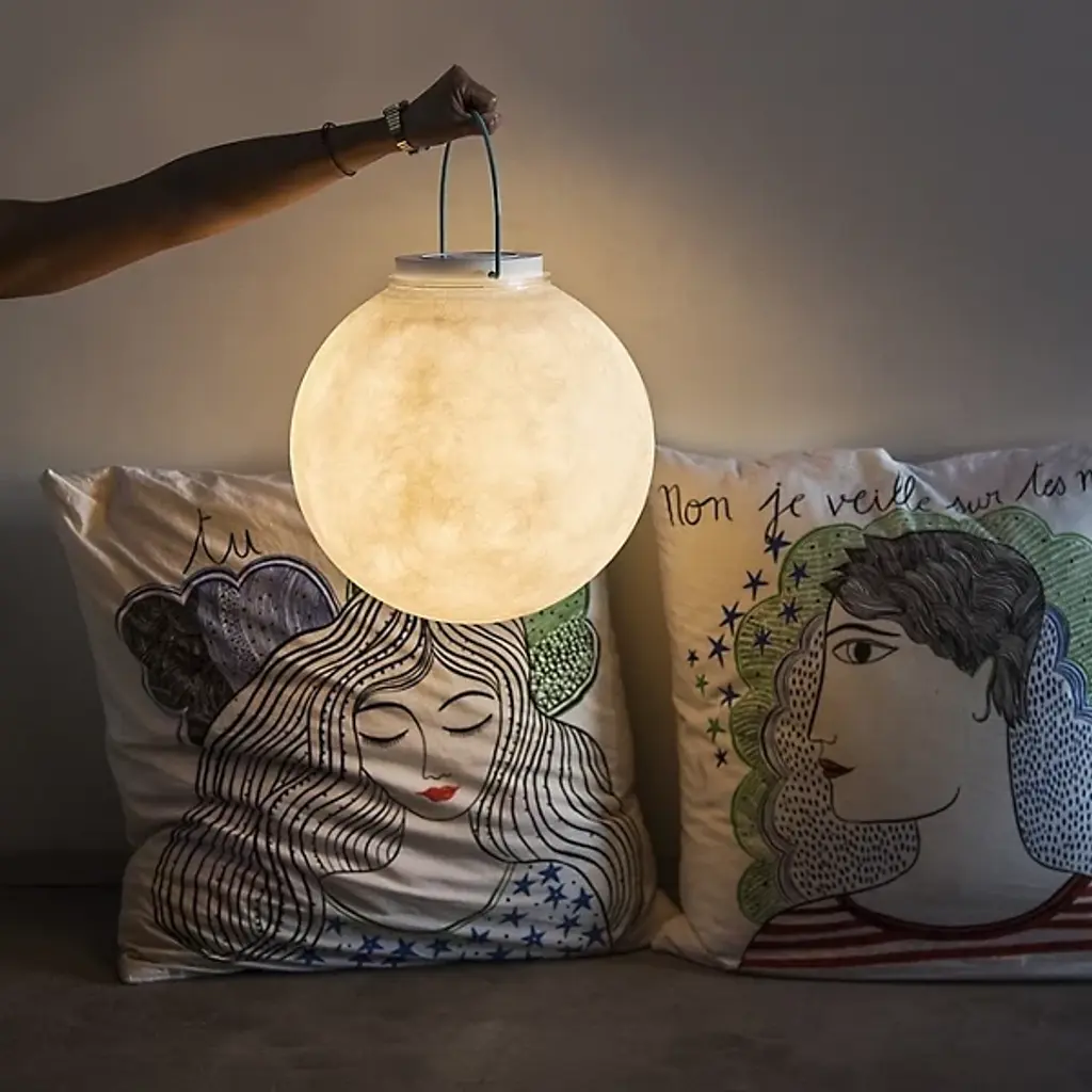 A poetic, romantic, and mysterious piece inspired by the moon. Pair the Luna Take Away Outdoor Table Lamp from In-Es Art Design with the soothing glow of the moon outdoors or bring it inside, all thanks to a cordless rechargeable design. Like a piece of art, this lamp tells a story and conjures emotions. In-Es Art Design’s work bridges the gap between the storytelling form of art with the deep functionality required of modern design. To translate the moon’s uneven, luminescent qualities with shape and material, In-Es Art Design has created a charming globe shape with a resin and fiber laced nebulite material. A steel cap makes the globe stand elegantly over a table, while a fine handle around lets it be easily moved and hung. In any setting, warmth and mystery come through the radiant, artfully silhouetted globe as a true moonlight inspiration.