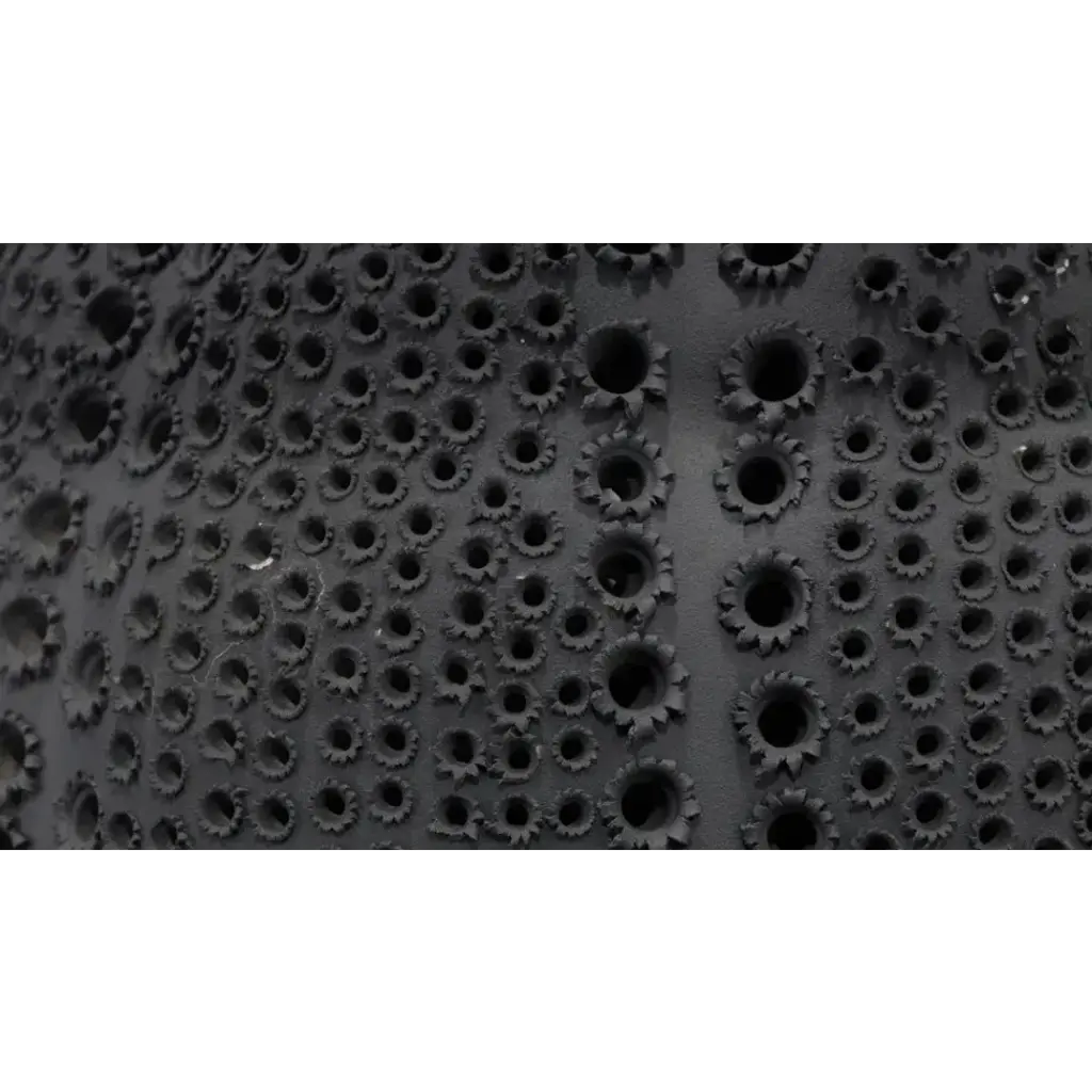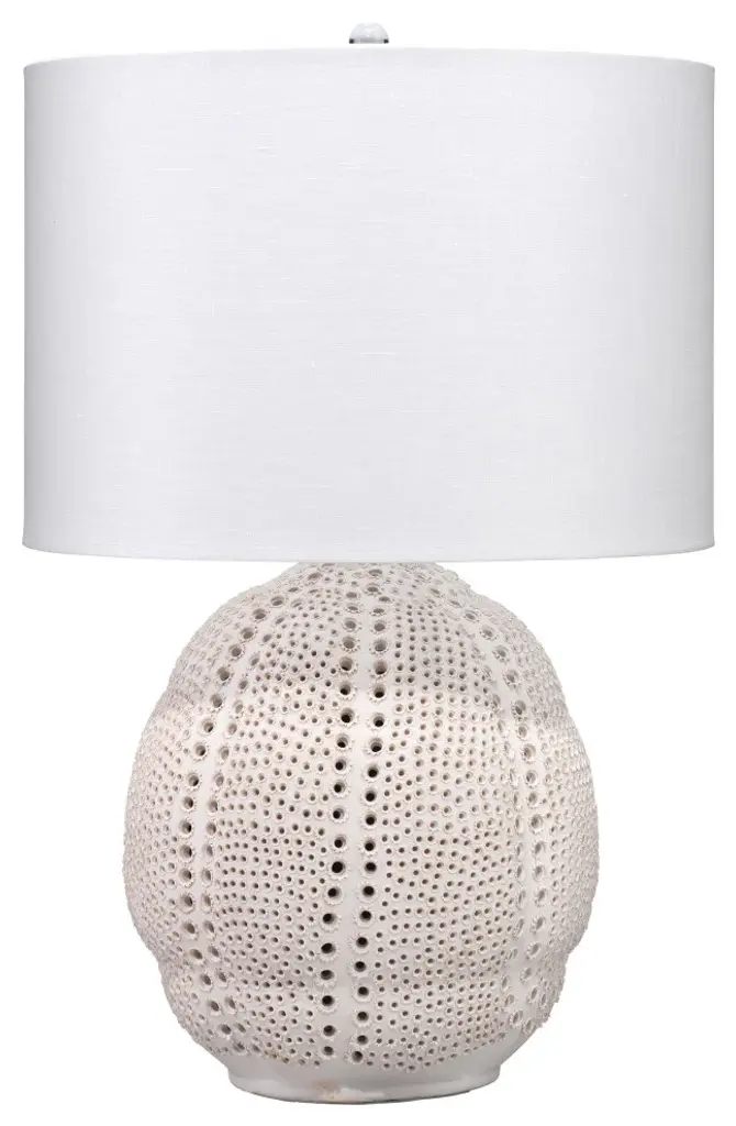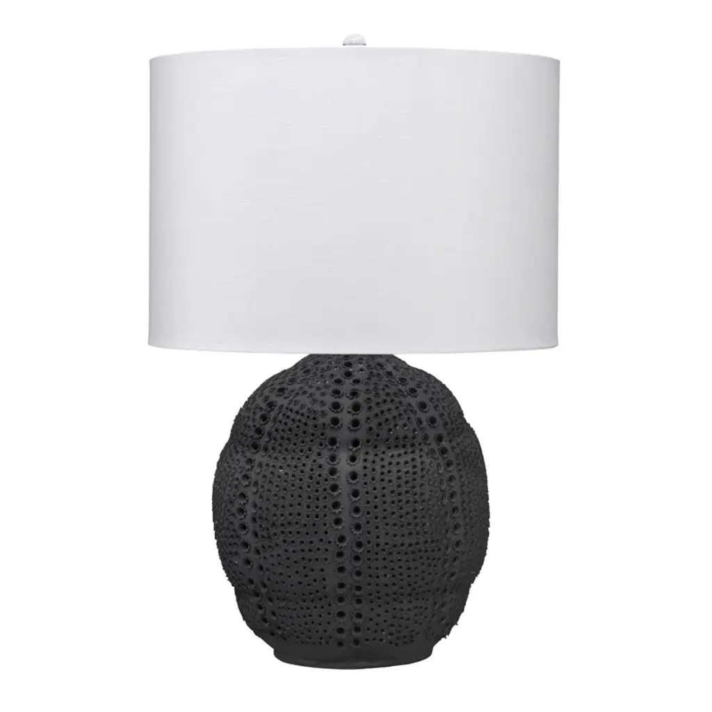 The perforated patterns on the curved and dimpled base of this table lamp were inspired by craters, mountains, and seas of the lunar landscape. The bold and decorative patterns are created one-at-a-time by talented artisans. Topped with a linen rolled-edge drum shade, this one-of-a-kind piece is perfect for any contemporary home.