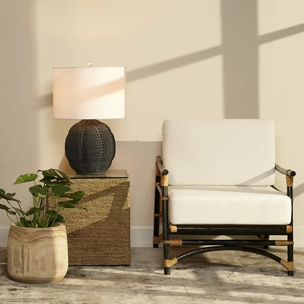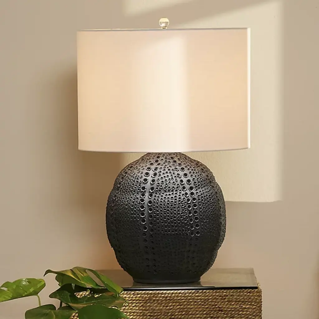 The stellar style of the Lunar Table Lamp from Jamie Young Co. leaves an inspired study in contrasting elements. Rising from an organic ovoid shape in porcelain, the perforated patterns on the curved and dimpled base of this table lamp reflect Jaime's interpretation of the craters, mountains, and seas of the lunar landscape, created one at a time by talented artisans. Each lamp is topped with a linen rolled-edge drum shade in white that stands out from the intricate body, while an acrylic ball finial and clean-surfaced sockets and 3-way turn knobs offer a welcome hint of glam that glitters.