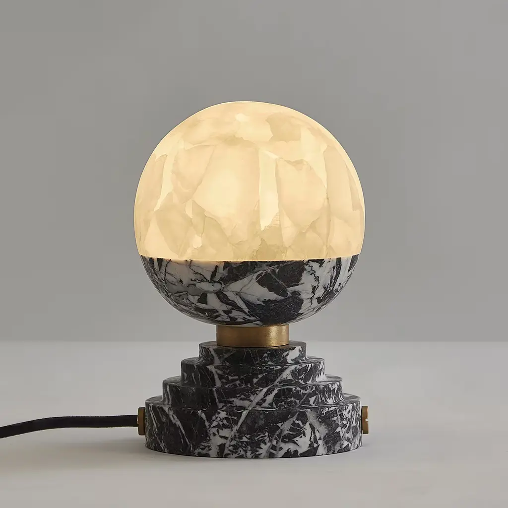 Rising from a circular, tiered base in top-rate black-and-white marble, this striking design seems to extrapolate a warm moon from a clear, dark sky to turn it into a one-of-a-kind table lamp. The warm light produced by the G9 LED bulb housed in the spherical diffuser of white onyx makes the stone's natural veins stand out. Designed to serve also as a pendant lamp or a sconce, this design is also available in the Grand Antique, Portoro, and Rosso Levanto marble variants, please address the Concierge for further technical details.