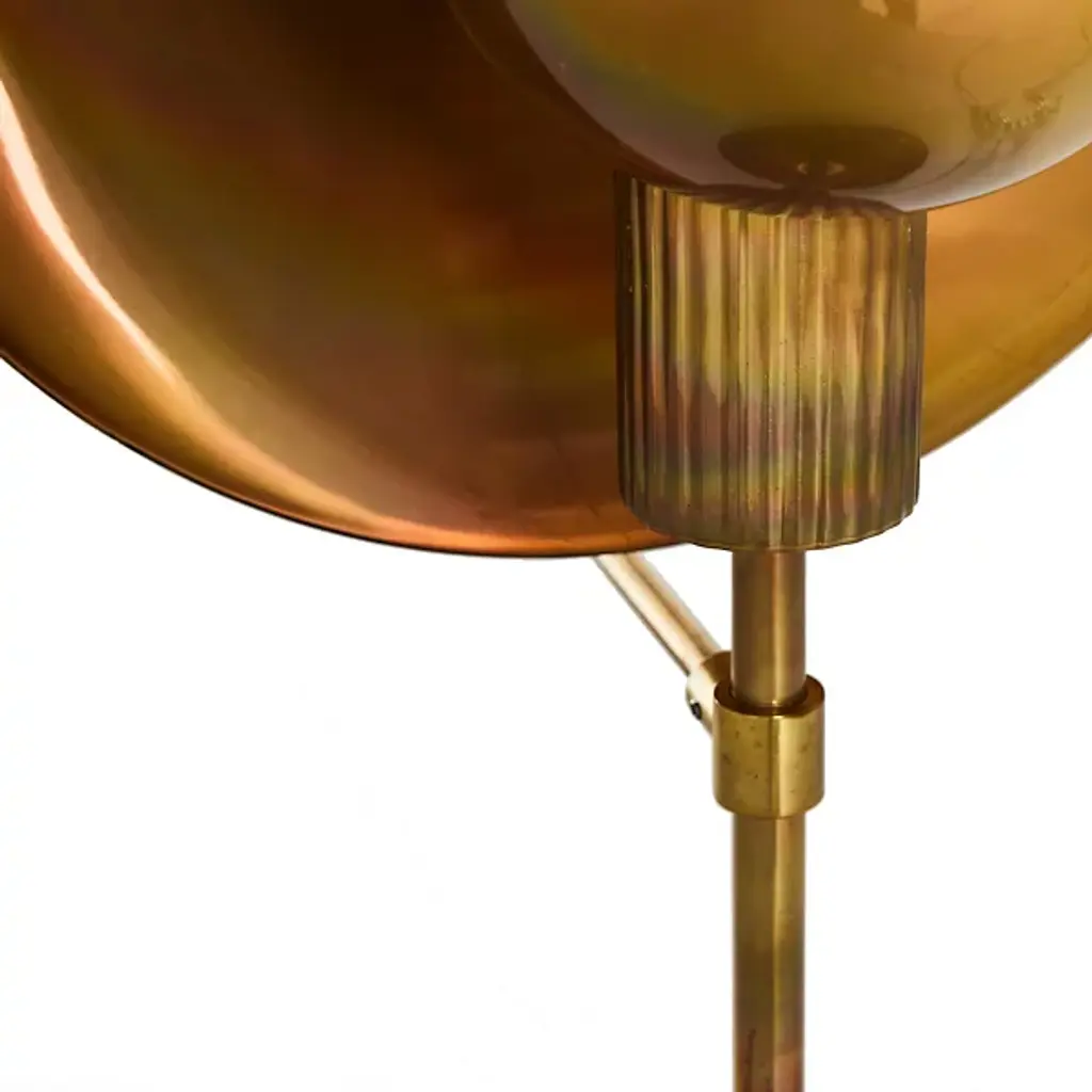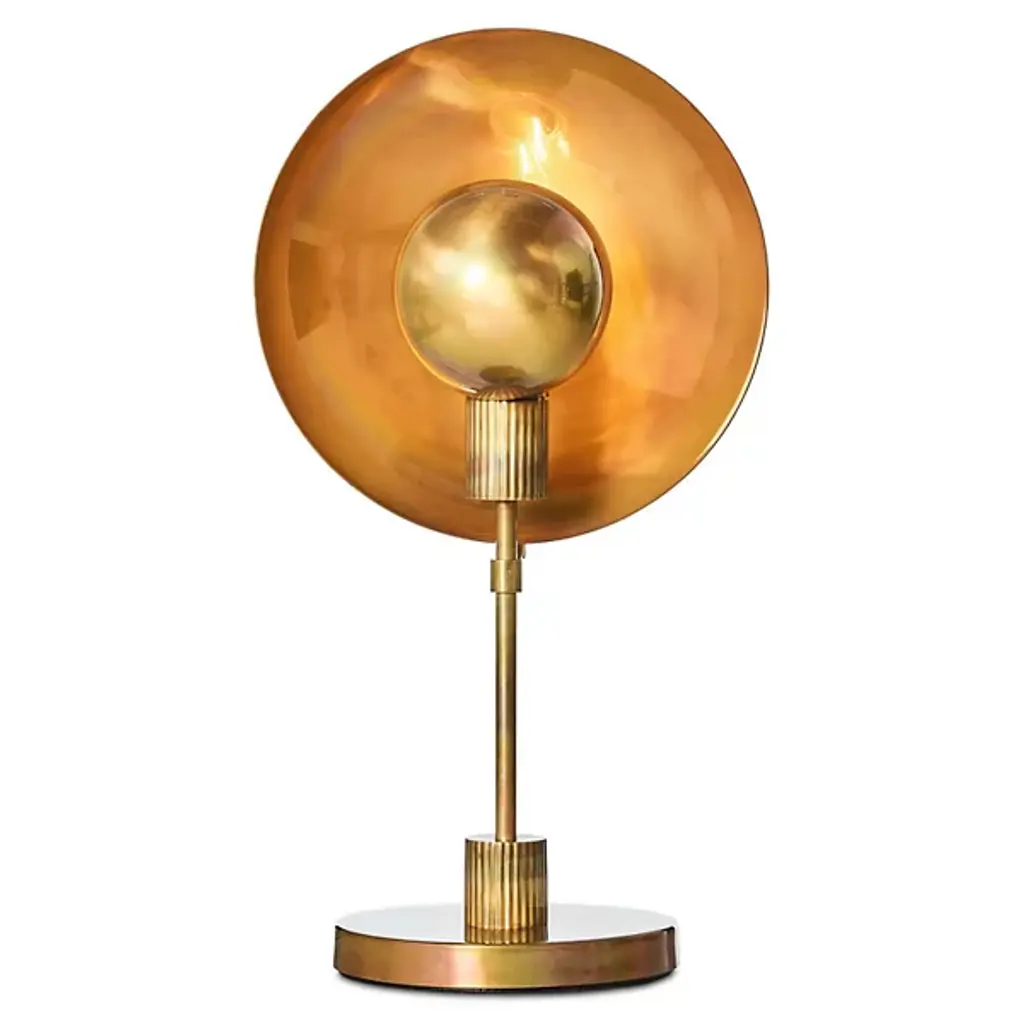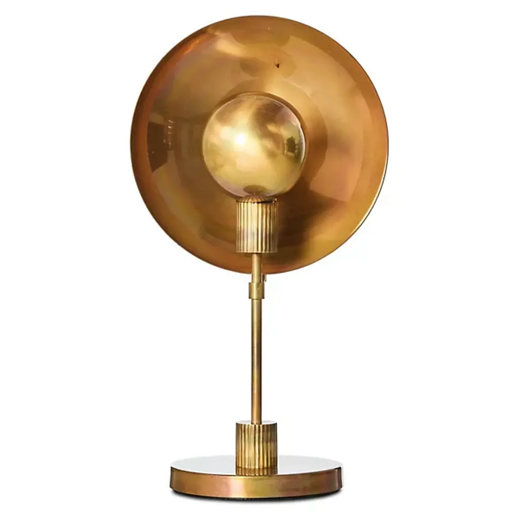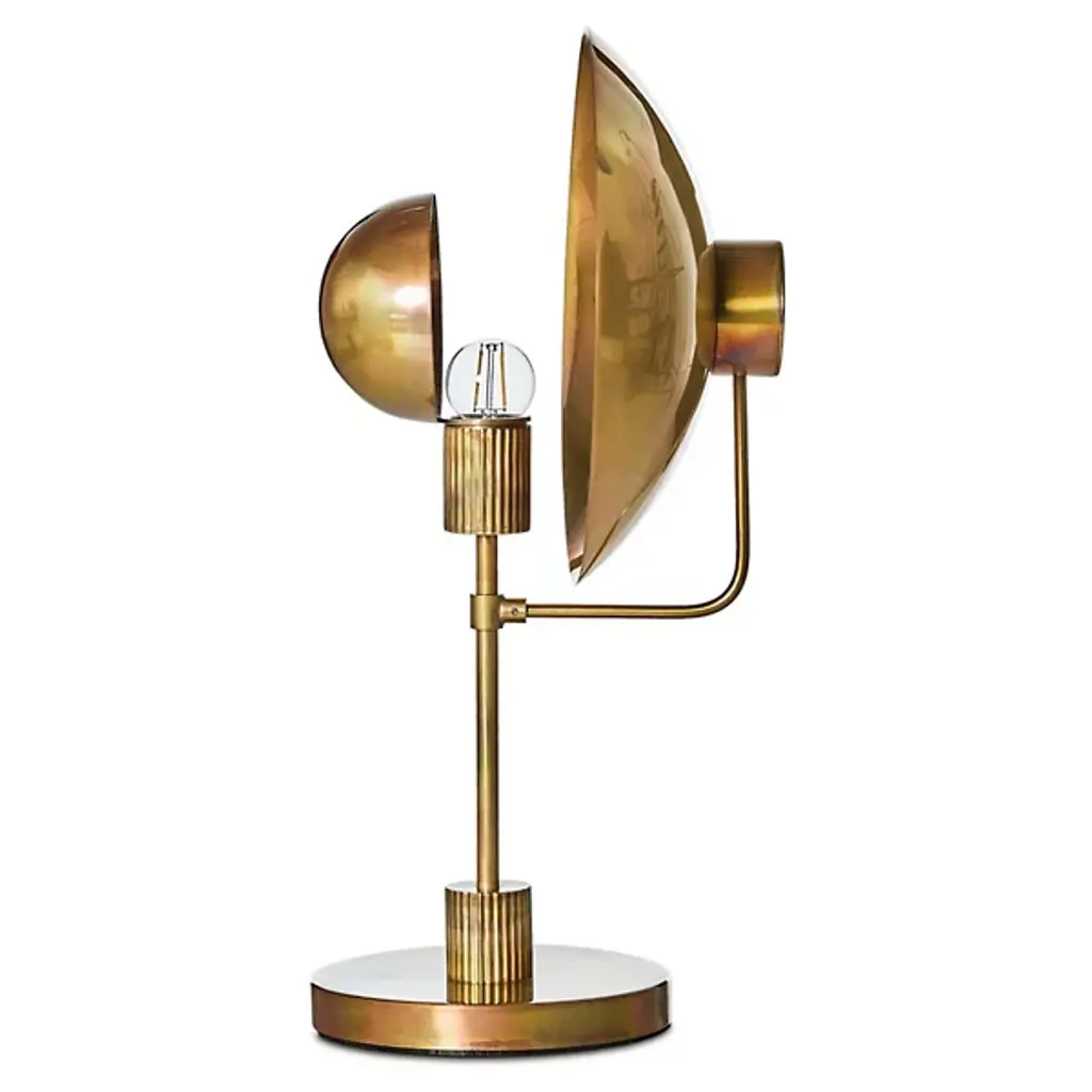 The Lund Table Lamp from Four Hands combines mid-century Scandinavian inspiration with artisanal craftsmanship. Its centerpiece is a large brass reflecting plate, hand-finished over an open flame to create a unique burnt patina that evolves beautifully over time. A fluted metal detail securely holds the bulb, adding texture and elegance to its design. This lamp blends vintage charm with contemporary sophistication, making it a timeless and refined addition to any space.