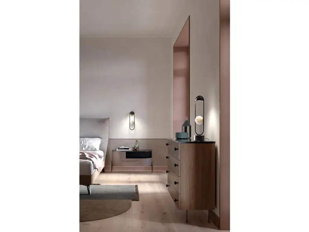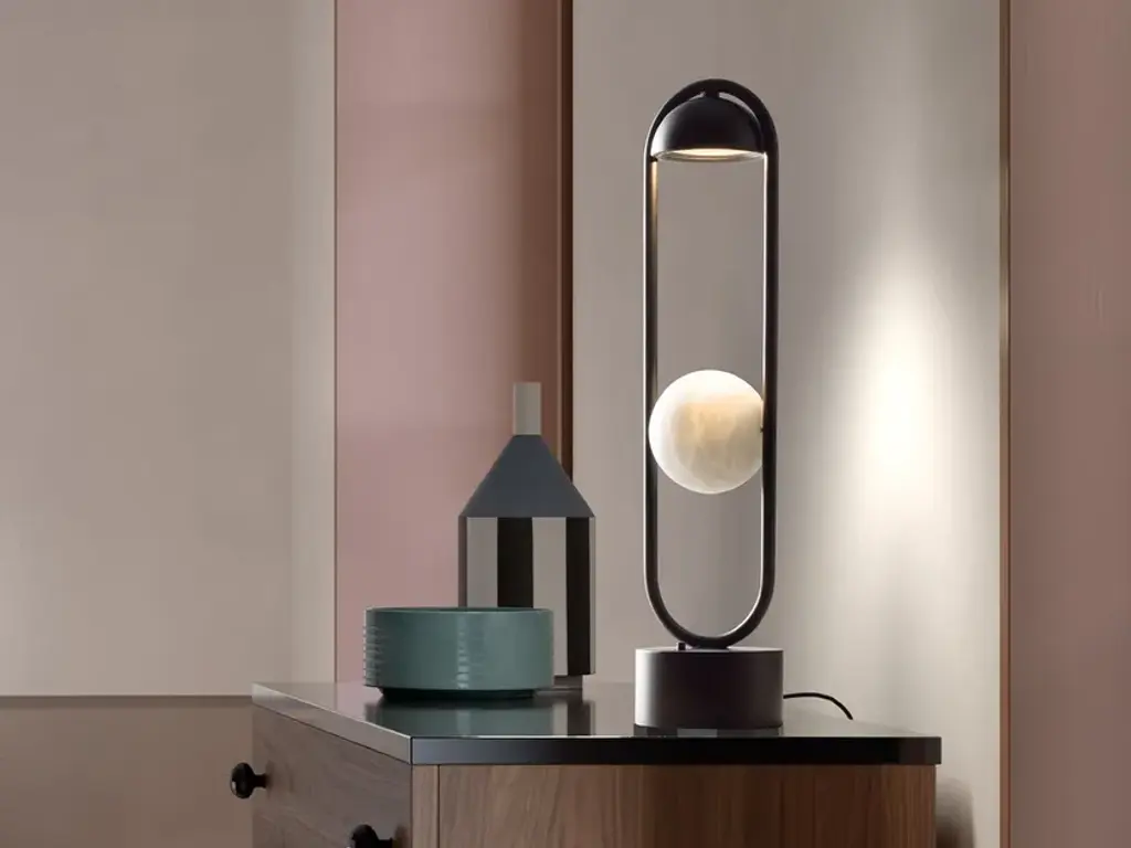 LUPPITER TL 1 11 SF is a table lamp with a painted metal frame and metal shade. The sphere is available in metal or alabaster. LED lighting.5 W CRI>90 3000 K – 526 NOMINAL LM5 W CRI>90 2700 K – 515 NOMINAL LMDIMMABLE: OWN BUTTONCE LEDETL LEDExtreme aesthetic cleanliness with chic details for the Luppiter family of suspension, wall, floor and table lamps, which Marco Zito designed inspired by the geometric shape of the ellipse, a recognisable and at the same time functional sign. The name Luppiter recalls a planet (Latin for 'father of Jupiter'), semantically associating the name of the family of lamps with the orbital shape of the structure that characterises it. The choice of materials, the precious decorative details in different colours and finishes, consolidate Masiero's identity and recognisability in the knowledge of metalworking. The ellipsoidal structure in matt black metal, the leit motif of the entire collection, integrates a small metal cap, placed on one of the frame's vertices (upper or lower depending on the model) and containing the LED light source. The orbit of the frame is enriched, depending on the type, by white alabaster or gold metal spheres, or by shiny decorative bell-shaped caps in gold-plated and brushed metal (with a white interior), which create a pleasant contrast with the stem with its essential lines. In detail, the suspensions are available with a frame in three heights and a small or large bell; the wall lamp, the floor lamp and the table version are characterised by an alabaster or metal sphere, the floor lamp and the table version are also available with a small bell cap. Thanks to the variety of shapes and finishes, Luppiter is a collection suitable for both residential decoration and use in contract settings, from hospitality to public spaces.