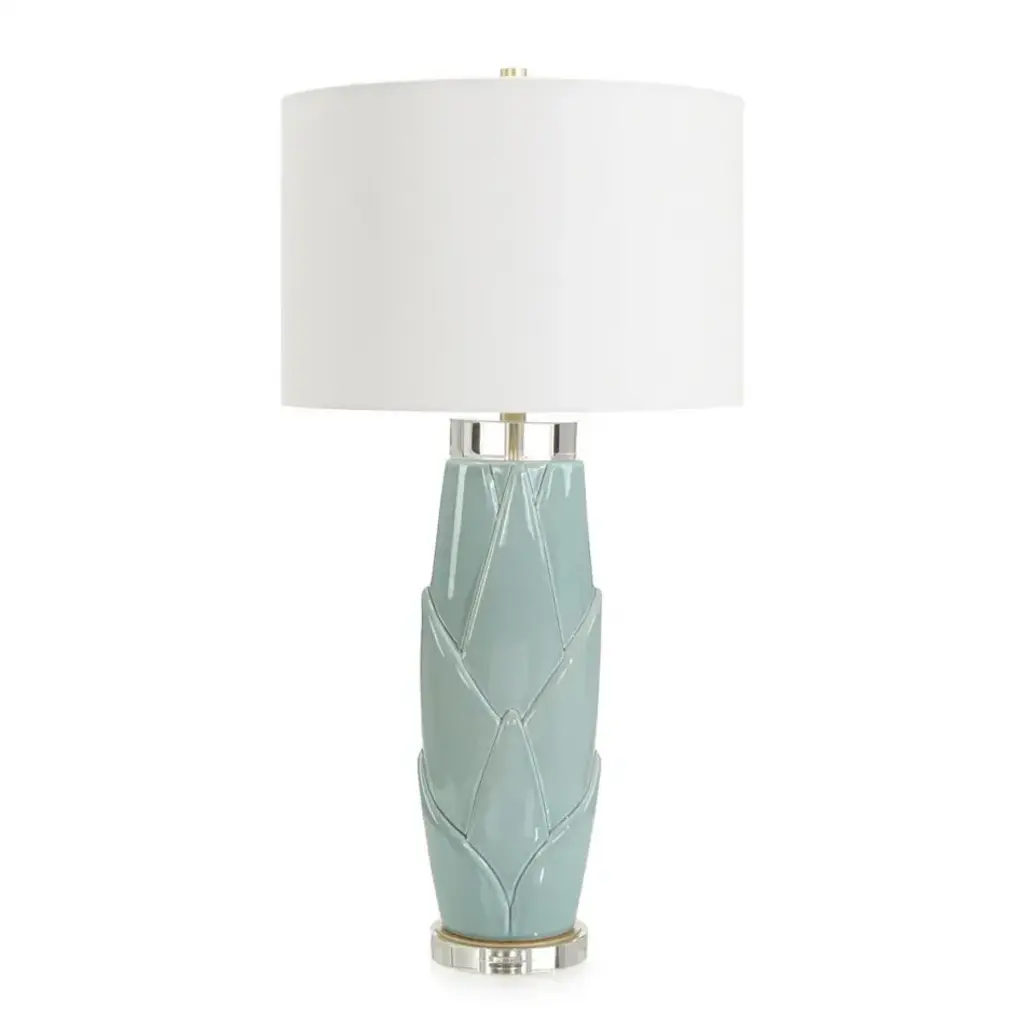 The Lush Leaves Table Lamp is a stunning marriage of natural motifs and contemporary design. The ceramic body features a gorgeous arrangement of leaves in an earthy green color. Rounded cuts of clear crystal are displayed from the base and neck, beautifully complementing the metal hardware and finial in a champagne finish. This three-way turnkey table lamp showcases an elegant, yet adaptable look that seamlessly blends with a variety of design styles.