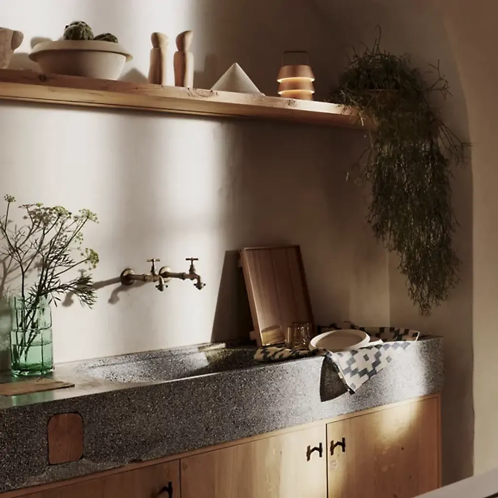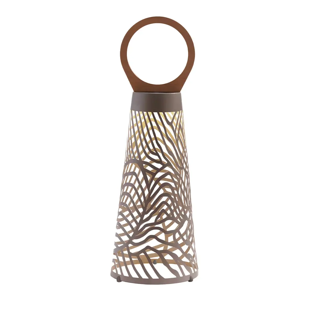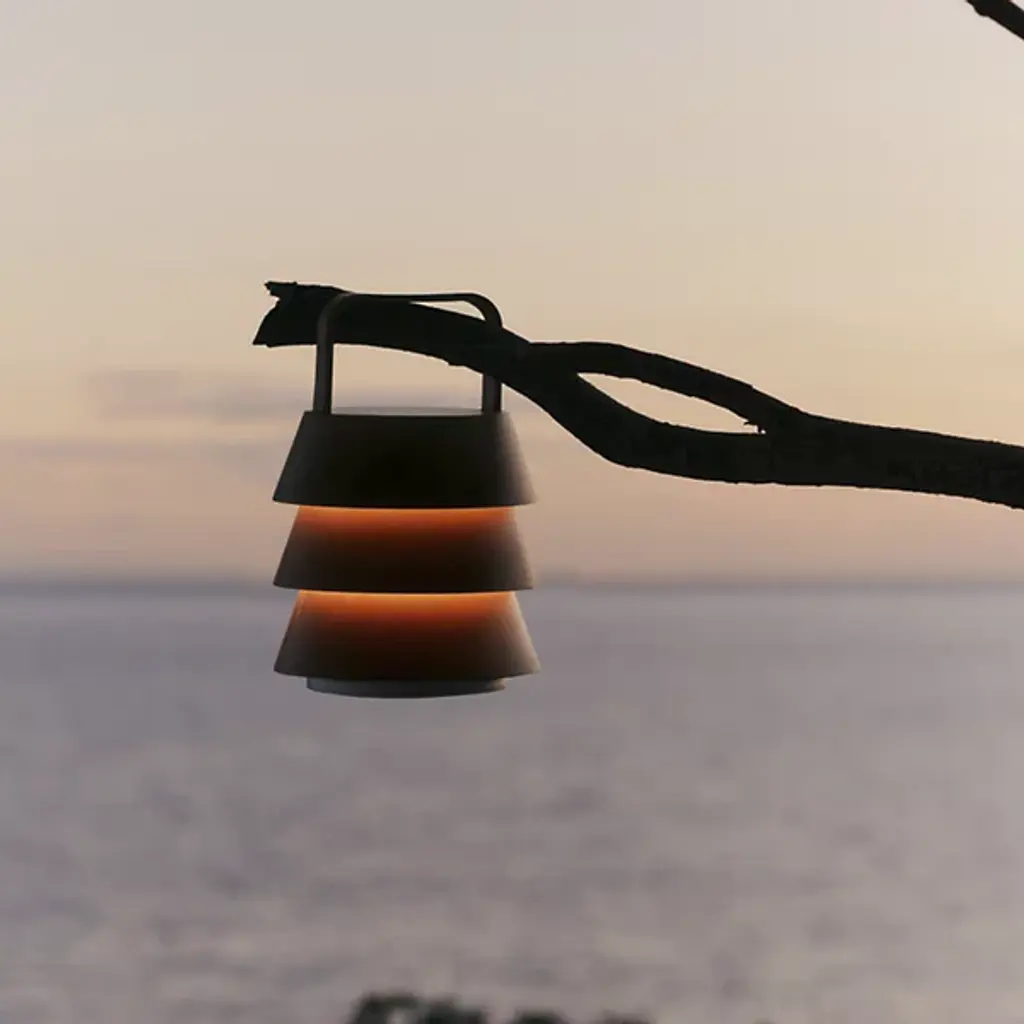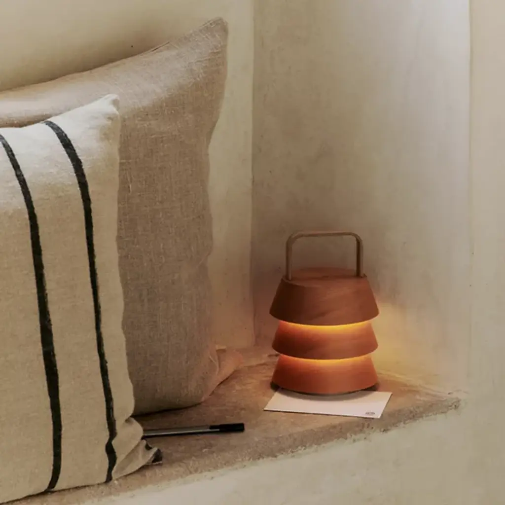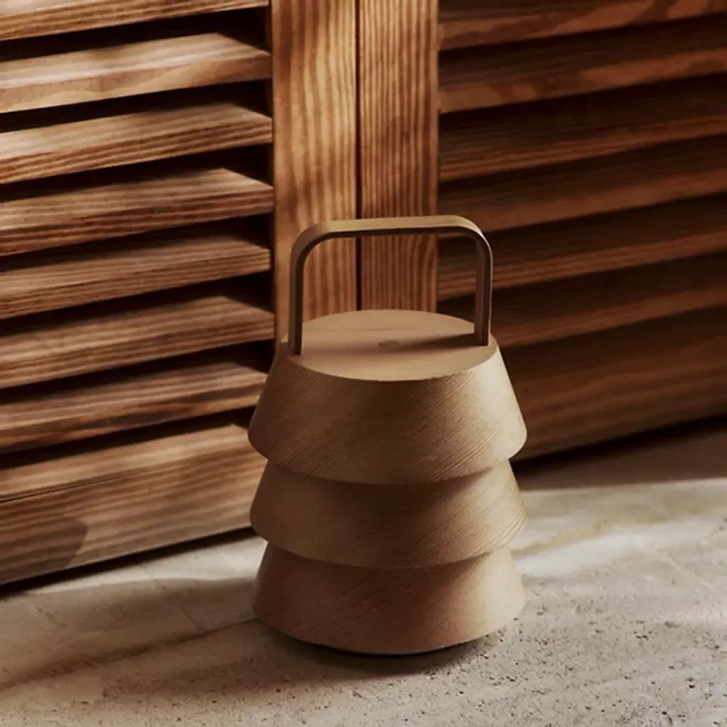 The Luver Rechargeable LED Table Lamp from ferm LIVING is both sculptural and portable. Ferm and designer Jørn Utzon blend natural elements and restrained design, creating a body of vertically stacked pieces of Douglas Fir with louvered edges inspired by his family's home in Mallorca. A rechargeable LED is tucked inside, reducing direct light with a High-Density Polyethylene diffuser, and is easily moved using a central single-piece wood handle bent using steam. The layered design and natural woodgrain focuses on the humanity involved in its design, while a touch dimmer precisely tailors the light emanating from it.