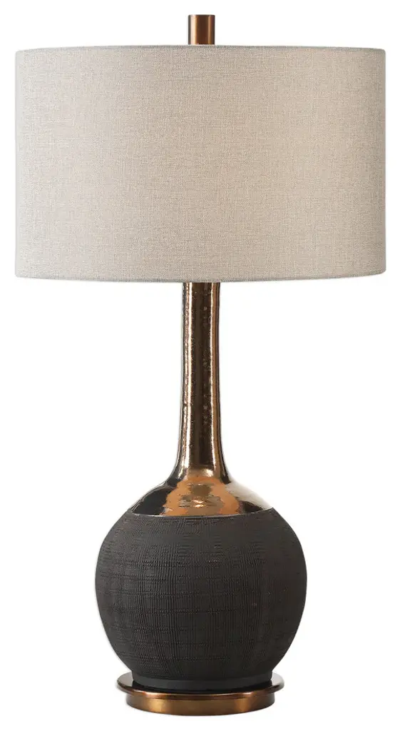 This Ceramic Base Features A Textured, Matte Black Hand-scored Body, Accented With A Metallic Gold Glazed Neck. The Round Hardback Drum Shade Is A Light Gray Linen Fabric.- 32"H Shade 11"H X 17" Dia- Premium Ceramic and Steel- UL Listed. Uses one max 150W Type A Bulb (not included). Three way switch.- Heirloom Quality - Expertly hand crafted and hand finished. Due to the hand crafted nature of this piece, each piece may have subtle differences.