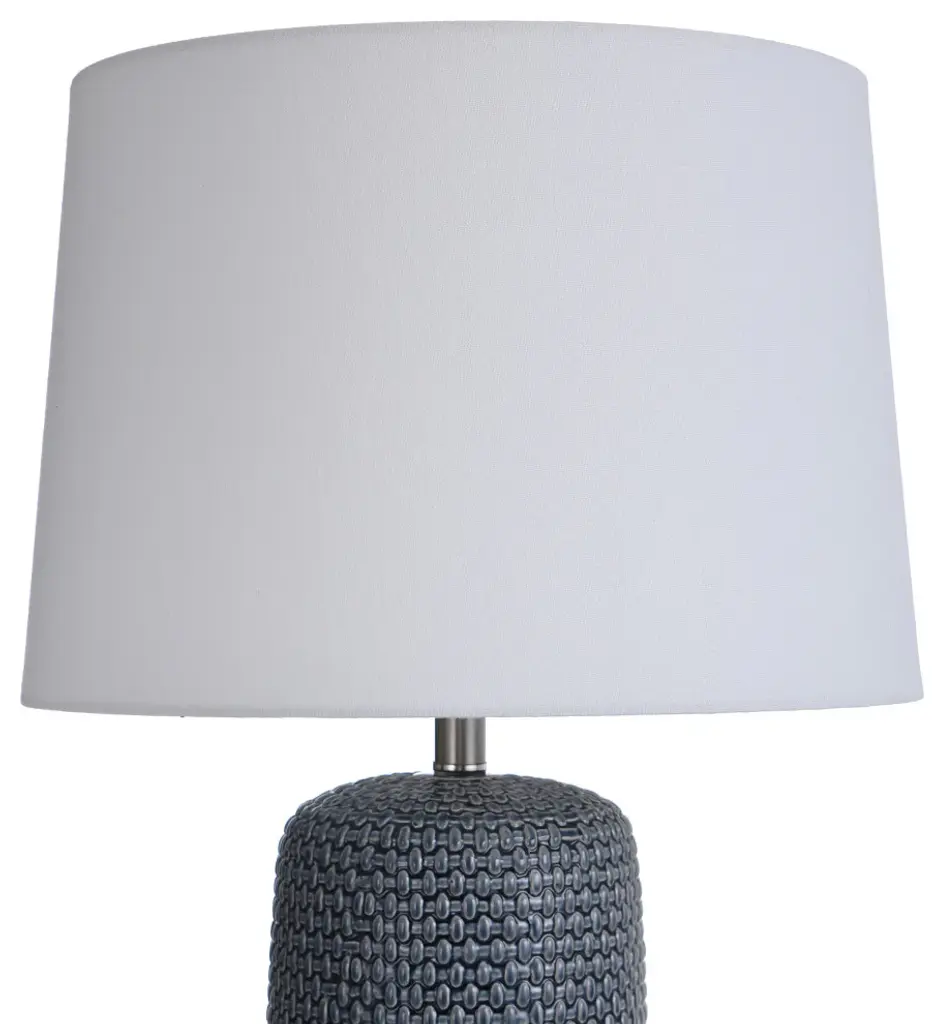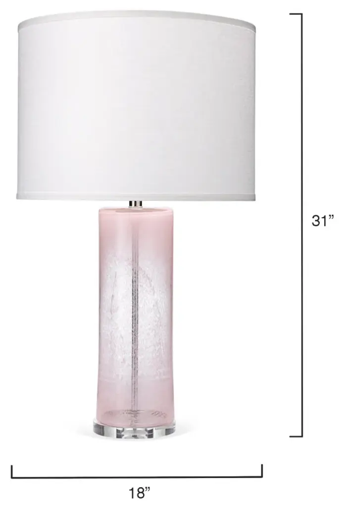Delicate points of color condense and disperse within this glass lamp creating a Monet-like diffusion of pastel pink.• 31"H x 18"dia Weighs 13 lbs.• Hand Finished Art Glass with White Linen Shade• UL Listed. Uses 1 max 150W standard Type A bulb (not included). 3 way socket. 96 inch cord.• Heirloom Quality - Expertly hand crafted and hand finished. Due to the hand crafted nature of this piece, each piece may have subtle differences.