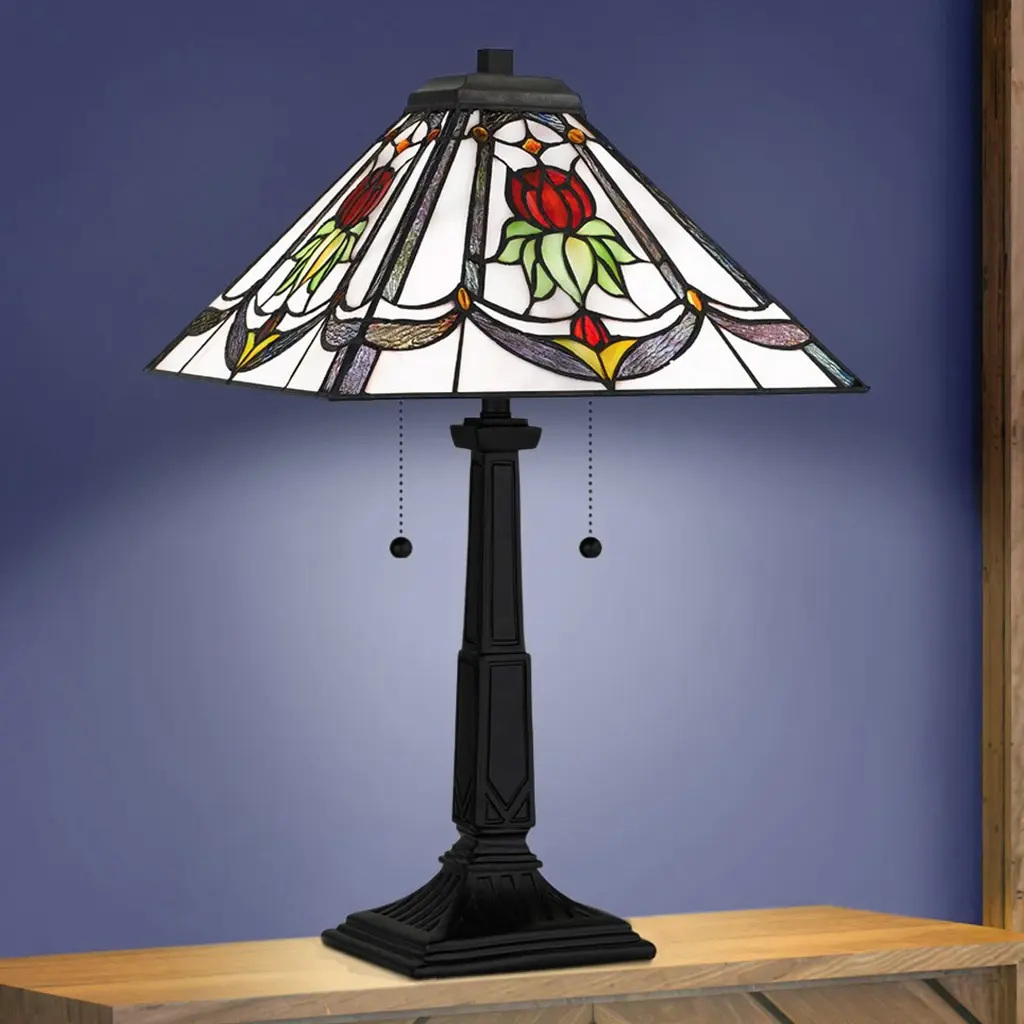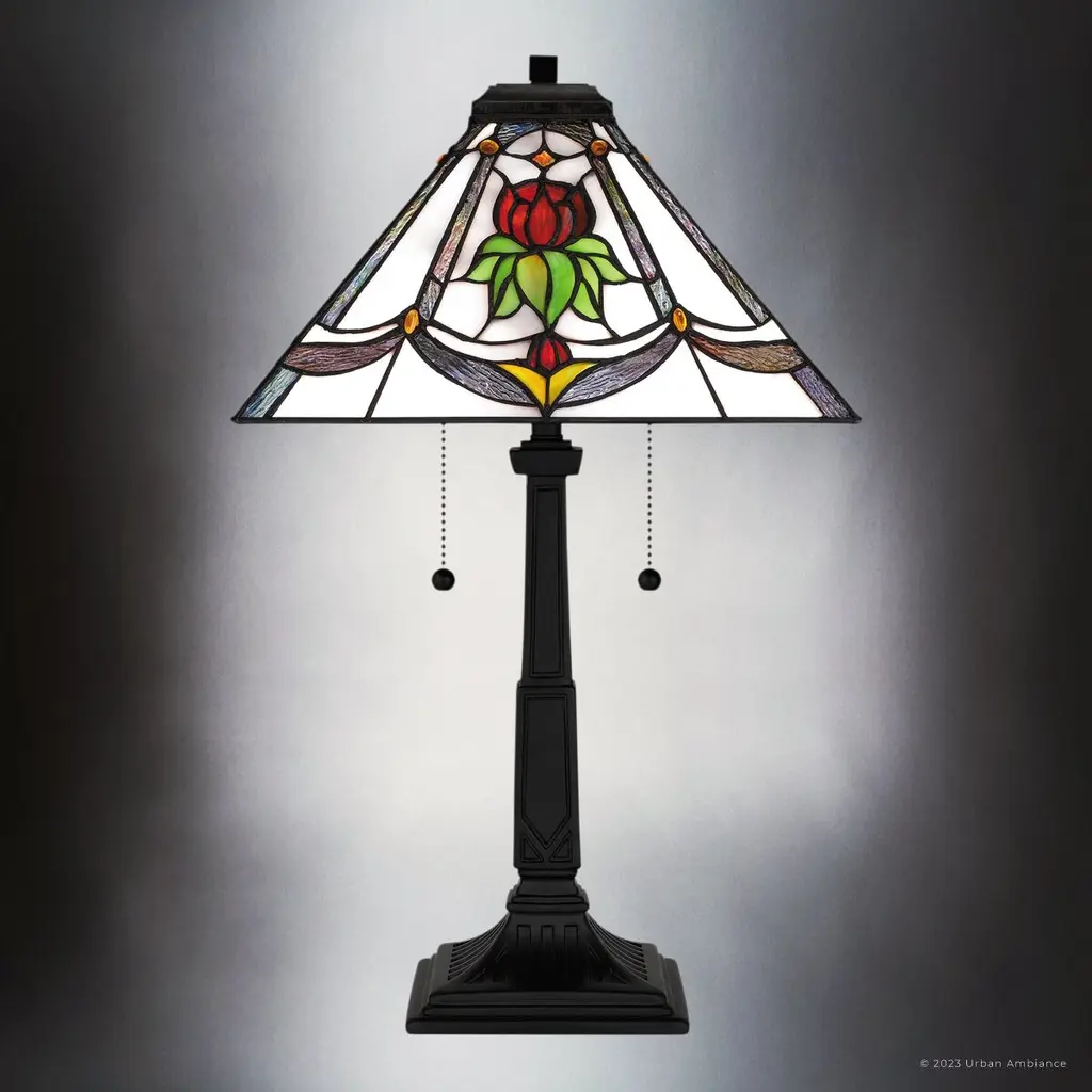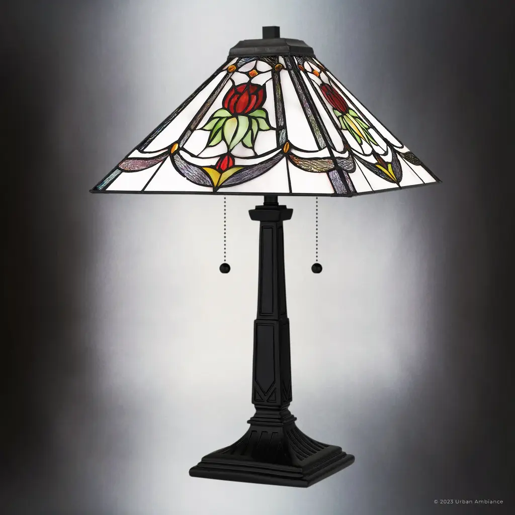 THE KESWICK COLLECTION:Elevate your living spaces with the Keswick table lamp, a charming blend of beauty and functionality. Featuring a delicate rose motif and multicolored art glass, this lamp effortlessly adds elegance to any room. Equipped with two pull chains for easy operation and a classic matte black base, it's perfect for bedrooms, kitchens, or home offices. The handcrafted Tiffany glass shade is a unique work of art, making the Keswick table lamp a stylish and functional addition to your living spaces.Infuse your space with the romantic charm of the Gabrielle table lamp, featuring a Tiffany glass shade with a lovely rose motif and a spectrum of colors against a predominantly white background. This lamp, with its matte black base and easy-to-use pull chains, fits beautifully on a bedside table, a kitchen countertop, or a home office desk, enhancing decor with its vintage allure. Ideal for Victorian, shabby chic, or country-style interiors, it offers both enchanting aesthetics and practical illumination.PRODUCT INFORMATION:MODEL NUMBER: BWQ7016, UQL7016PRODUCT COLLECTION: KeswickINSTALL LOCATION: IndoorFIXTURE TYPE: Table LampOVERALL DIMENSIONS: 23''H x 14''W x 14''DBASE DIMENSIONS: 14.5''H x 5.625''WSHADE DIMENSIONS: 7.5''H x 14''WSHADE DESCRIPTION: Multicolor Art GlassSHADE BACKING: Soldered Glass (Hard)SHADE LINER: NoneHARP/SPIDER: Base StemLAMP WEIGHT (IN LBS): 10.38 lbsLOCATION RATING: PortableABOUT THE DESIGN:DESIGN FEATURES: Organic FormsSHADE CHARACTERISTICS: Metal Cross Hatch, Organic FormsFIXTURE FORM/SHAPES: Corinthian, LinearSHADE FORM/SHAPES: Square, TriangularBASE COLORS: N/ASHADE COLORS: N/AELECTRICAL:LAMP TYPE: SocketSWITCH TYPE: On-Off, Pull ChainNUMBER OF BULBS: Two (2), Medium - E26, 75W (Not Included)RECOMMENDED BULB SHAPE: A19VOLTAGE: 110/120 VCOMPATIBILITY: LED and Dimmable BulbsPOWER CORD LENGTH: 96"POWER CORD COLOR: BlackSTYLE INFLUENCES:GLAM: Luxurious and dramatic, with bold colors, metallics, and plush fabrics, emphasizing opulence and comfort.POSH: Exudes luxury and sophistication, often incorporating high-end materials, elegant furniture, and glamorous details.VINTAGE: Embraces nostalgia, incorporating antique and retro pieces for a timeless appeal.TRADITIONAL: Time-honored decor with rich fabrics, classic lines, and detailed craftsmanship.PRODUCT TAGS: lighting lite fixture corded dimmer led hall dining bedroom living room livingroom office matching decorative designer beautiful nice high end good great pretty gorgeous handsome quality unique