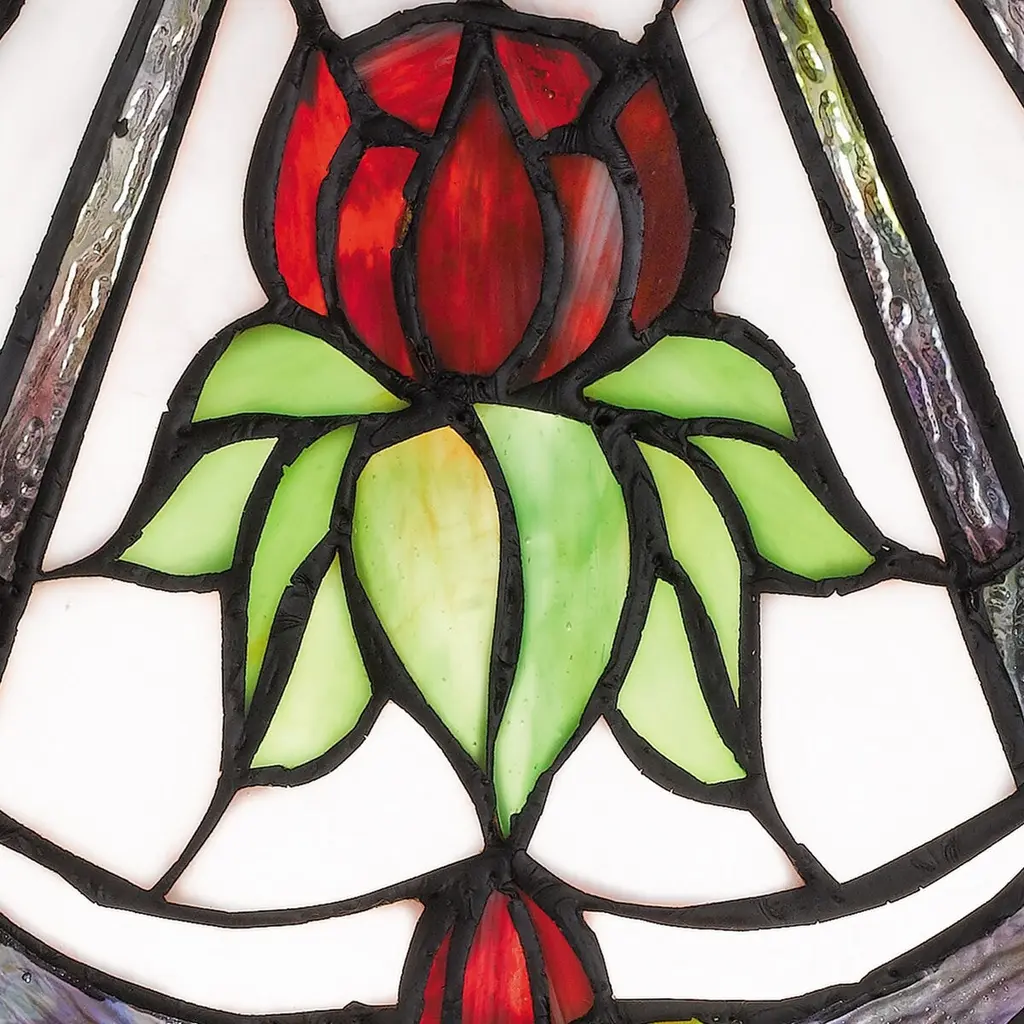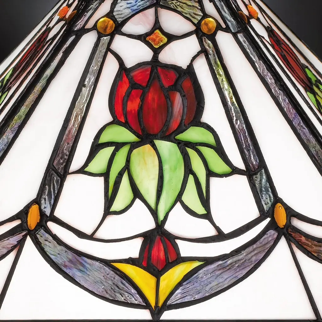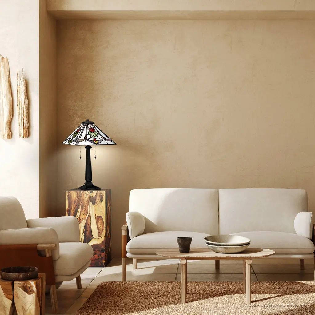 THE KESWICK COLLECTION:Elevate your living spaces with the Keswick table lamp, a charming blend of beauty and functionality. Featuring a delicate rose motif and multicolored art glass, this lamp effortlessly adds elegance to any room. Equipped with two pull chains for easy operation and a classic matte black base, it's perfect for bedrooms, kitchens, or home offices. The handcrafted Tiffany glass shade is a unique work of art, making the Keswick table lamp a stylish and functional addition to your living spaces.Infuse your space with the romantic charm of the Gabrielle table lamp, featuring a Tiffany glass shade with a lovely rose motif and a spectrum of colors against a predominantly white background. This lamp, with its matte black base and easy-to-use pull chains, fits beautifully on a bedside table, a kitchen countertop, or a home office desk, enhancing decor with its vintage allure. Ideal for Victorian, shabby chic, or country-style interiors, it offers both enchanting aesthetics and practical illumination.PRODUCT INFORMATION:MODEL NUMBER: BWQ7016, UQL7016PRODUCT COLLECTION: KeswickINSTALL LOCATION: IndoorFIXTURE TYPE: Table LampOVERALL DIMENSIONS: 23''H x 14''W x 14''DBASE DIMENSIONS: 14.5''H x 5.625''WSHADE DIMENSIONS: 7.5''H x 14''WSHADE DESCRIPTION: Multicolor Art GlassSHADE BACKING: Soldered Glass (Hard)SHADE LINER: NoneHARP/SPIDER: Base StemLAMP WEIGHT (IN LBS): 10.38 lbsLOCATION RATING: PortableABOUT THE DESIGN:DESIGN FEATURES: Organic FormsSHADE CHARACTERISTICS: Metal Cross Hatch, Organic FormsFIXTURE FORM/SHAPES: Corinthian, LinearSHADE FORM/SHAPES: Square, TriangularBASE COLORS: N/ASHADE COLORS: N/AELECTRICAL:LAMP TYPE: SocketSWITCH TYPE: On-Off, Pull ChainNUMBER OF BULBS: Two (2), Medium - E26, 75W (Not Included)RECOMMENDED BULB SHAPE: A19VOLTAGE: 110/120 VCOMPATIBILITY: LED and Dimmable BulbsPOWER CORD LENGTH: 96"POWER CORD COLOR: BlackSTYLE INFLUENCES:GLAM: Luxurious and dramatic, with bold colors, metallics, and plush fabrics, emphasizing opulence and comfort.POSH: Exudes luxury and sophistication, often incorporating high-end materials, elegant furniture, and glamorous details.VINTAGE: Embraces nostalgia, incorporating antique and retro pieces for a timeless appeal.TRADITIONAL: Time-honored decor with rich fabrics, classic lines, and detailed craftsmanship.PRODUCT TAGS: lighting lite fixture corded dimmer led hall dining bedroom living room livingroom office matching decorative designer beautiful nice high end good great pretty gorgeous handsome quality unique