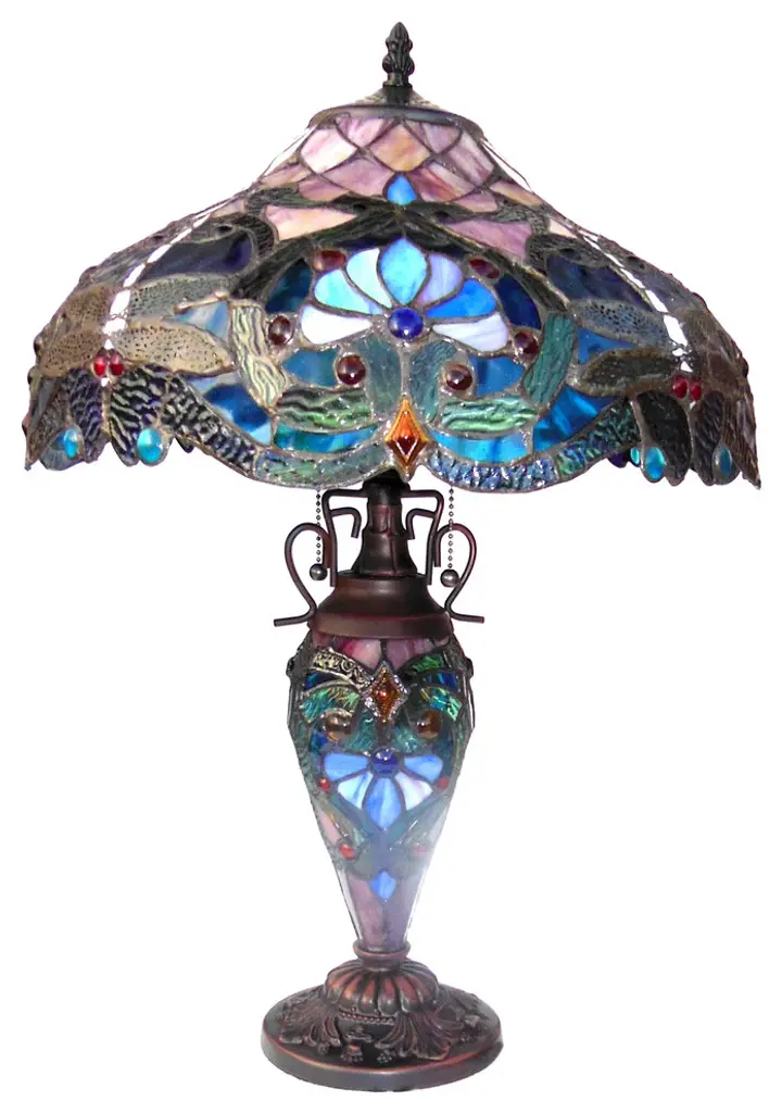 LYDIA, Victorian is handcrafted with pure stained glass, with gem tone, soft pedestals, as well as the Victorian motif. The warm color glow of the stained glass will create warmth to your home. With this table lamp you can make a soft romantic glow by using just the mid-section.(2) 60 Watt max E26 Type A Bulb + 1-Max 15 Watt E12 Type C Bulb (Type A bulb not included) Pull chain & on-cord rotary switch572pcs glass cut, 82 cabochonsDownlightIndoor SettingHarmonized code: 940520Since these are hand crafted products, the exact color of glass pieces may vary. Colors of the glass will appear darker and less vibrant when not illuminated. Handmade glass will vary from one piece to the other; glass made at different times will also vary. Light bulbs used in lamps or ambient lighting may affect the appearance of the products. Stained glass product has been protected with mineral oil as part of the finishing process. Please use a soft dry cloth to remove any excess oil.