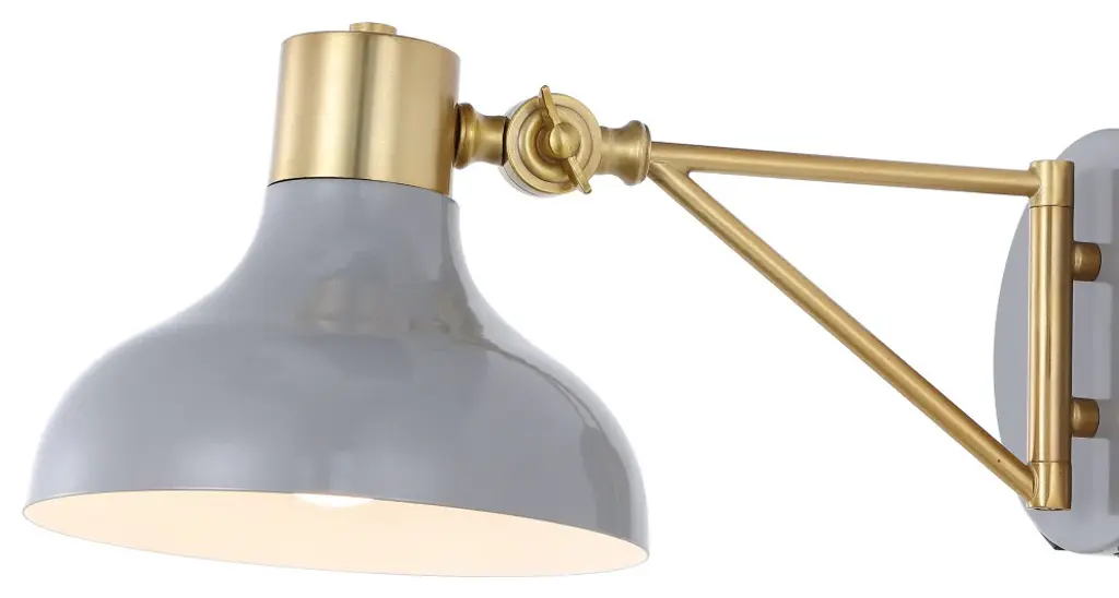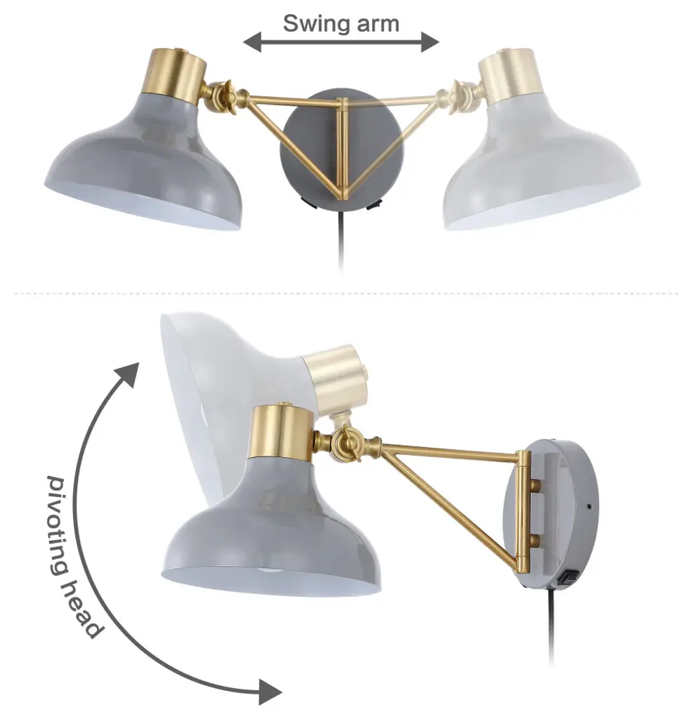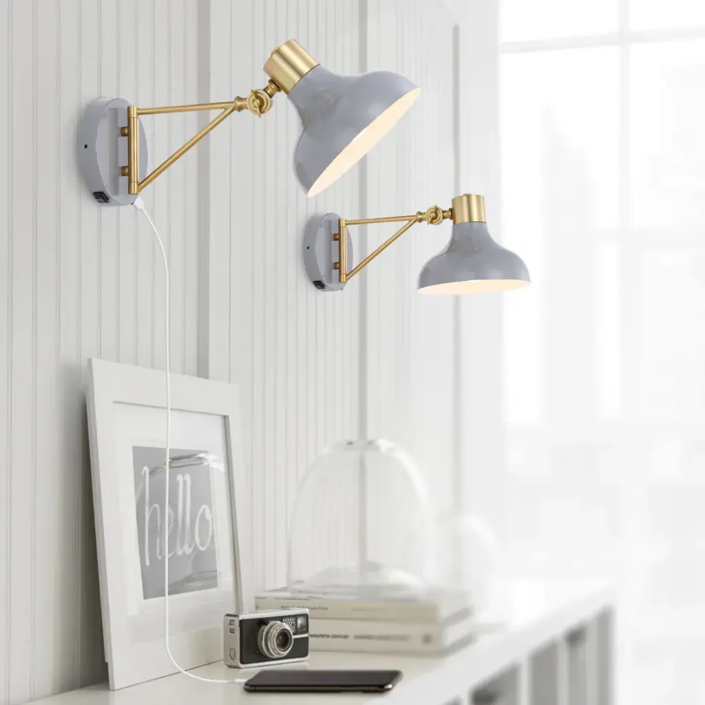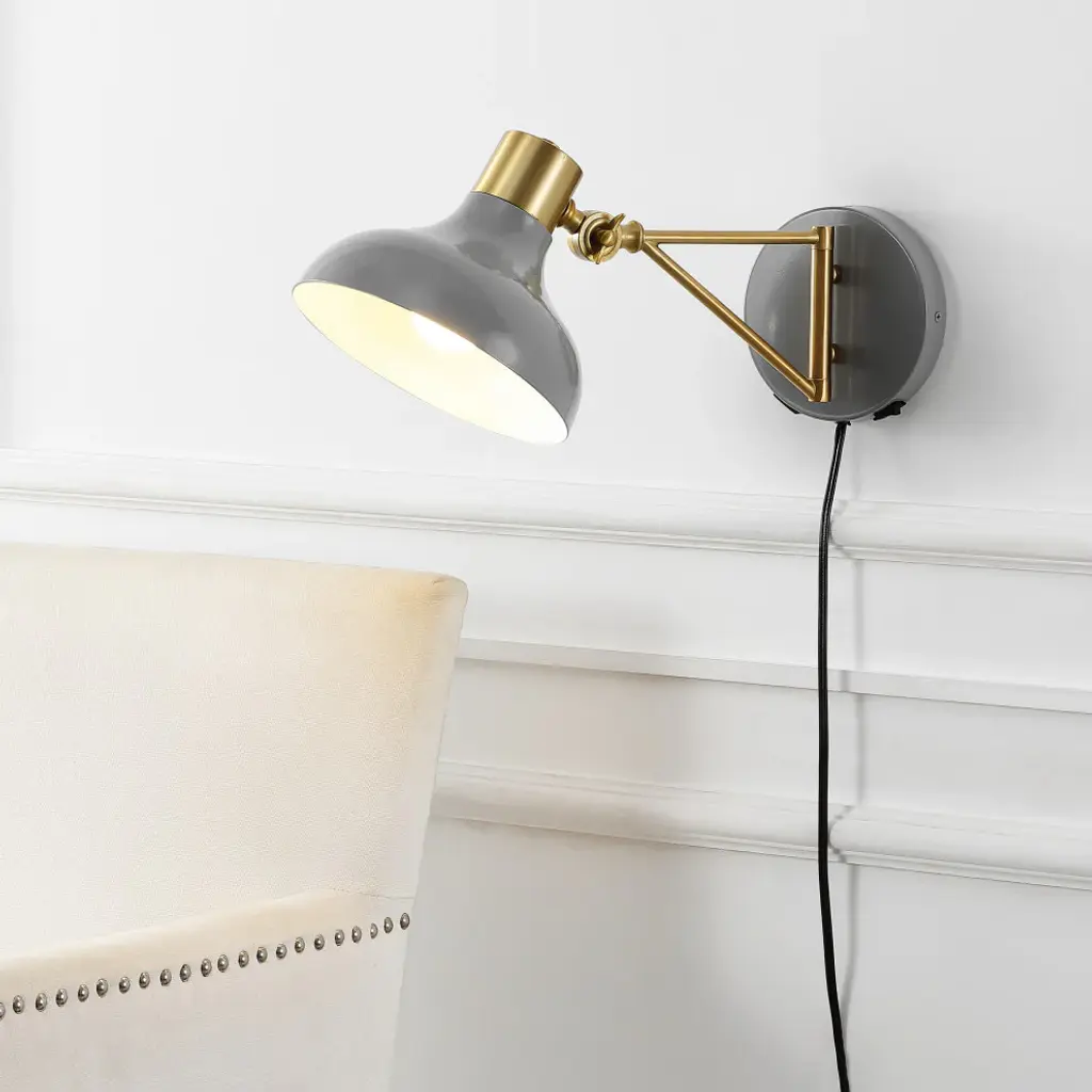 Upgrade your bedroom''s minimalist style with our modern gray wall light. Brass-gold fittings add a touch of warmth, and a handy USB outlet makes bedside charging easy. A pair of these wall lights is the perfect solution for a small master bedroom, kids room, guest room or home office - they''re great for hospitality projects too.-This wall light''s timeless design is perfect for modern and traditional interiors, especially guest rooms and resort rentals-Quality touches include a metal shade, USB charging port and an elegant silk-wrapped cord-Takes 1 bulb and compatible with 9W LED or 60W TYPE "A" or 13W CFL-Eco-friendly 9W LED bulb included-Takes 1 bulb and compatible with TYPE "A" 60W or CFL 13W or LED 9W-Color Temperature: 2700K-CRI: 80-Color: Brass Gold with grey shade-Body Material: Metal-----Includes: One (1) lamp-Assembly Required-Lamp: 7 inches high x 8 inches wide x 15 inches deep-Shade: 4.5 inches high x 8 inches wide x 8 inches deepYou see a lamp.We see a decorative work of art.A perfectly curved shade casts a dramatic shadow on a floor. Compatible with LED lightbulbs: as easy on the environment as they are on the eyes. The JONATHAN Y Lighting collection considers every detail from impeccably sourced materials to designer styling. And our prices are so attractive, we''ve transformed a functional necessity into a fashion accessory.JONATHAN Y Lighting - a fashion revolution in home decor.