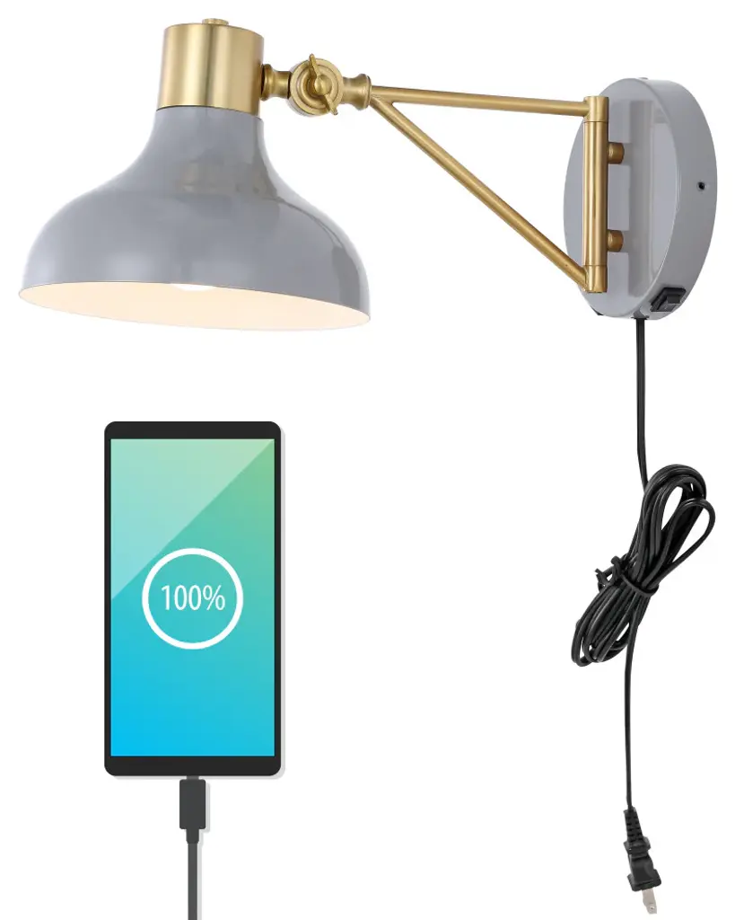 Lynn Swing Arm 1-Light Modern Midcentury Iron Usb Charging Port Led Sconce, Gray
